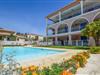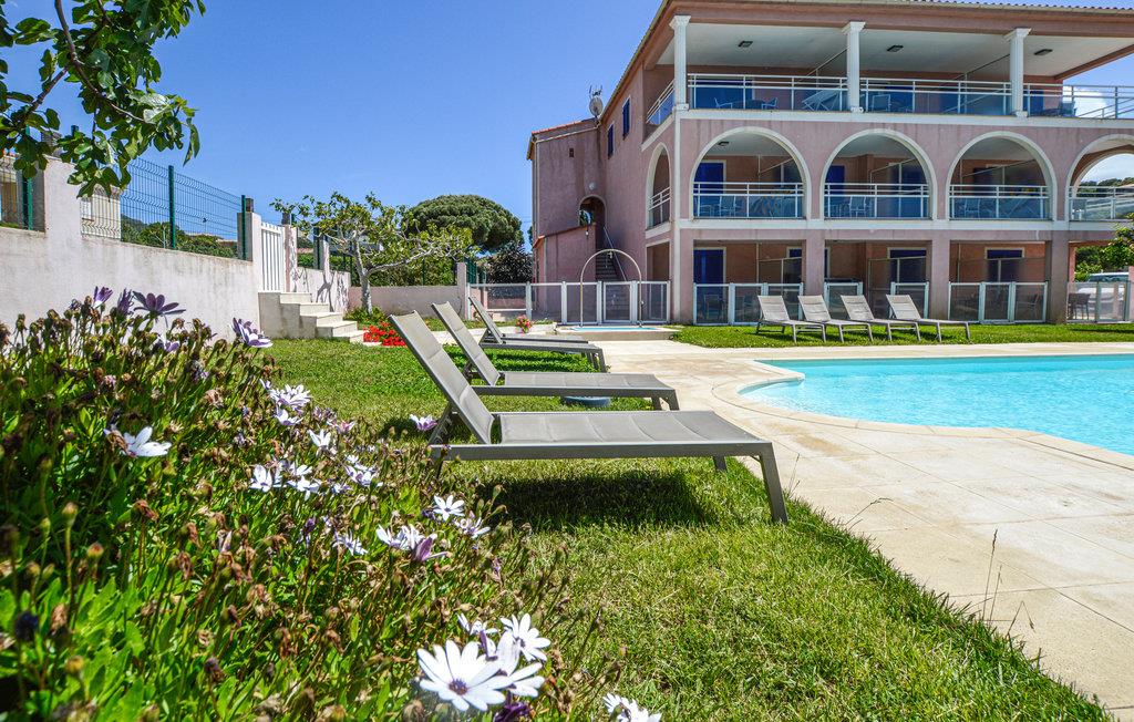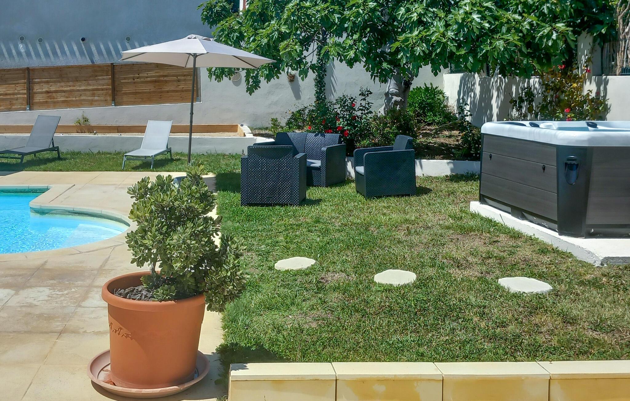Nyd solen i komfortable liggestole og slap af på den overdækkede terrasse. Den delte pool tilbyder nedkøling og badesjov.