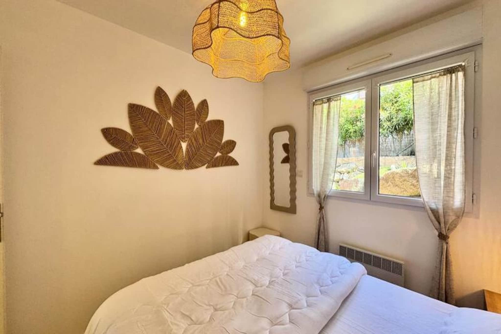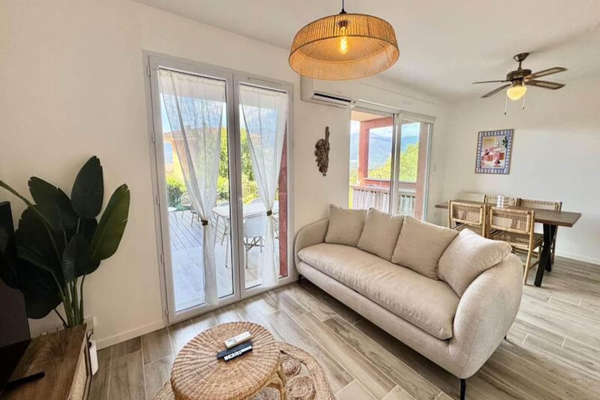 Højt over Proprianos glitrende kystlinje tilbyder denne stilfulde lejlighed et roligt tilflugtssted kun få minutter fra sandstrande og livlige lokale butikker. Her sætter den blide middelhavsbrise og glimt af havet fra din private terrasse tonen for en afslappende ferie i hjertet af Korsikas charme. Uanset om du søger ro eller eventyr, er dette moderne paradis perfekt placeret til at levere begge dele. \n\nTræd indenfor og oplev et gennemtænkt designet rum, hvor komfort møder elegance. Det åbne køkken, fuldt udstyret med moderne apparater, flyder problemfrit over i en hyggelig opholdsstue med en sovesofa og en spiseplads. Soveværelset, der er udsmykket med en blød 160 cm dobbeltseng, lover afslappende nætter, mens det elegante badeværelse tilføjer et strejf af luksus til dit ophold. Udenfor inviterer den møblerede terrasse dig til at nyde måltider tilberedt under åben himmel på stegepladen eller i sommerkøkkenet, alt imens du nyder de bløde farver fra middelhavssolnedgangen. \n\nBekvemmelighed er nøglen, med faciliteter som aircondition, fiberoptisk Wi-Fi og et tv udstyret med Netflix og større kanaler, der sikrer en problemfri oplevelse. En dedikeret parkeringsplads bidrager til at gøre dit ophold endnu nemmere, mens sengelinned og rengøring efter afrejse sikrer ultimativ komfort. \n\nDenne lejlighed ligger kun en kort køretur fra Proprianos travle marina, naturskønne vandrestier og kulturelle vartegn og er din indgang til at opdage Korsikas naturlige skønhed og rige kulturarv. Uanset om du udforsker øens barske klipper eller forkæler dig selv med dens kulinariske lækkerier, tilbyder denne ejendom den perfekte base for uforglemmelige minder.