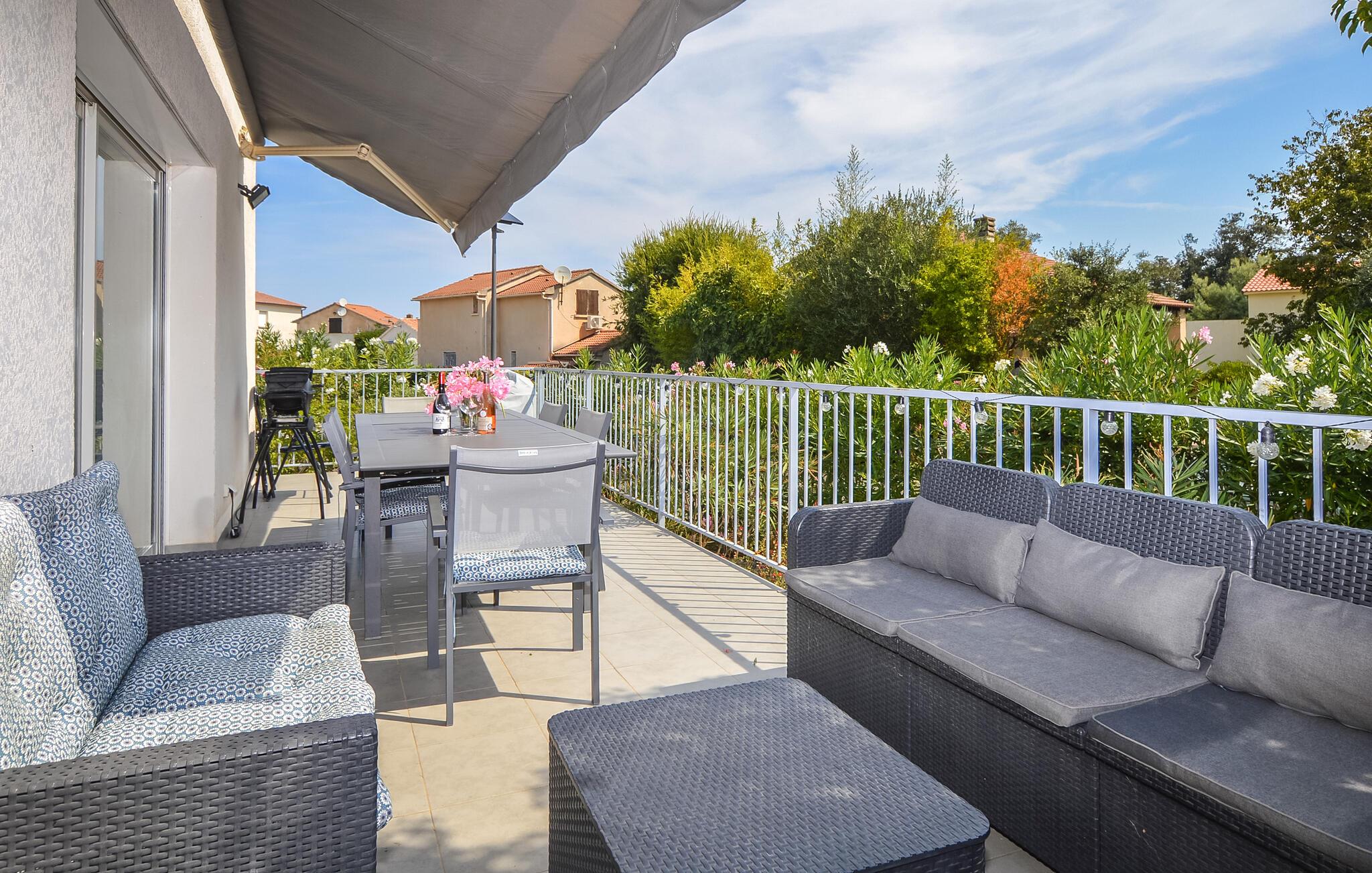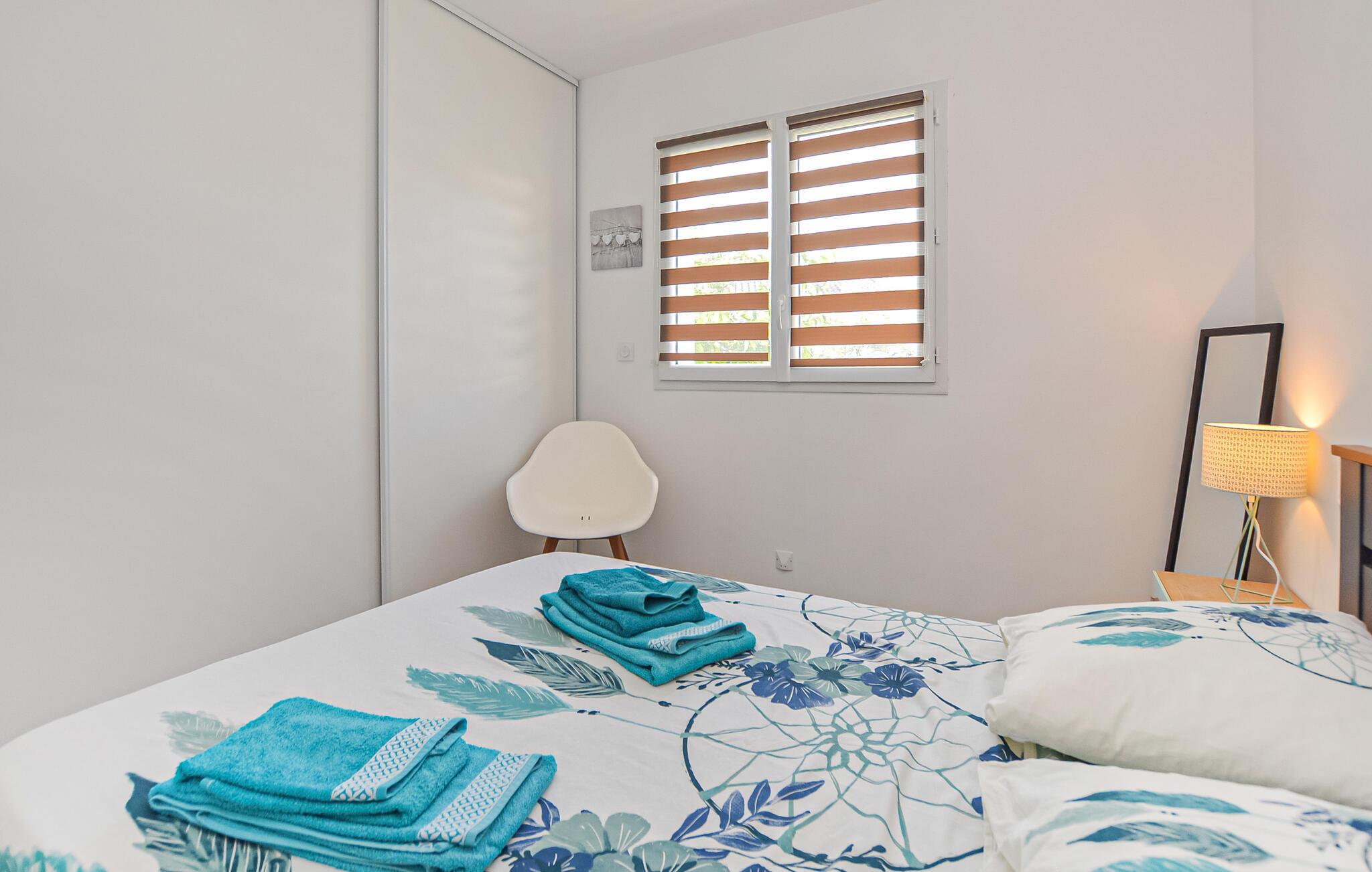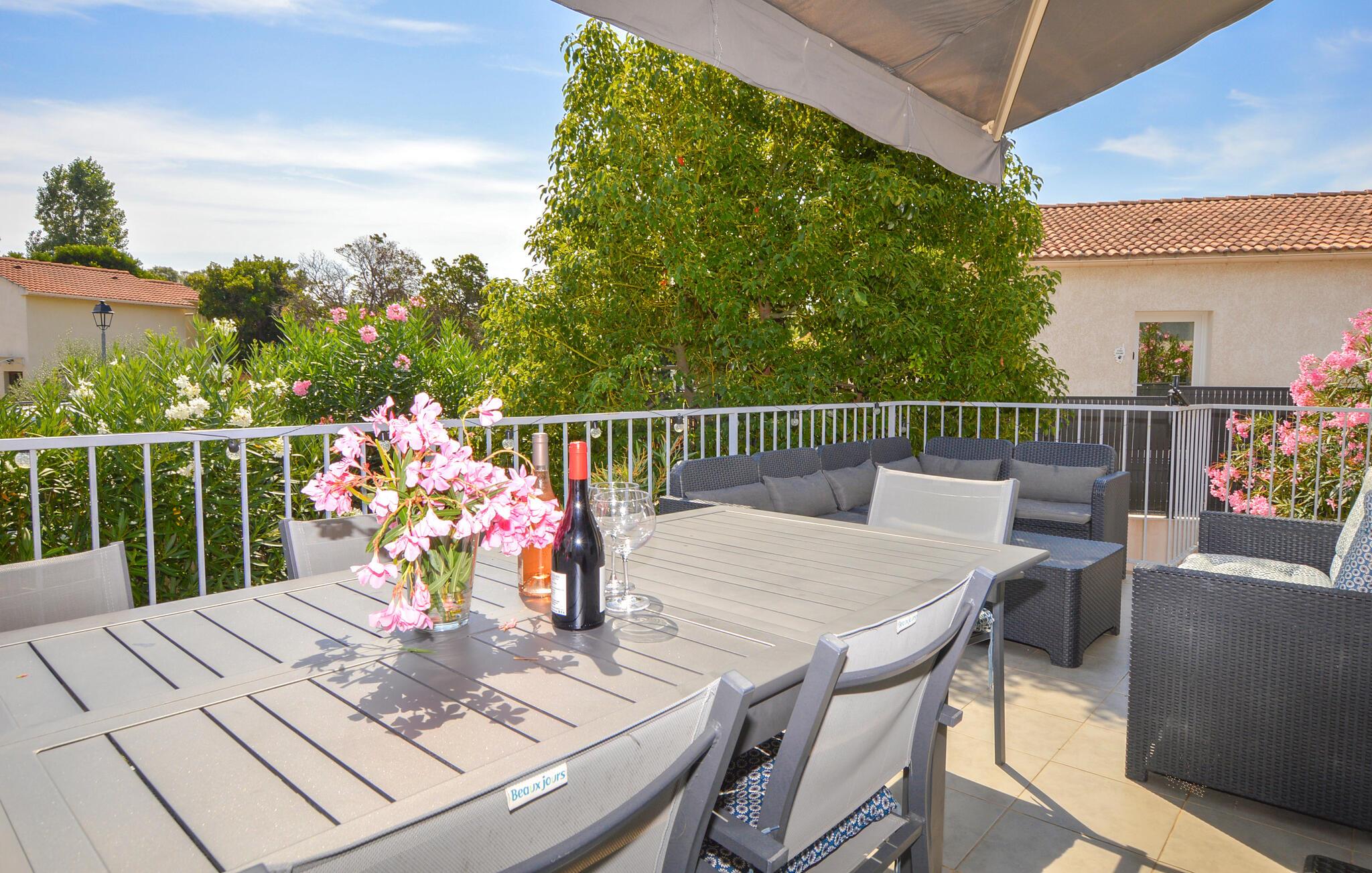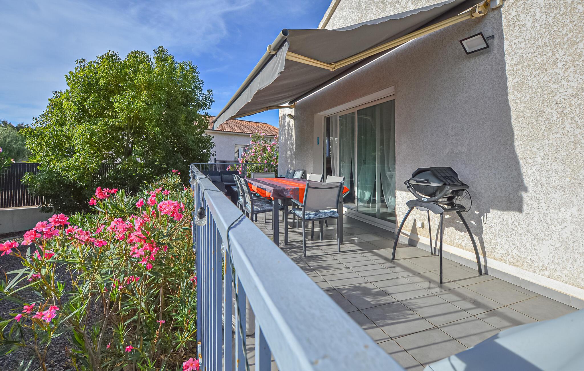 Tilbring solrige dage i dette moderne feriehus med adgang til pool.