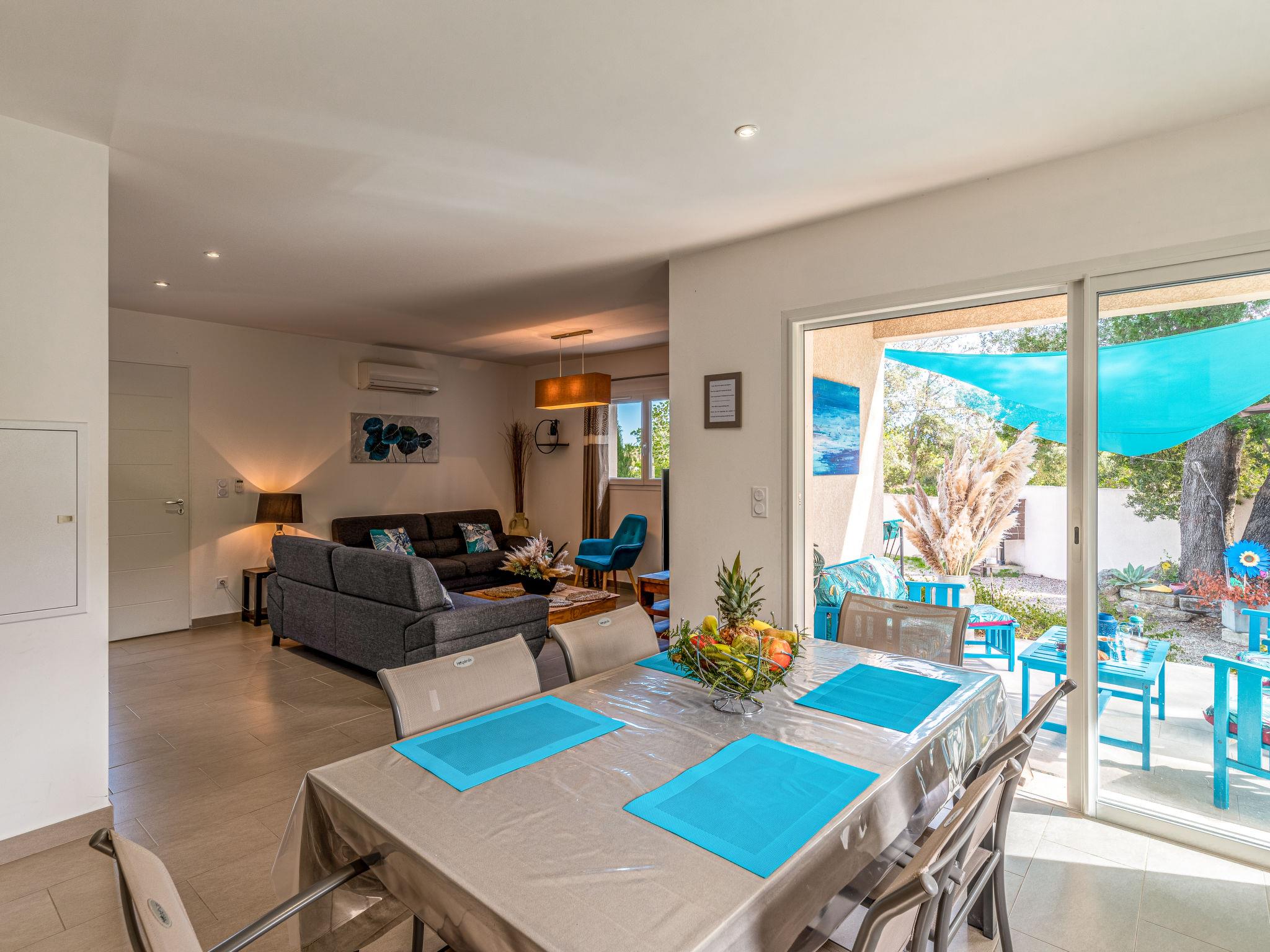 "Defendini", 4-room house 82 m2. Bright, comfortable and beautiful furnishings: living/dining room with dining table and satellite TV. Exit to the terrace. 2 rooms, each room with 1 french bed. 1 room with 2 beds. Open kitchen (oven, dishwasher, 3 ceramic glass hob hotplates, toaster, kettle, microwave, freezer, electric coffee machine). Shower/WC, sep. WC. Electric heating, air-conditioning. Terrace roofed terrace partly roofed, porch. Terrace furniture, barbecue, deck chairs (4). Facilities: washing machine, iron, children's high chair, baby cot for up to 2 year olds. Internet (WiFi, free). Parking (fenced 2 cars). Please note: non-smoking house.