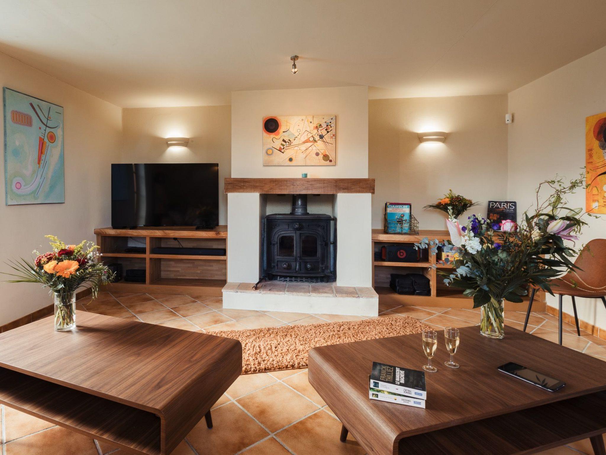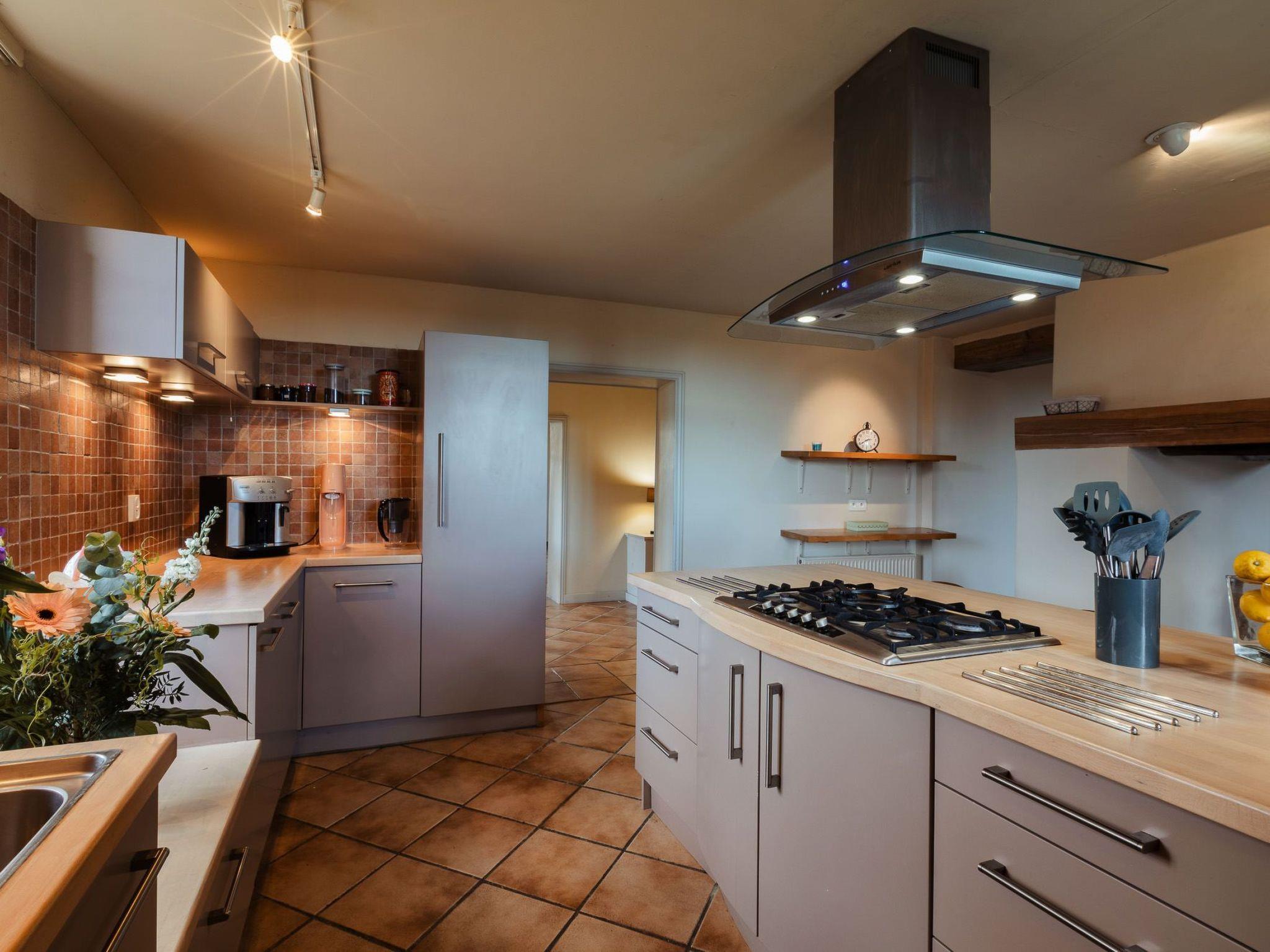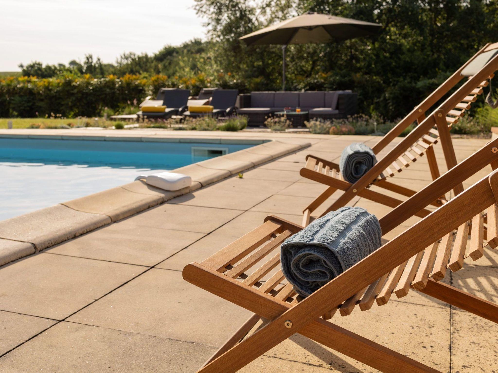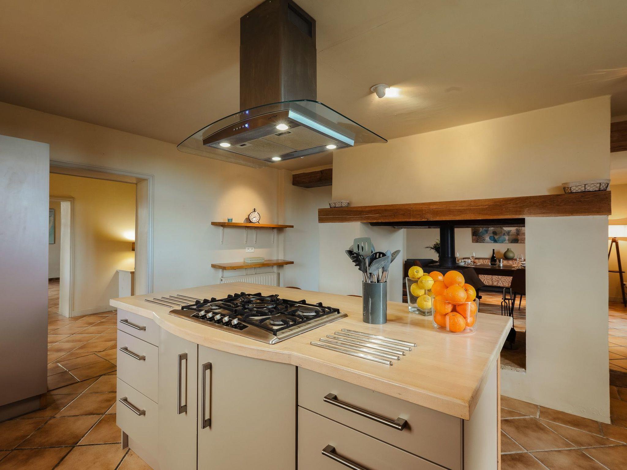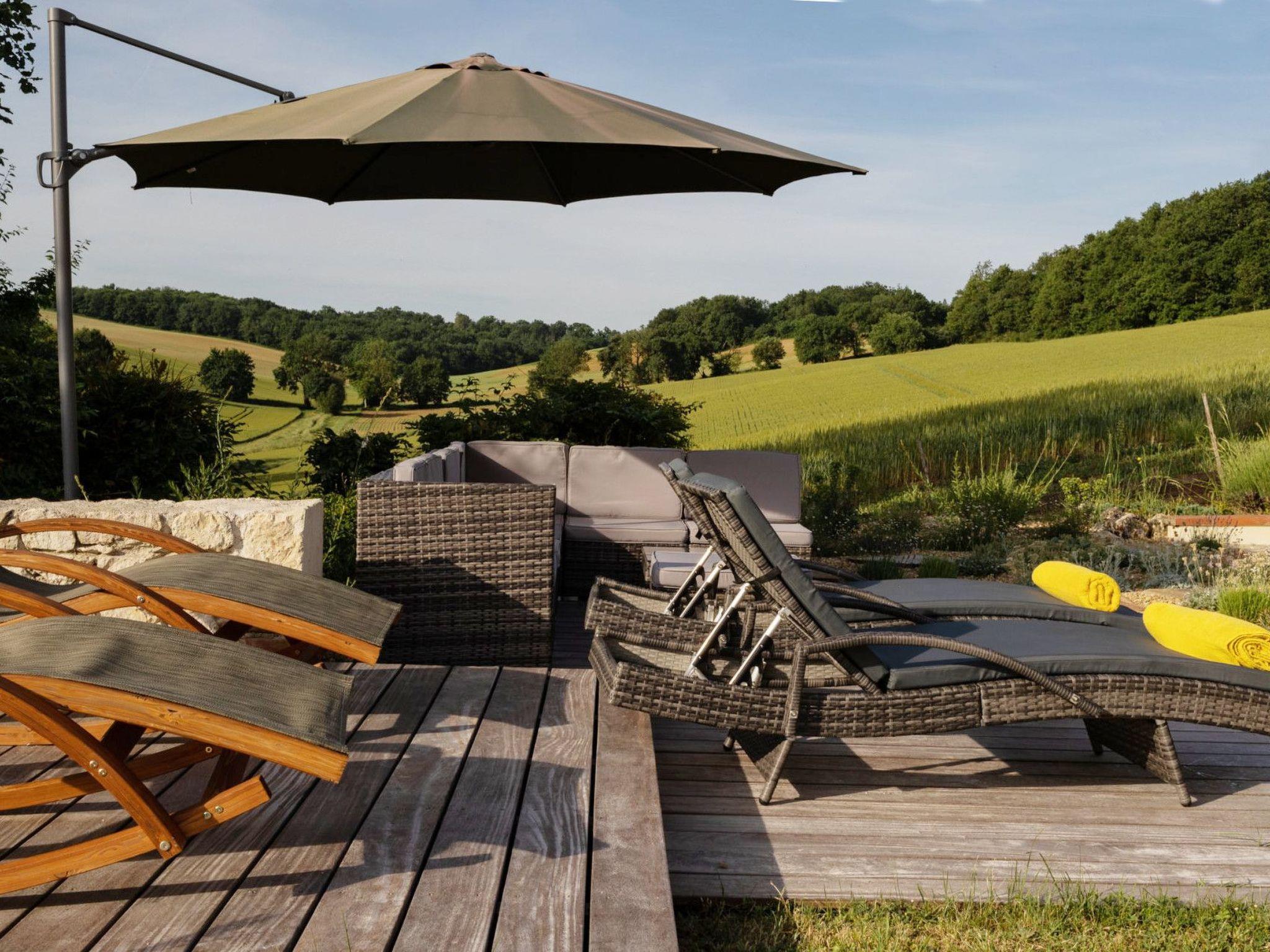 Outside, it is enchantment. A view without nuisance, nor opposite and absolute calm to enjoy the various terraces with garden furniture and parasols: a terrace with a view of the rising sun near the kitchen for breakfast (a treat!), a solarium terrace with sunbeds and cushions, deck chairs, resin garden furniture with cushions, parasols... And finally, the sheltered terrace near the swimming pool. The nerve center of a stay in fine weather, with an outdoor dining table, a bbq and direct access to the summer kitchen including 4-burner gas hob, fridge, worktop with sink and ice maker!