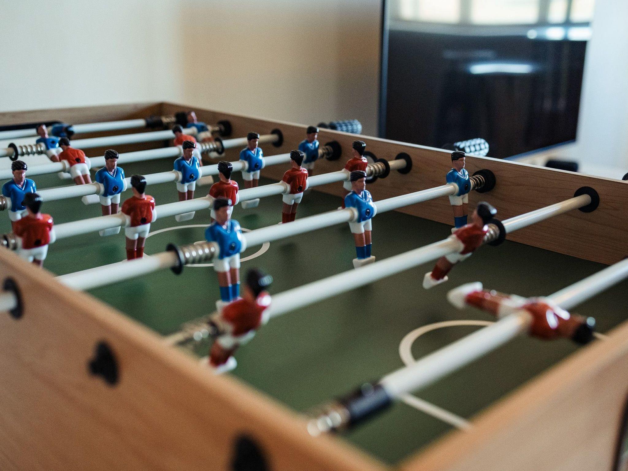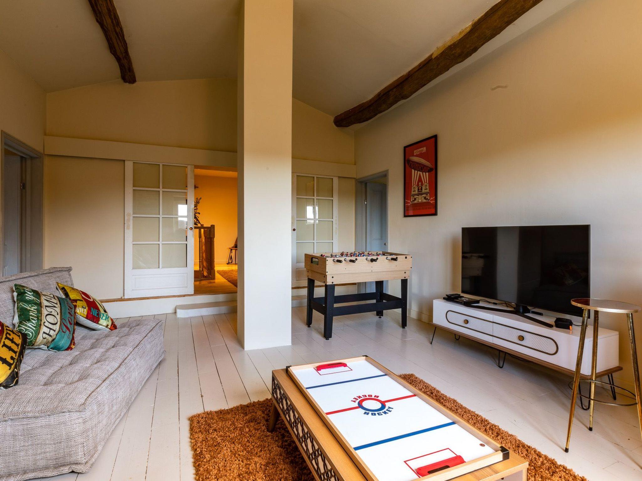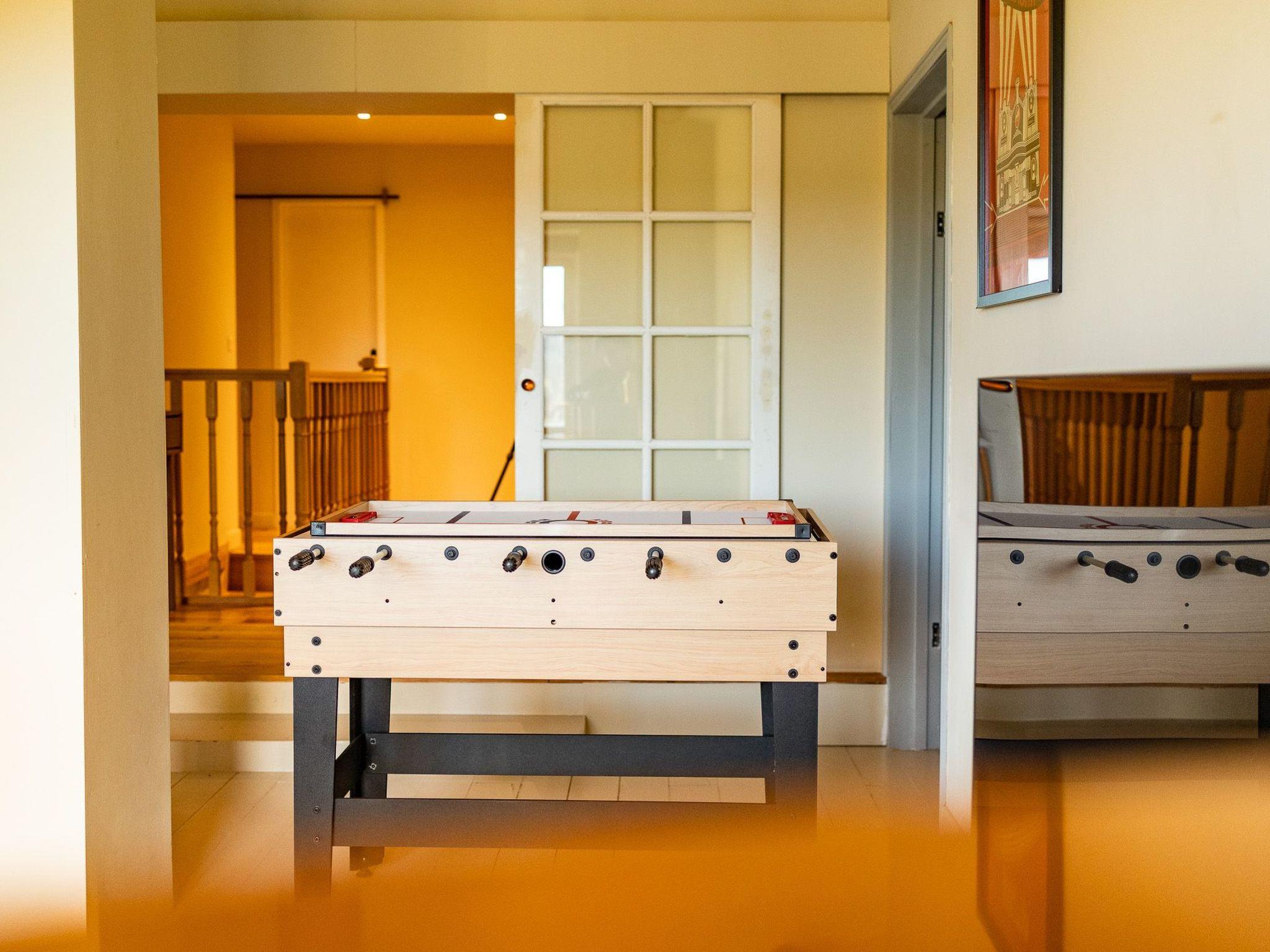 Upstairs, two other spacious double bedrooms (QUEEN SIZE BEDS), sharing a bathroom, are available to accommodate 4 other guests. It is also on this level that the rest room (25m2) is located with a WII console, another 55-inch flat screen TV, a multi-game table for children (table football, air-hockey, etc.) and a vintage bar with stools.