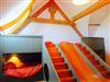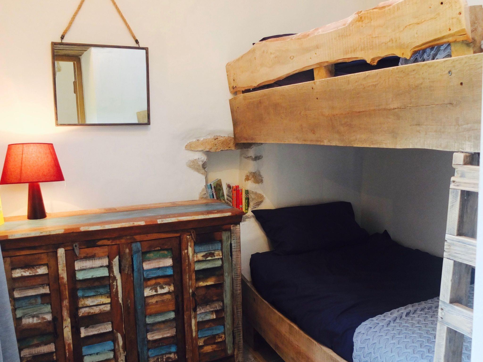 At the other end of the minstrel’s gallery is the fab children’s bedroom, also air-conditioned, with four, bespoke built-in bunk beds each with their own reading light that have a porthole den beneath the steps and a wooden slide to slip down onto a cushion. With a curved hobbit hole style WC with basin.