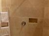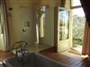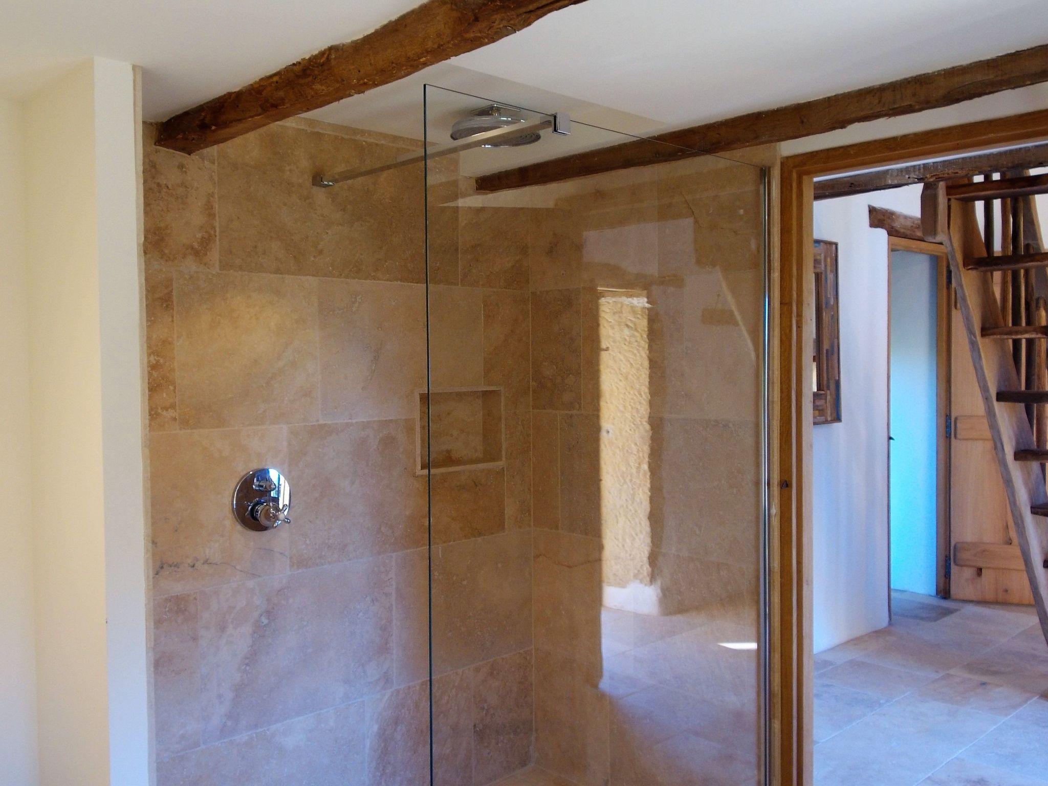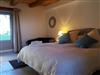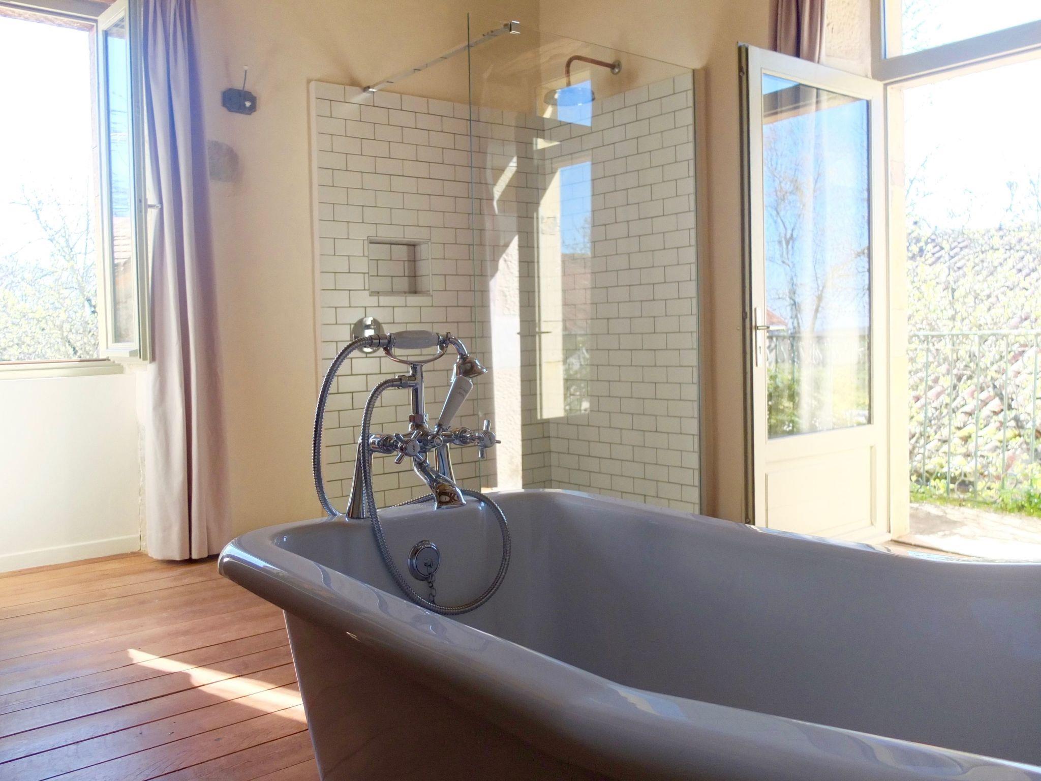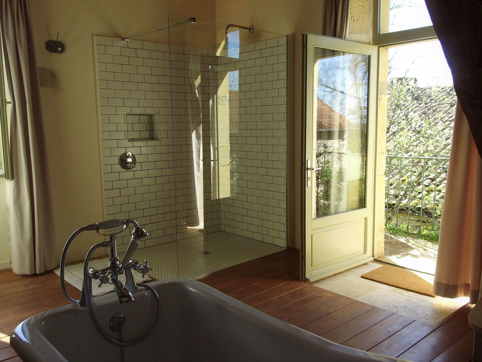 In another wing of the farmhouse, there is a second bedroom with a super-king size bed, French doors out to the courtyard and a window overlooking the West facing terrasse. A shower room with double Belfast basin and walk in rain shower with a separate WC, shared with the bedroom 2 are just along the corridor.