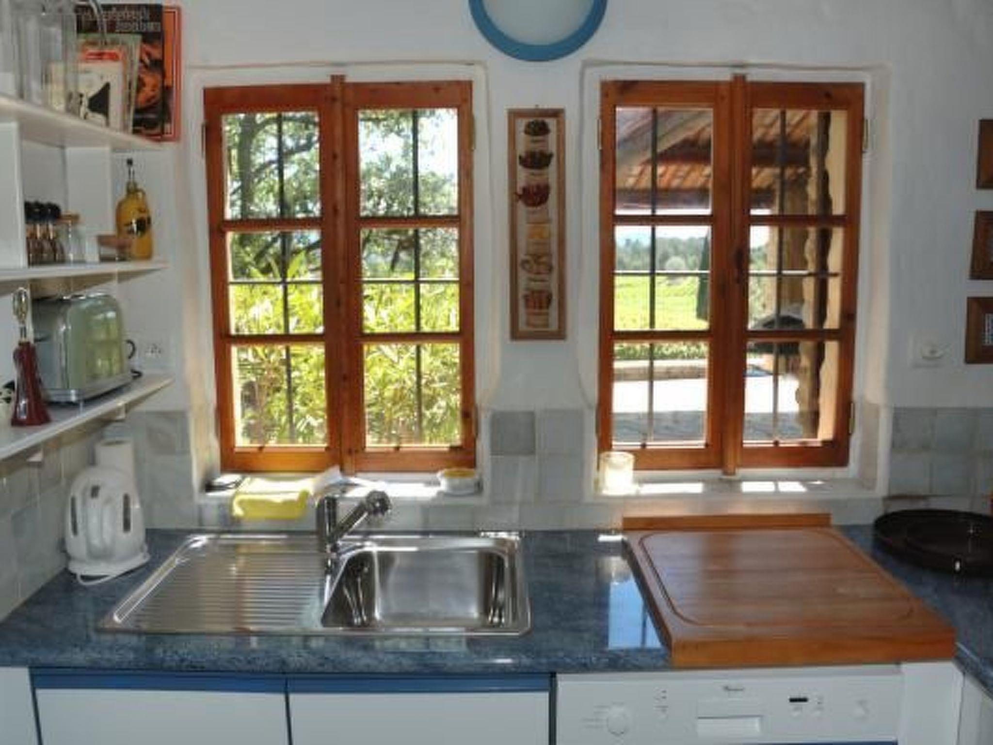 The house is beautifully furnished in a Provençal style with new and antique furniture. Kitchen: large fully equipped kitchen with ceramic hob, electric oven, washing machine, fridge, freezer, coffee maker and microwave Lounge and dining room: 180 cm long dining table with 4 chairs, sofa, fireplace and stereo, TV (satellite TV) Bedroom (upstairs via internal staircase): 1 double bed (160 cm), built-in wardrobe with shelves, drawers and clothes rail, all around with curtains or shutters, distant view to the south Bathroom: comfortably large and modern bathroom with washbasin, bath and toilet Terrace / seating: garden tables, chairs and deckchairs are available; covered and covered barbecue, communal round swimming pool (available for both holiday homes, diameter 300cm, height 120cm only available in July, August and September) Heating: electric radiators with thermostats in each bedroom Washing / drying: communal washing machine and tumble dryer in the annex building.