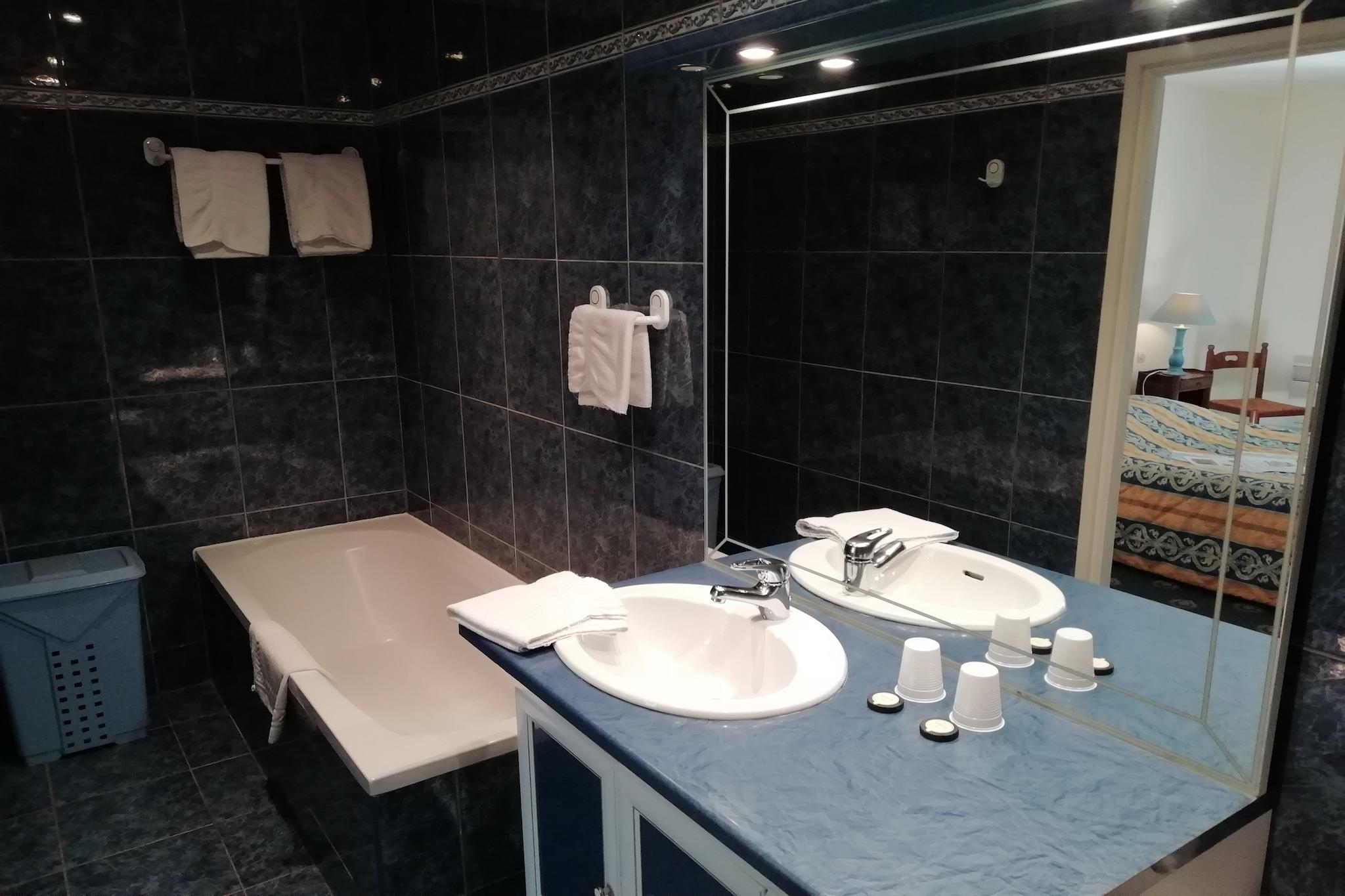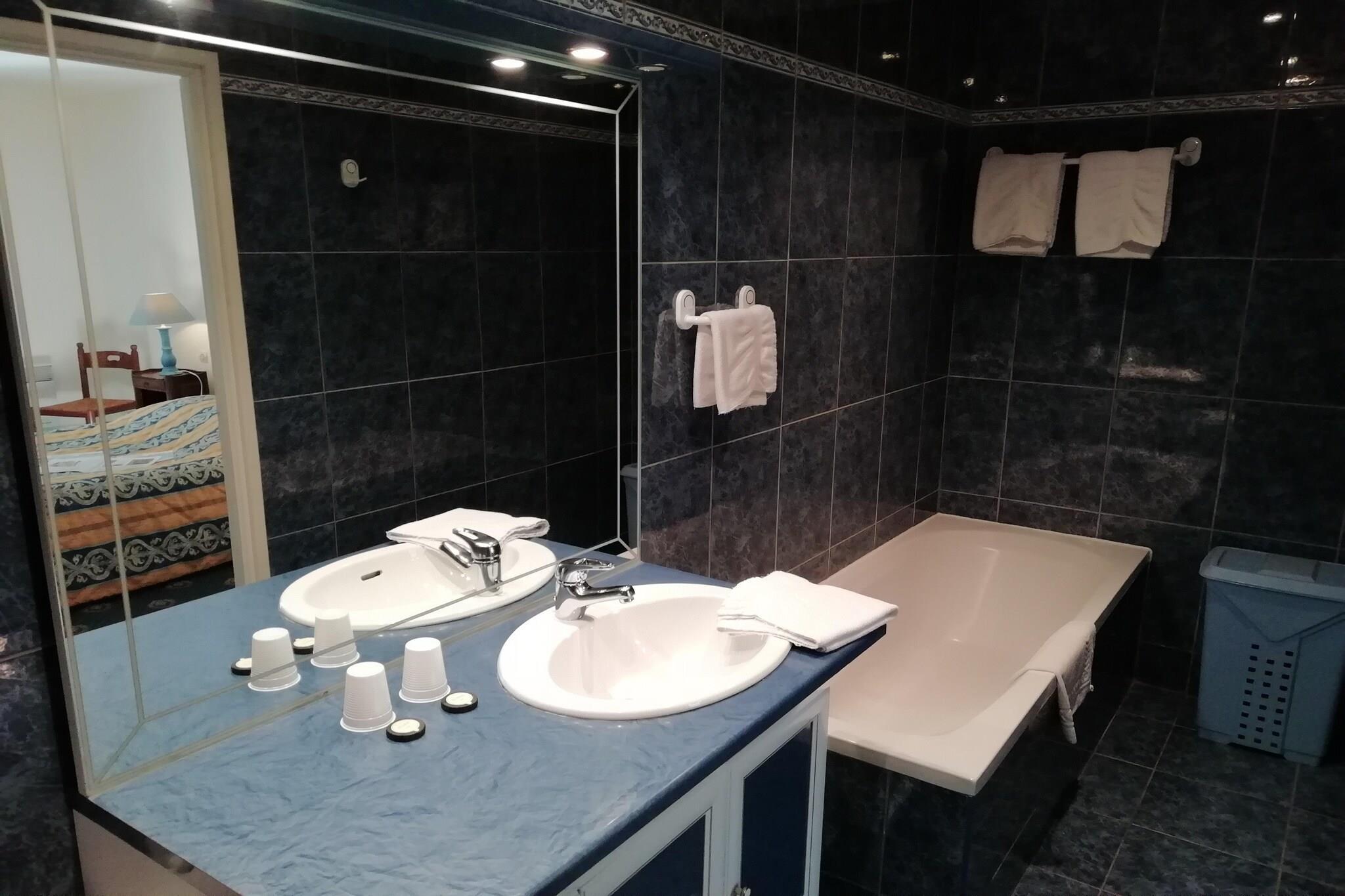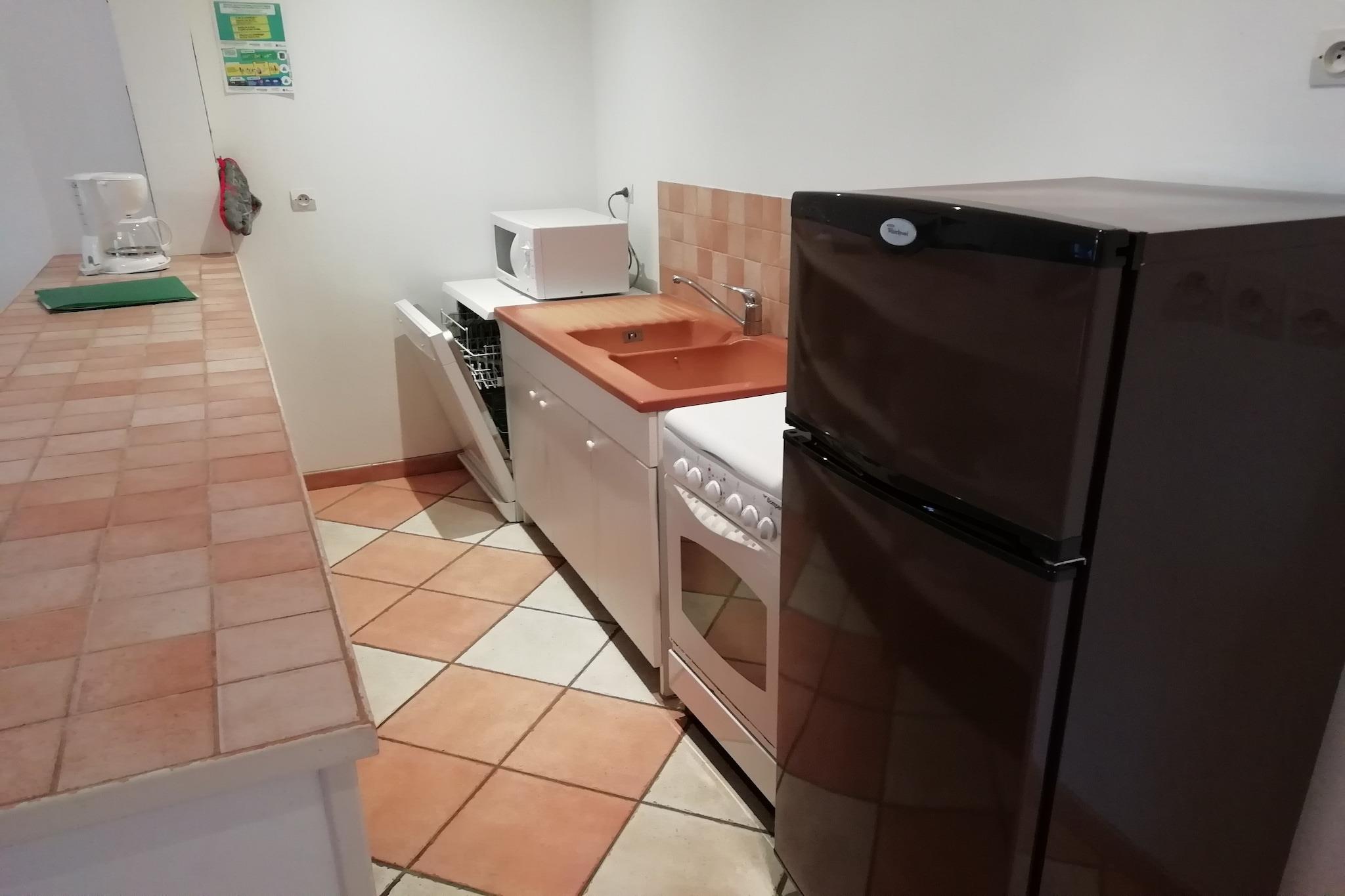 Stueetage: (Stue(2x enkeltsovesofa), åbent køkken(ovn, mikrobølgeovn, opvaskemaskine ), soveværelse(2x enkeltseng), soveværelse(dobbeltseng), badeværelse(badekar, bruser, håndvask, toilet), badeværelse(badekar, bruser, håndvask, toilet)) tørretumbler, vaskemaskine, varme(elektrisk), terrasse(overdækket), havemøbler, swimmingpool(deles med andre gæster, 14 x 6 m., opened from Jun upto and including 1/2 Sep), tennisbane(deles med andre gæster, betalt), petanquebane, bordtennisbord
