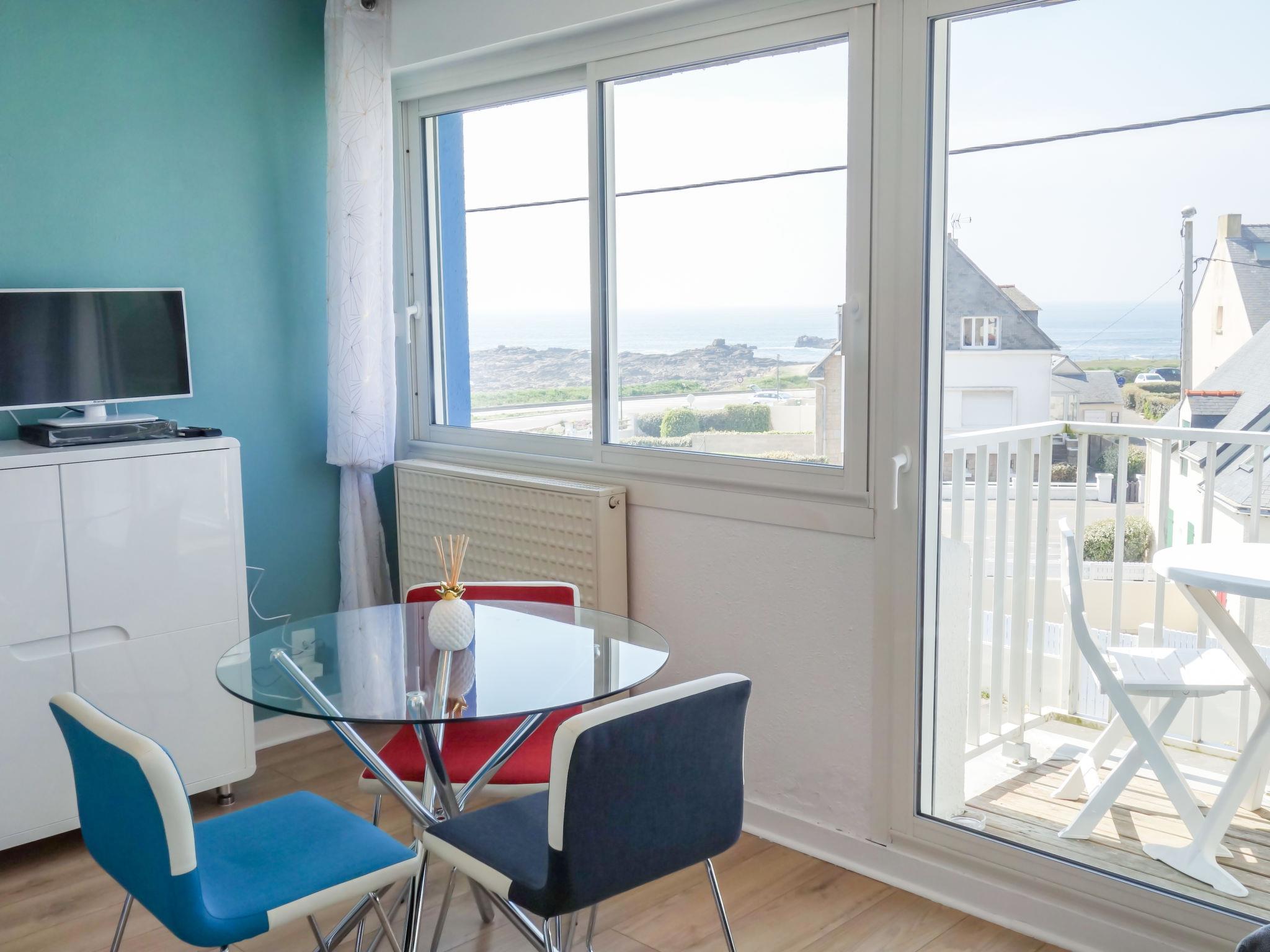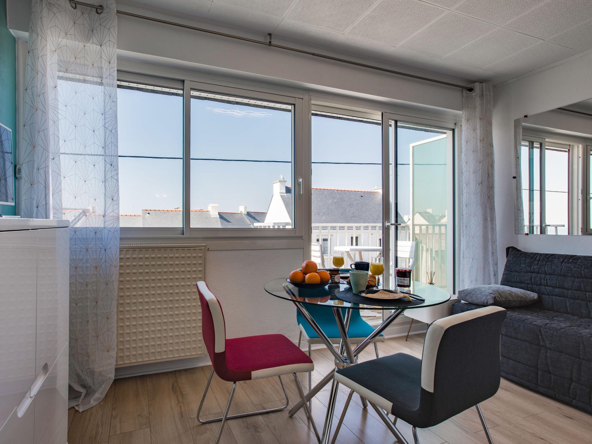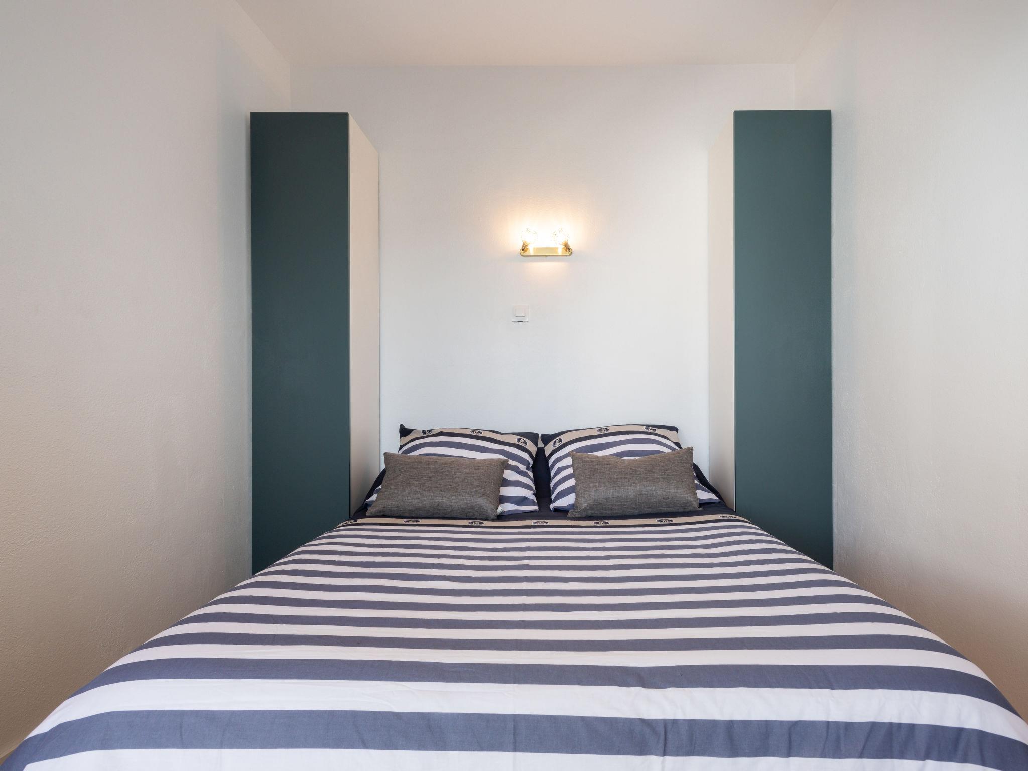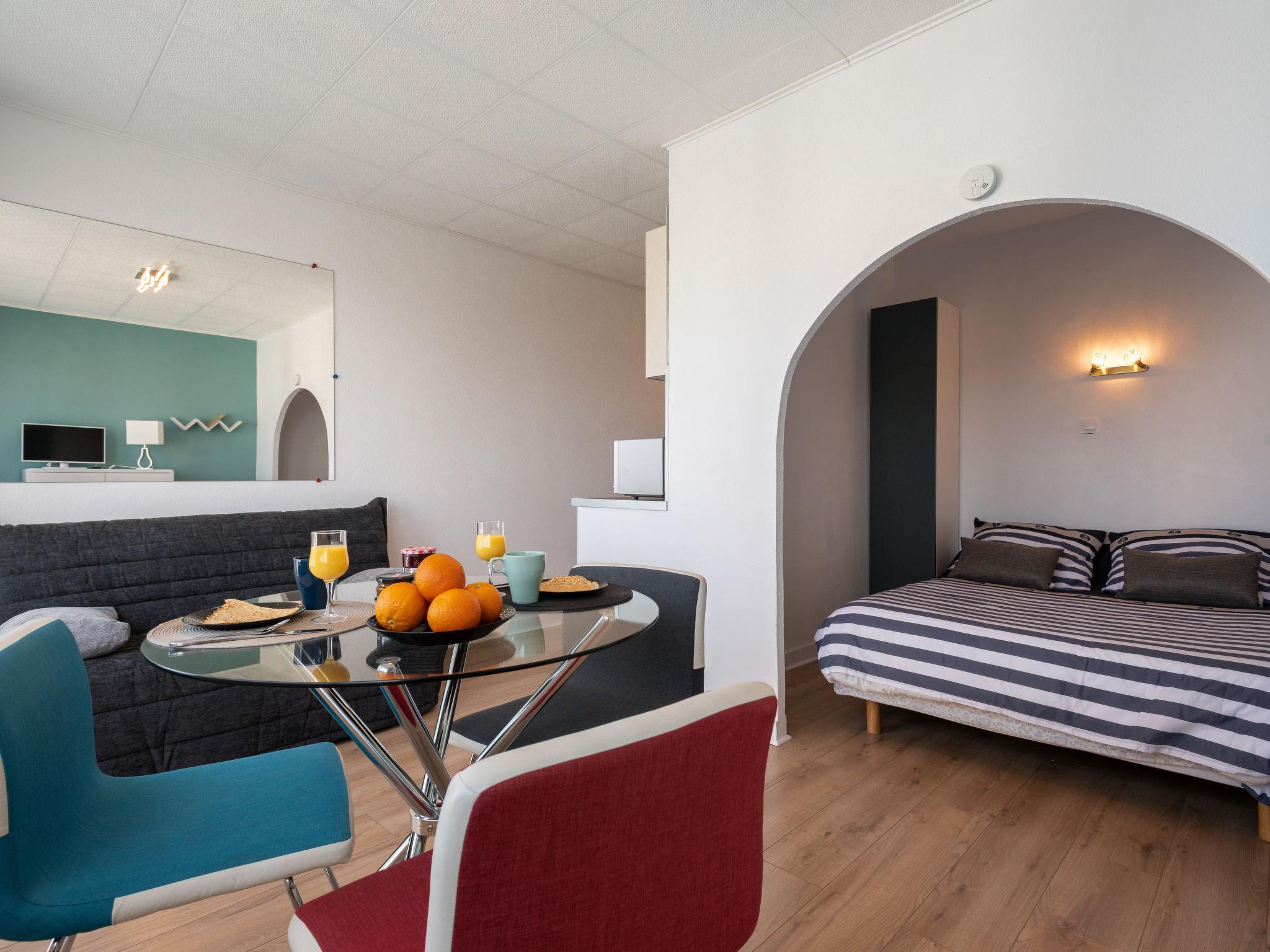 1-room studio 25 m2. Fully renovated in 2019, comfortable furnishings: living/dining room with TV (flat screen), DVD. Exit to the balcony. Alcove with 1 french bed (1 x 140 cm, length 190 cm). Small kitchen in the entrance (2 hot plates, electric coffee machine, Capsules for coffee machine (Dolce Gusto) extra, combination microwave). Shower/WC. Electric heating. Balcony 6 m2. Balcony furniture. Side view of the sea. Facilities: washing machine. Internet (WiFi, free). Parking space n 18. Maximum 1 small pet/ dog allowed. Instead of an enclosed bedroom, some sleeping areas are located in an open-plan area (gallery, alcove, etc.). 56186 000614 V7
