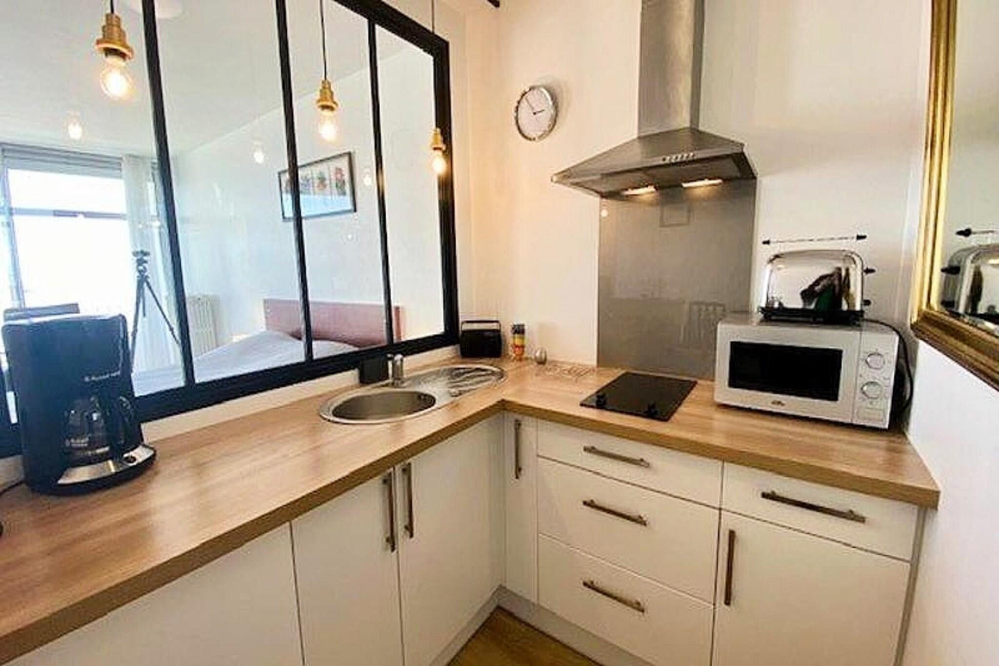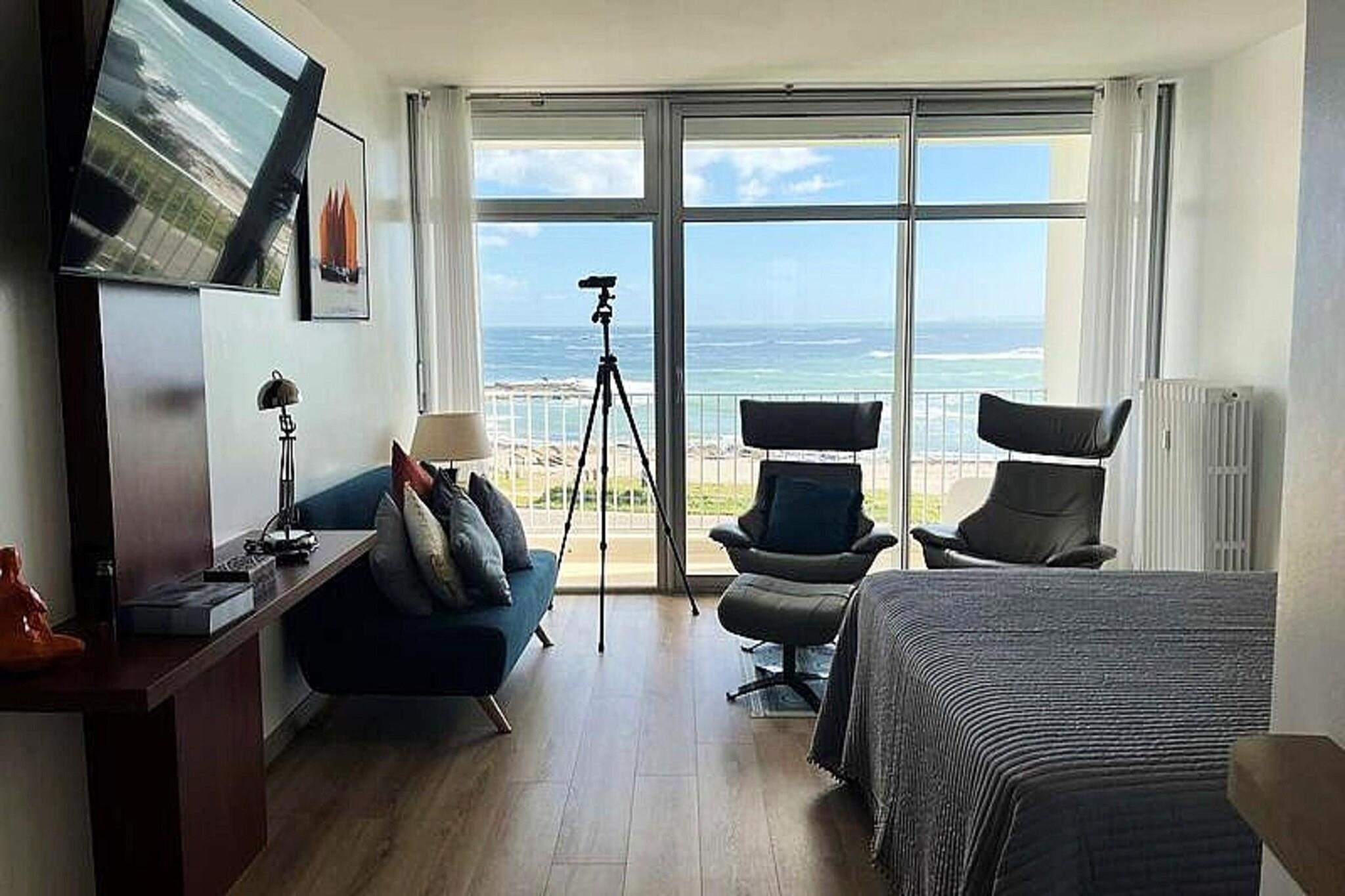 This fully renovated 35m² studio is perfect for up to three guests. It features a spacious living area with a 160cm bed and a 110cm single sofa bed, ideal for relaxing or sleeping. The studio includes a bathroom with WC and provides comfortable bedding with duvets. A beautiful south-facing loggia offers stunning sea views of Houat and Belle Ile. The apartment is non-smoking and does not allow pets, ensuring a peaceful environment. Private parking is available in the residence for added convenience. Located just 150 meters from the beach and next to Thalassotherapy and Pointe du Conguel, this studio is ideally placed for enjoying the local area. The surrounding neighborhood is filled with cafes, restaurants, and vibrant markets, perfect for sampling local delicacies. Whether you want to relax on the beach or explore the coastal attractions, this location offers plenty to do. The studio is equipped with an open kitchen, featuring a fridge, hotplates, microwave, and mini-oven, making it easy to prepare meals. Guests can enjoy the full sea view from the loggia with garden furniture, adding an extra touch of relaxation. With included WiFi and optional services like end-of-stay cleaning, linen rental, and childcare equipment, this apartment offers both comfort and convenience for a memorable stay.