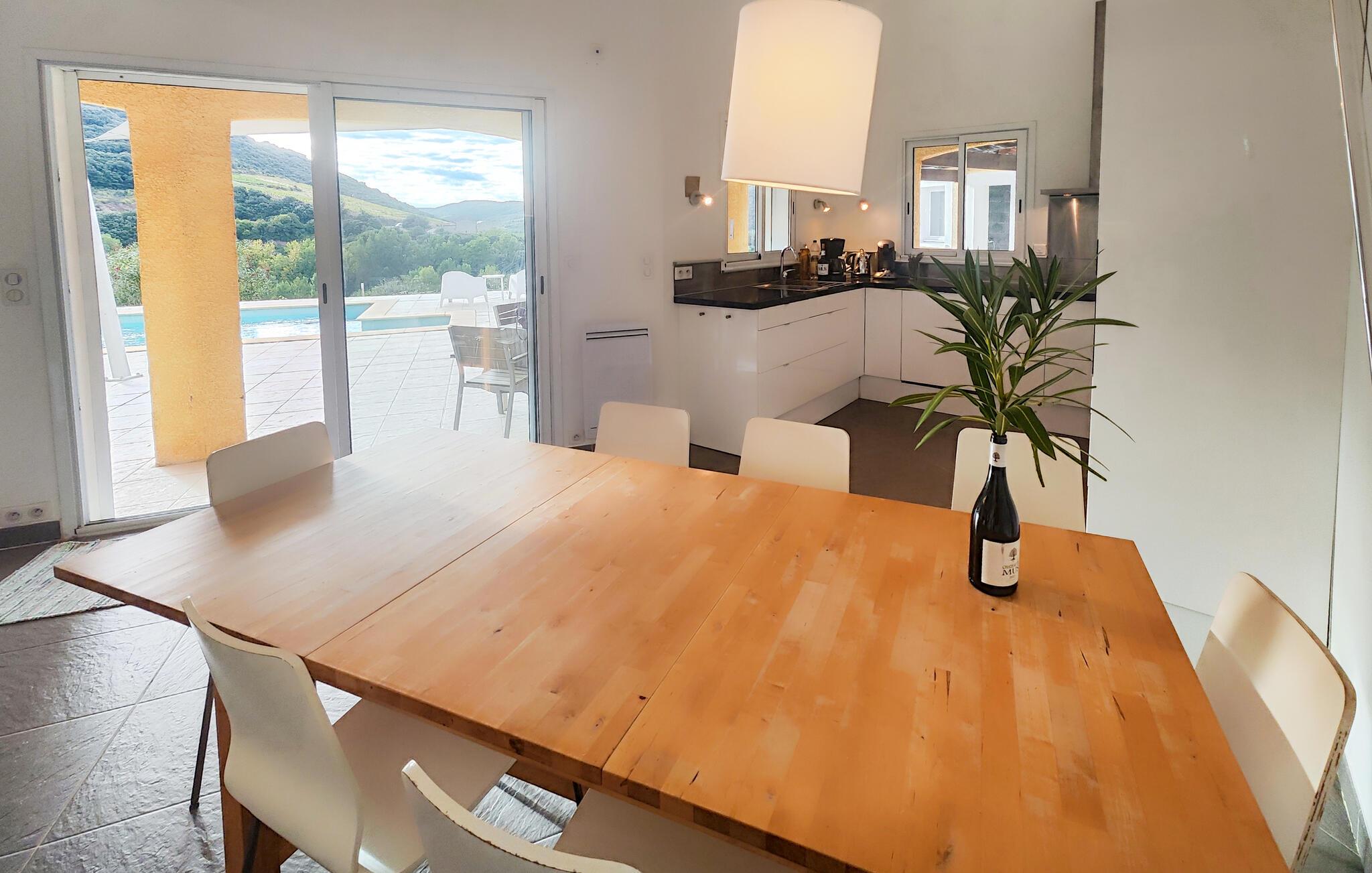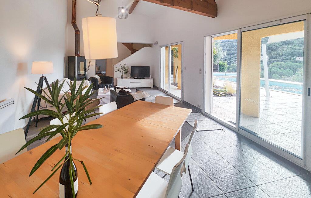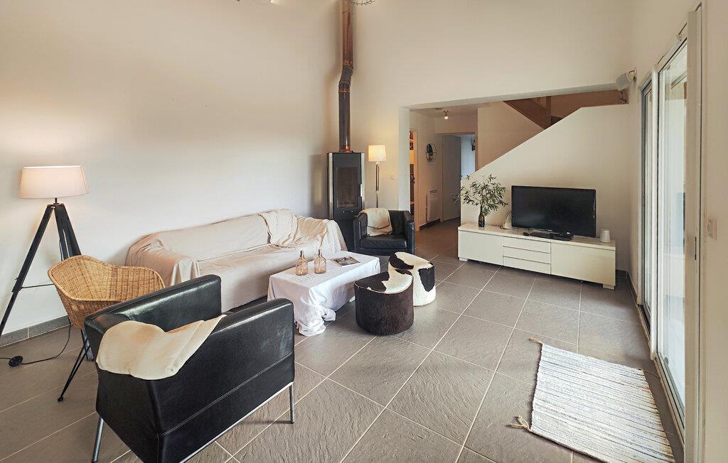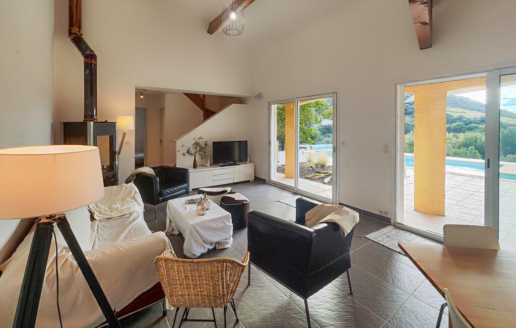 Inde i huset finder I en lys og moderne atmosfære med højt til loftet, synlige træbjælker og store vinduer med udsigt over det omkringliggende landskab. Læn jer tilbage i den komfortable sofa og nyd freden og roen eller en god bog. Det åbne køkken er perfekt til at lave mad sammen, snakke og nyde udsigten over de omkringliggende bakker. Efter middagen inviterer opholdsstuen jer til at slappe af: forkæl jer selv med et glas vin og lyt til jeres yndlingsmusik.