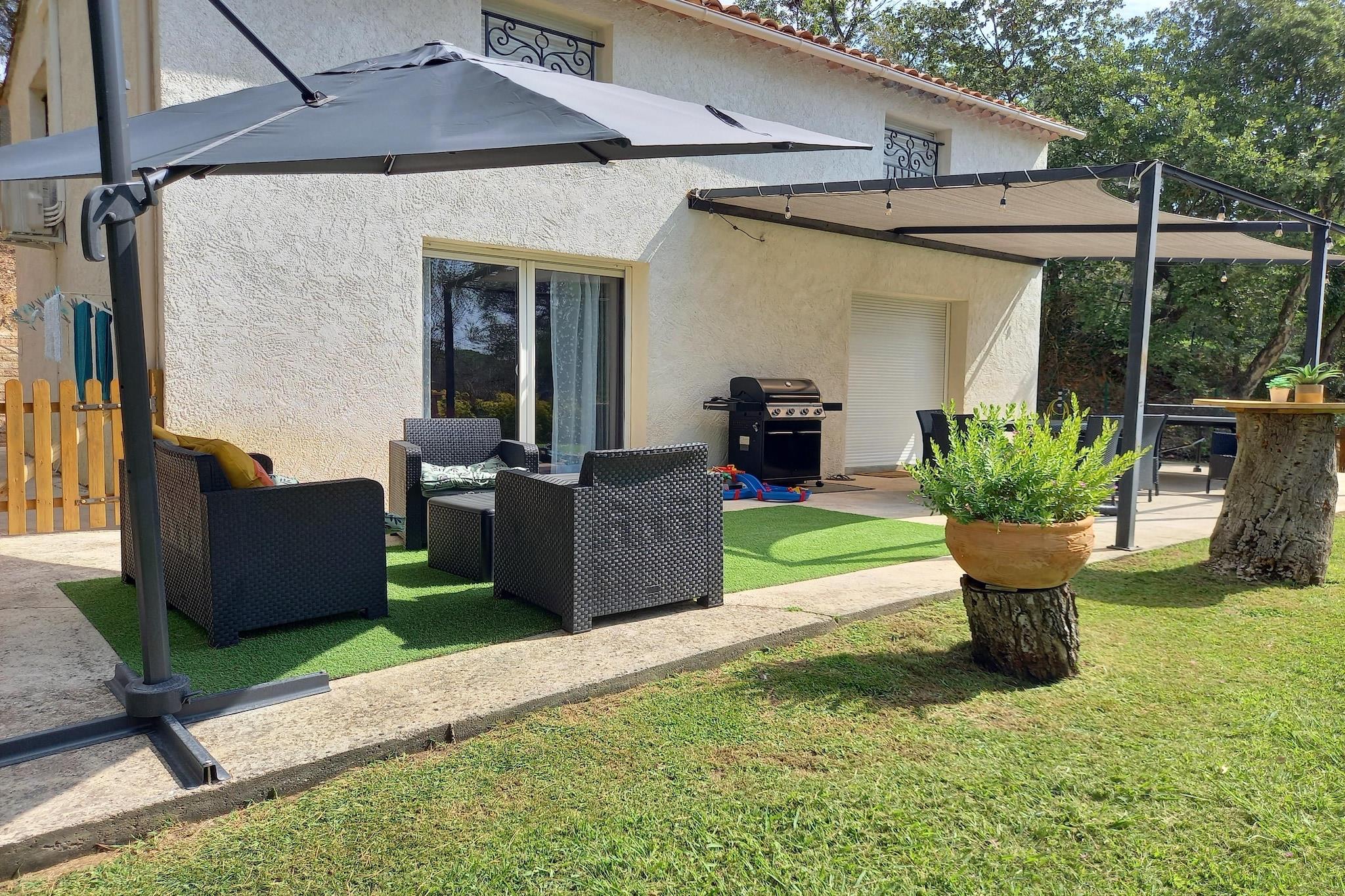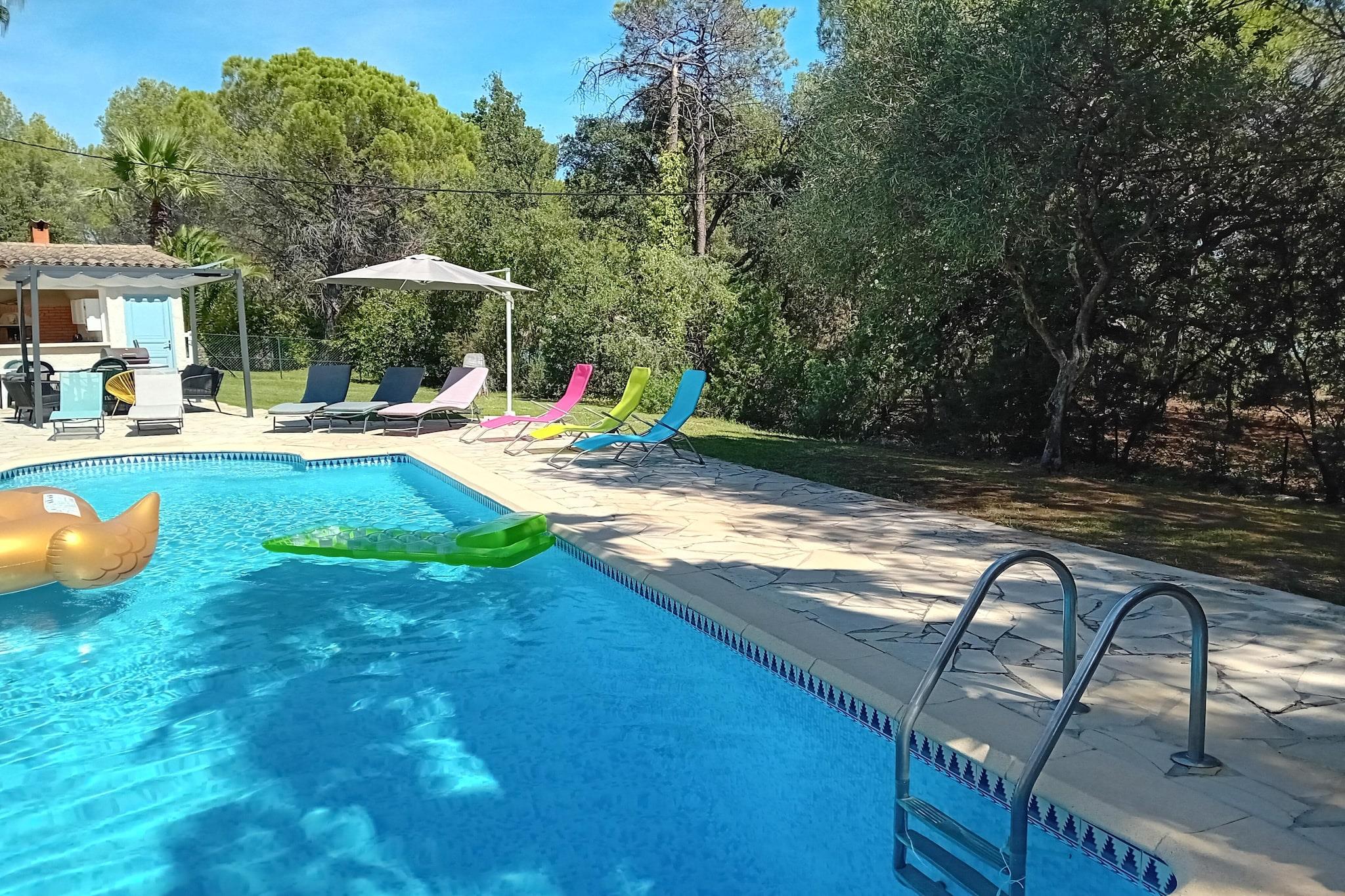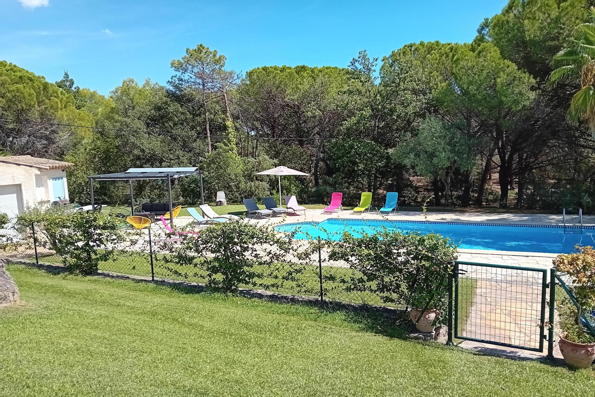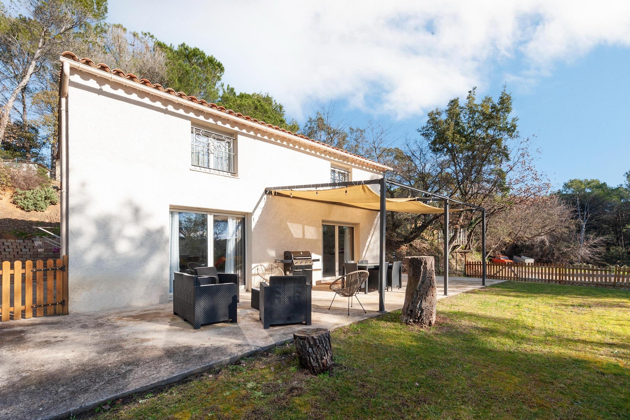 Dette feriehus ligger for enden af en blindgyde. Omgivet af skove, blev det fuldstændig renoveret i 2022. Det ligger på samme sted som ejernes hus og tilbyder sine gæster stor privatliv. Ideel til familier Den indhegnede swimmingpool med børnepool (30 cm dyb) deles med ejerne og ligger omkring hundrede meter fra huset. Ejendommen ligger tæt på mange centre, den nærmeste er La Bouverie på 1,5 km. Du vil finde gode butikker og restauranter til at tilbringe en hyggelig aften om aftenen. Centrum af den mest berømte Fréjus ligger 8 km fra lejligheden, og en dag med vandsjov i det nærliggende vandland er også muligt (1,5 km). Interiøret er elegant, og hele øverste etage har aircondition; for en behagelig temperatur på varme sommerdage.Det store soveværelse har en-suite brusebad og de øvrige soveværelser deler et badeværelse. Der er en stor sovesofa, som komfortabelt kan rumme 2 børn. Nice lufthavn ligger 65 km væk.