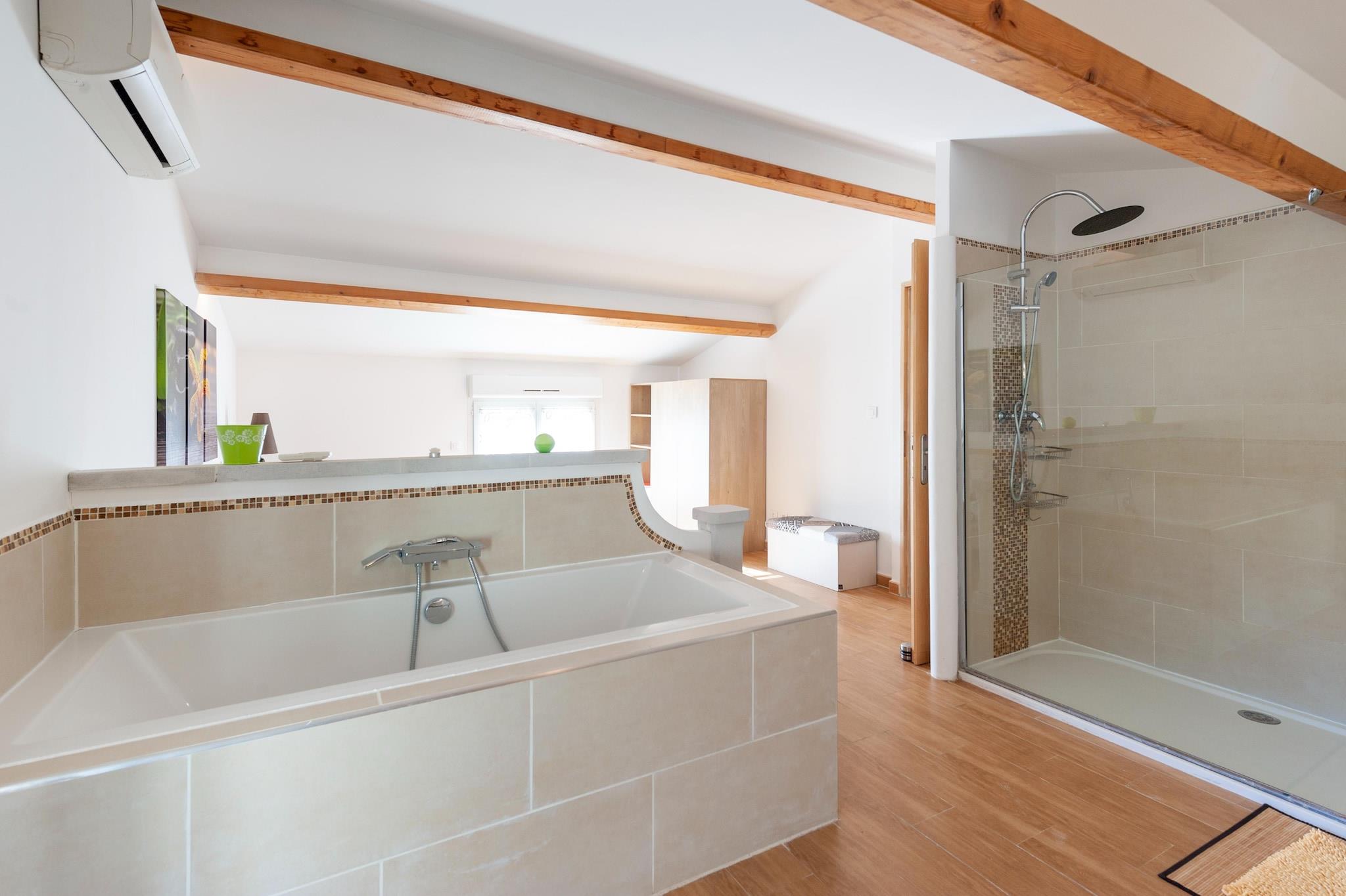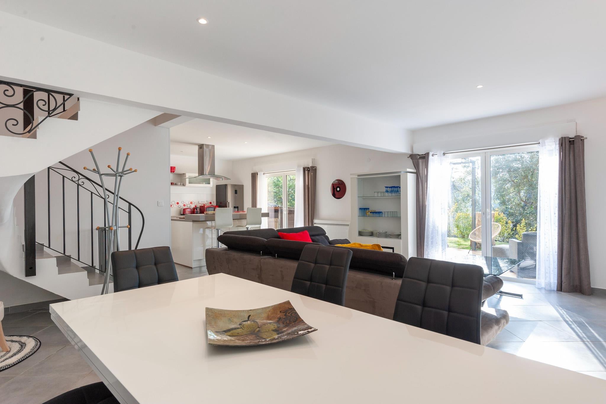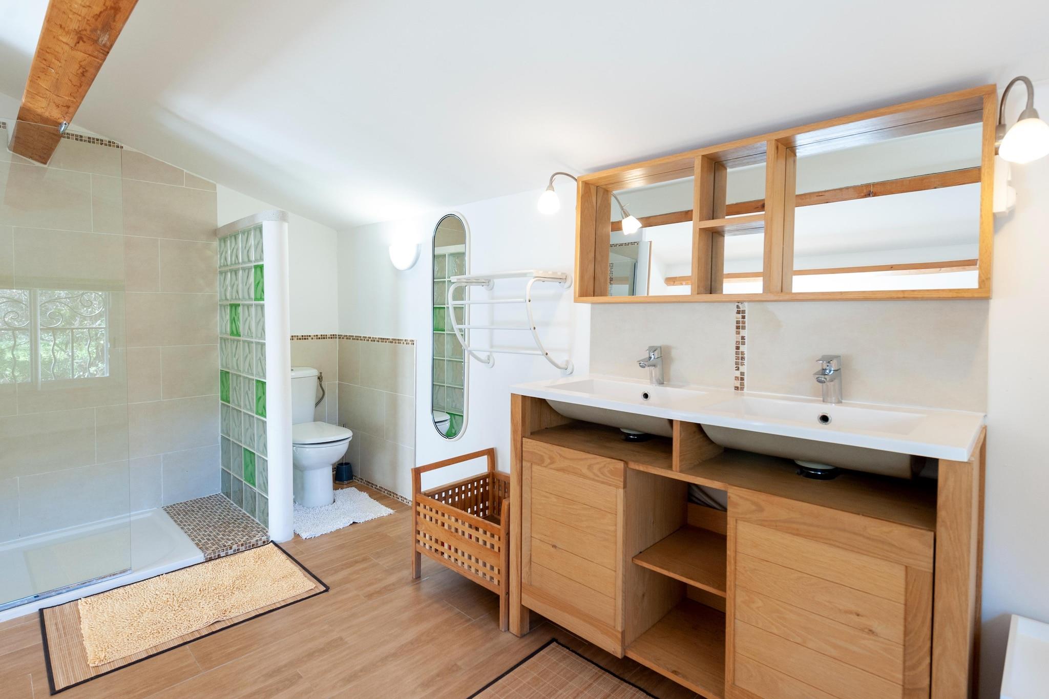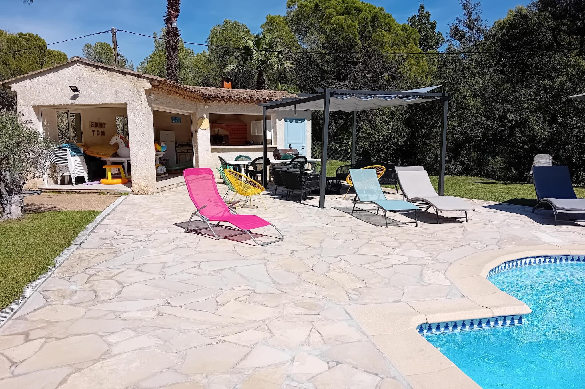 Dette feriehus ligger for enden af en blindgyde. Omgivet af skove, blev det fuldstændig renoveret i 2022. Det ligger på samme sted som ejernes hus og tilbyder sine gæster stor privatliv. Ideel til familier Den indhegnede swimmingpool med børnepool (30 cm dyb) deles med ejerne og ligger omkring hundrede meter fra huset. Ejendommen ligger tæt på mange centre, den nærmeste er La Bouverie på 1,5 km. Du vil finde gode butikker og restauranter til at tilbringe en hyggelig aften om aftenen. Centrum af den mest berømte Fréjus ligger 8 km fra lejligheden, og en dag med vandsjov i det nærliggende vandland er også muligt (1,5 km). Interiøret er elegant, og hele øverste etage har aircondition; for en behagelig temperatur på varme sommerdage.Det store soveværelse har en-suite brusebad og de øvrige soveværelser deler et badeværelse. Der er en stor sovesofa, som komfortabelt kan rumme 2 børn. Nice lufthavn ligger 65 km væk.