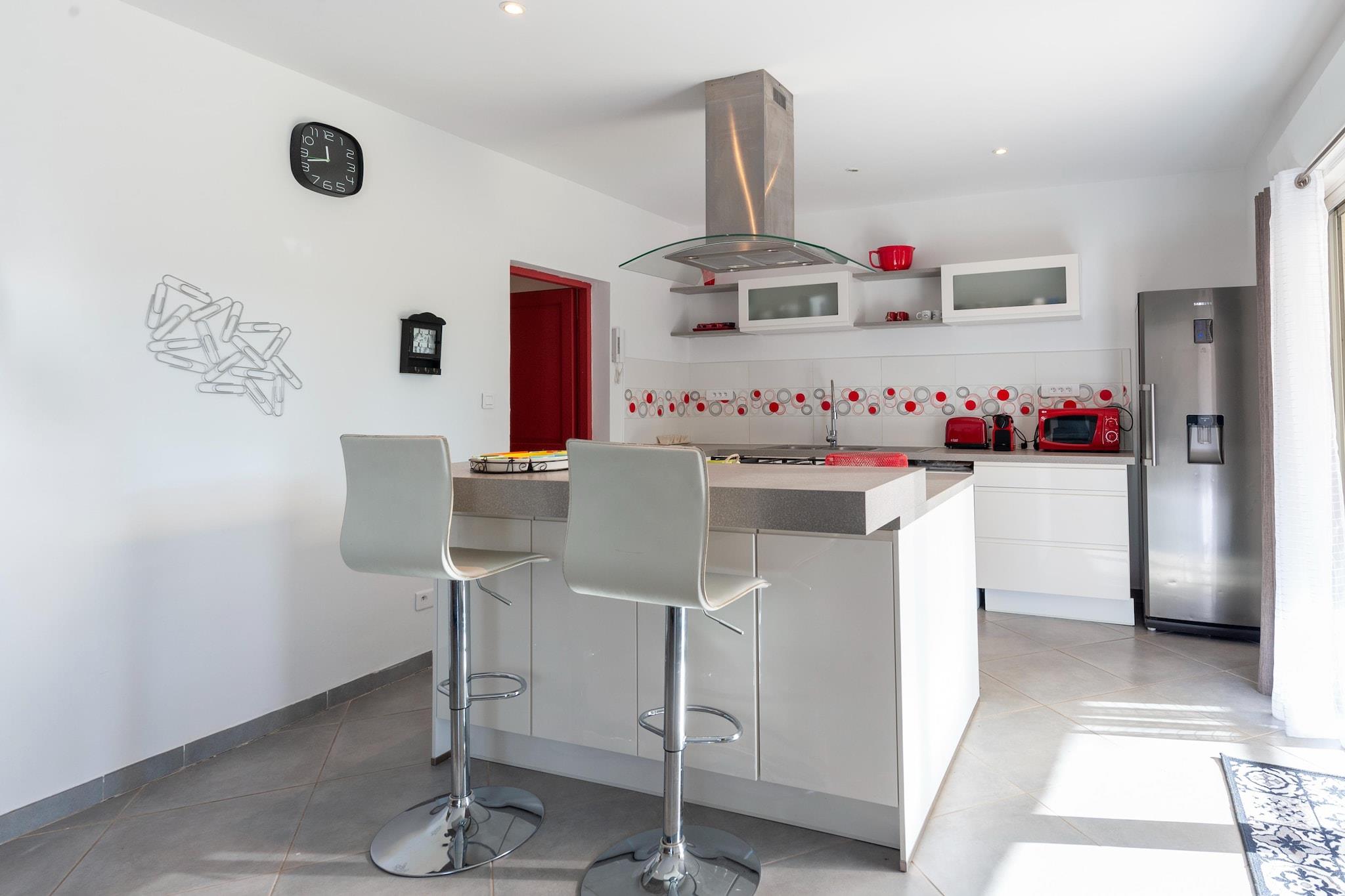 Stueetage: (åbent køkken(elkedel, brødrister, emhætte, kaffemaskine, espressomaskine, ovn, mikrobølgeovn, opvaskemaskine , køleskab), stue / spisestue(dobbeltsovesofa, Fjernsyn), toilet, bryggers(køle-fryseskab, vaskemaskine, strygebræt, strygejern)) På 1. etage: (soveværelse(dobbeltseng(140 x 200 cm)), soveværelse(dobbeltseng(140 x 200 cm)), Soveværelse med badeværelse(dobbeltseng(160 x 200 cm), bruser, håndvask, toilet), badeværelse(bruser, håndvask, toilet), klimaanlæg) tremmeseng, havedøre, have, havemøbler, solstole, grill, parkering, swimmingpool(deles med ejer, indhegnet, inkl. separat børne swimmingpool (maks. dybde 50 cm)), petanquebane, bordtennisbord, barnestol, loungemøbler