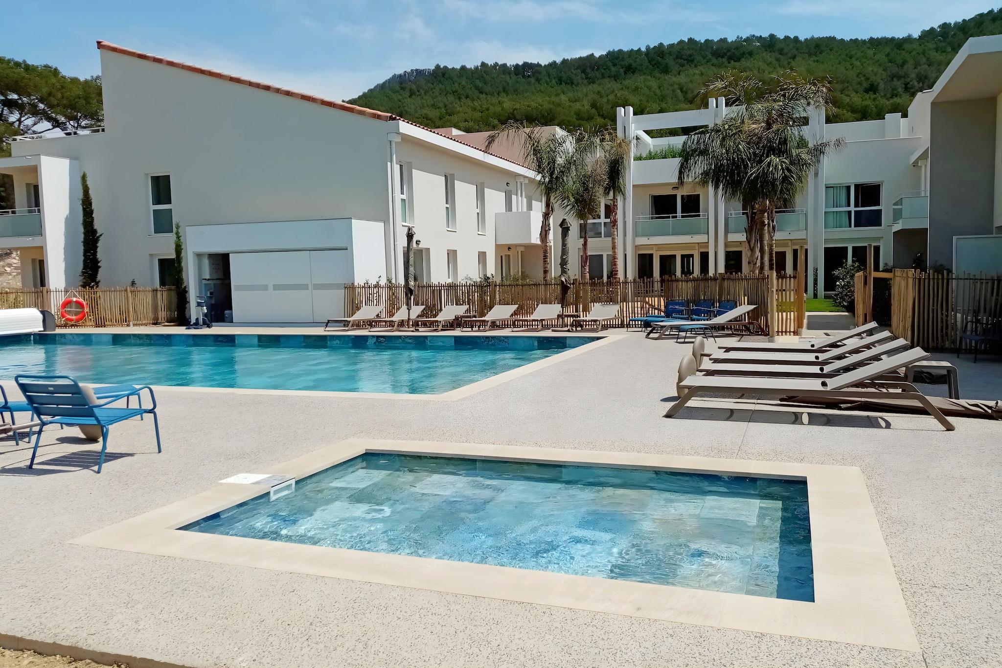 En bolig færdig i 2023 i hjertet af Provence, kun 6 km fra havnebyen Cassis! De fuldt udstyrede lejligheder med aircondition har terrasser eller balkoner, så du kan nyde den lokale sol og spise udenfor. Oplev området og smag regionens delikatesser. Cassis, med sine smalle gader og maleriske kvarterer med gadecaféer og restauranter og havnen, der minder om St. Tropez i 1960'erne, ligger mellem Marseille og Toulon. Småstensstrande, klippebugter, fyrreskove og vinmarker bestemmer panoramaet her. Langs Alta Vias klipper er der en storslået udsigt over havet 350 m nedenfor og Calanques klipper, inklusive den mest berømte, Cap Canaille. Calanques-massivet består af et 400m tykt lag af kalksten og er et af de smukkeste landskaber, som Frankrig har at byde på. Der er dannet dale under vandet og skabt små fjorde med smukke naturlige bugter. I løbet af dagen kan du opdage hedeområder, maleriske fiskerlandsbyer eller vandre gennem bjergene, før du forfrisker dig selv i boligens pool. Vandsportsentusiaster bør besøge strandene i Cassis eller La Ciotat, kun få kilometer væk.