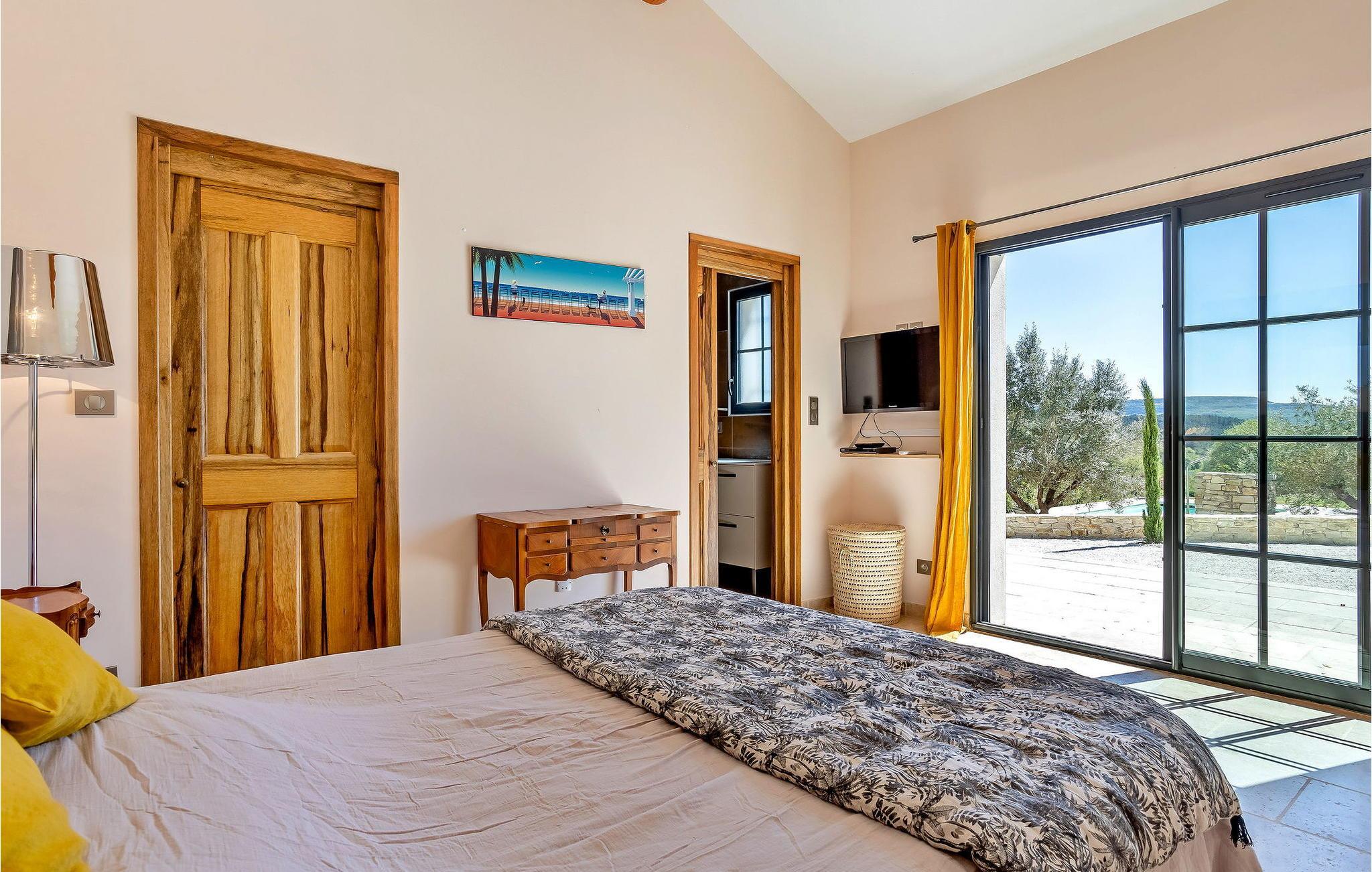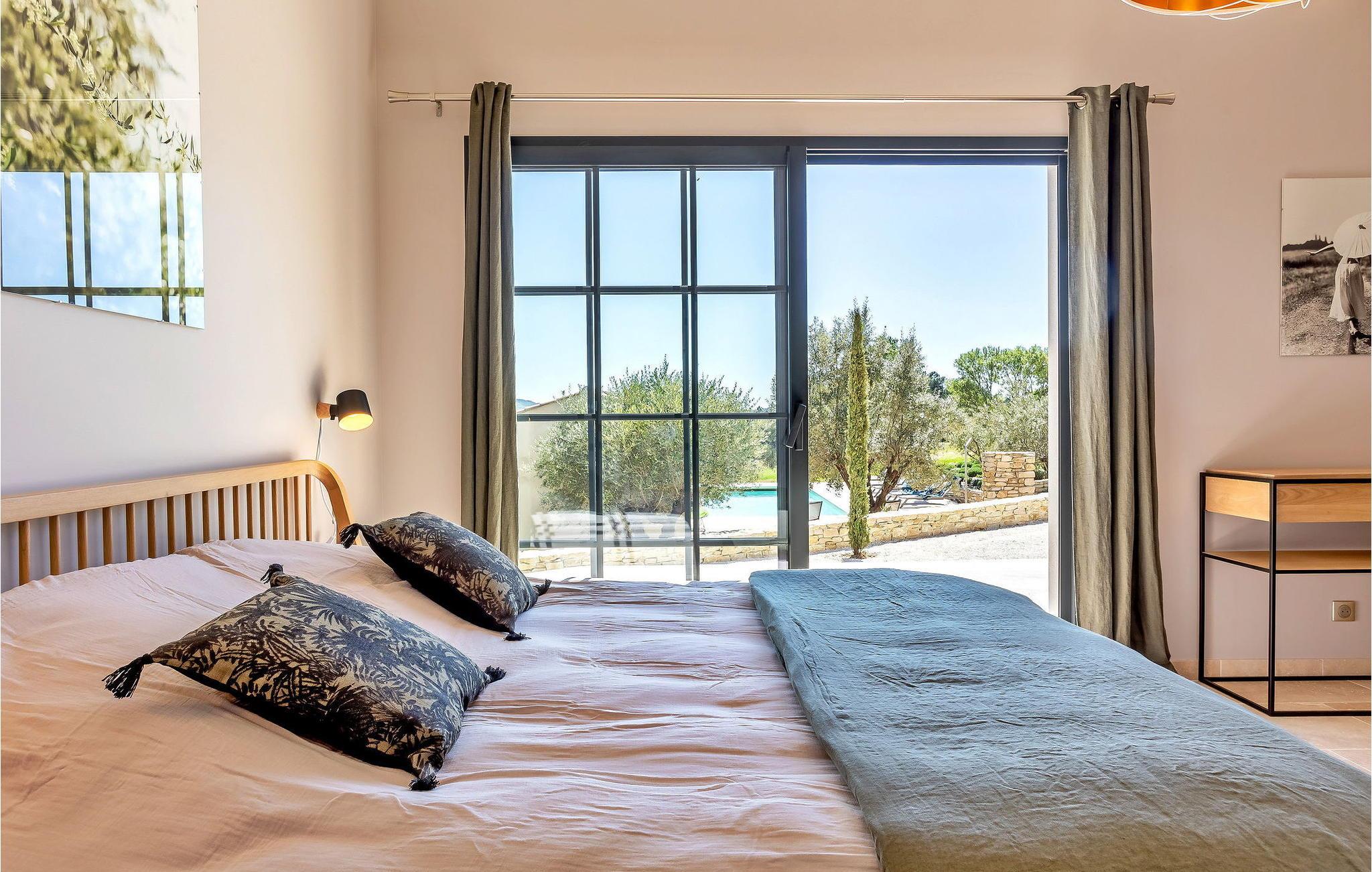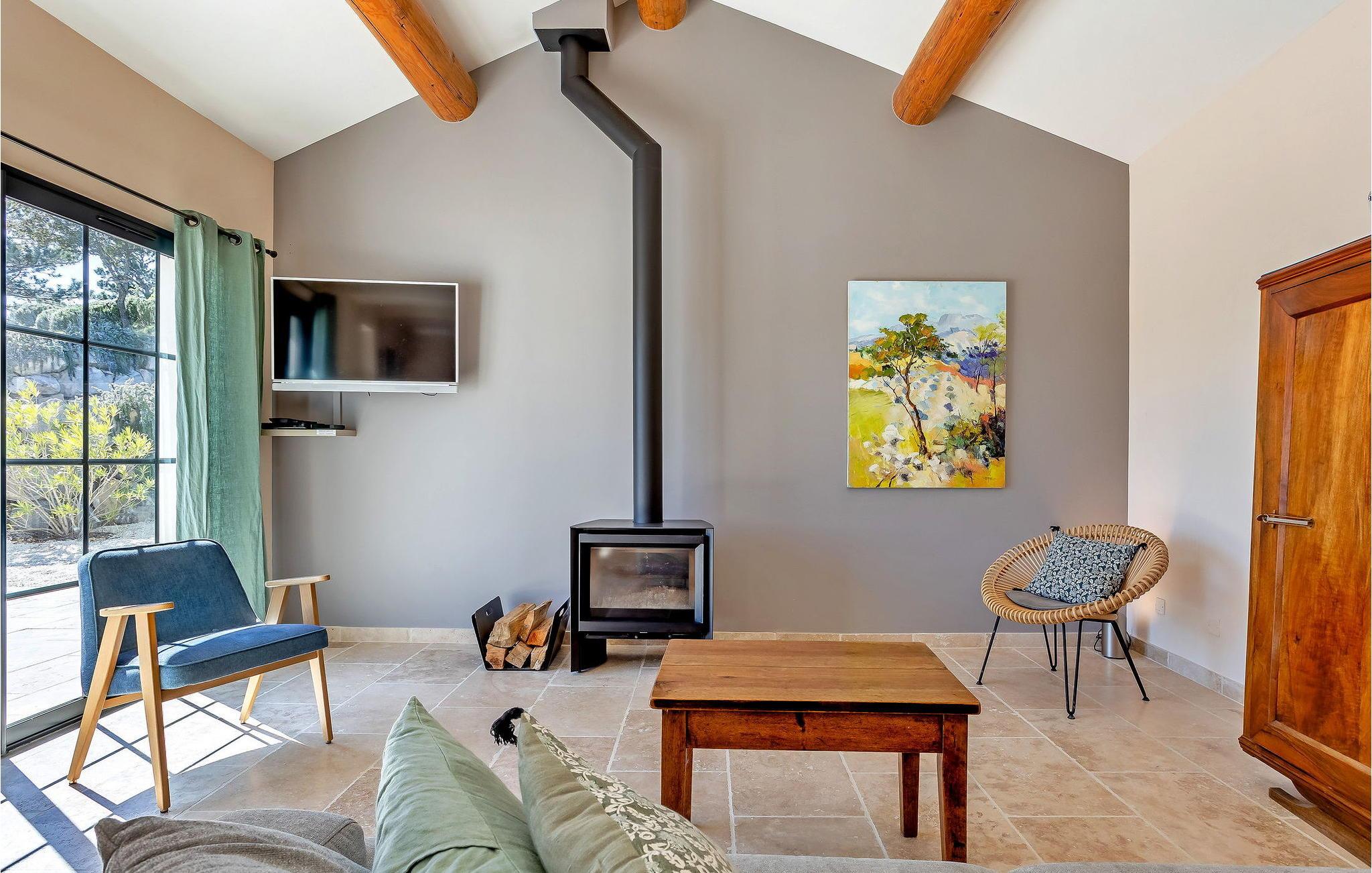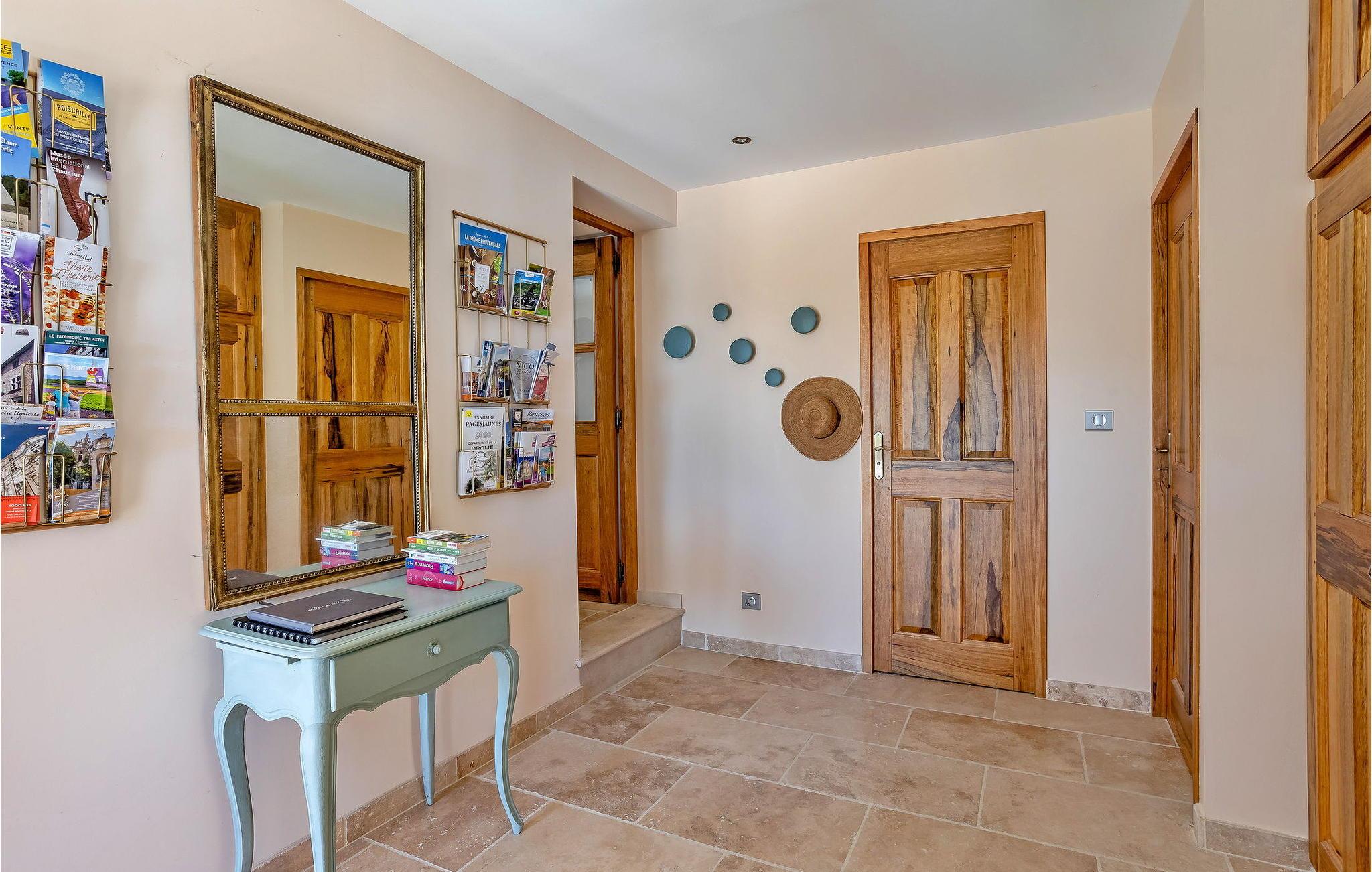 Denne bondegård i Roussas, Drome, Provence, tilbyder et fredfyldt tilflugtssted i et smagfuldt indrettet rum midt i det rolige landskab. I stueetagen finder du en indbydende stue/spisestue med aircondition, møbleret med et tv, sofa, lænestole og et sofabord. Nyd varmen fra en brændeovn. Det åbne køkken er veludstyret for bekvemmelighed. Der er to soveværelser med aircondition i stueetagen. Ovenpå finder du yderligere to soveværelser, det ene med køjesenge. Udenfor kan du nyde det store uindhegnede land og en skyggefuld terrasse til udendørs spisning. Den private opvarmede pool, sikret af en elektrisk skodde, tilbyder afslapning med liggestole og panoramaudsigt over landskabet. Et poolhus med faciliteter fuldender dette udendørs rum. Stuehuset er beliggende i et meget roligt og naturligt miljø ca. 1 km fra landsbyen (lille restaurant, brødbutik). Første butikker inden for 5 km. I Valaurie (2 km) finder du nogle små butikker og en Intermarché i Grignan. Der er forskellige vandrestier i det omkringliggende landskab, opdag de provencalske landsbyer og markeder i regionen (Grignan, Nyons). Den nærmeste by er Grignan (10 km).