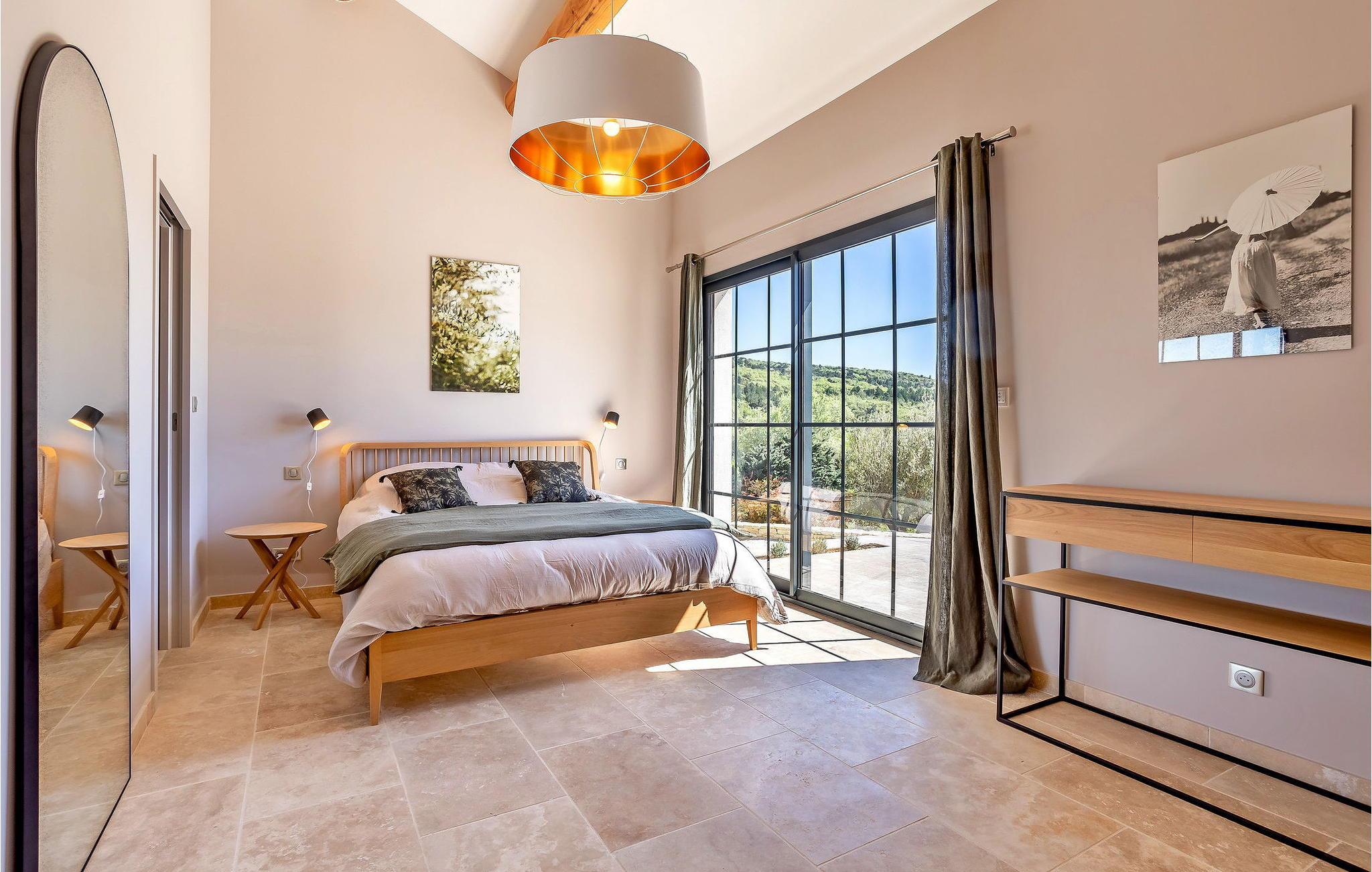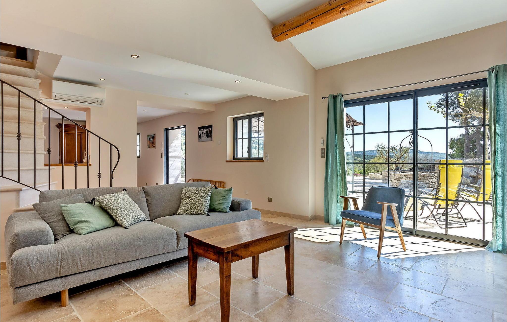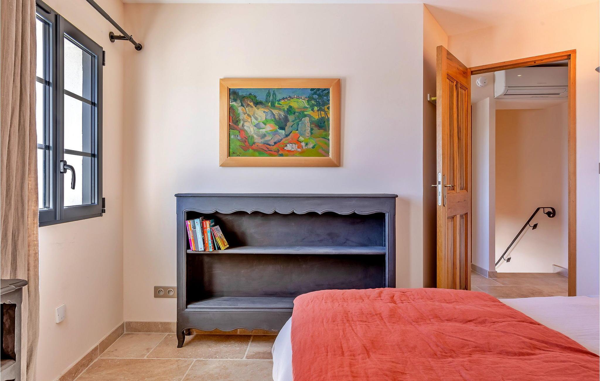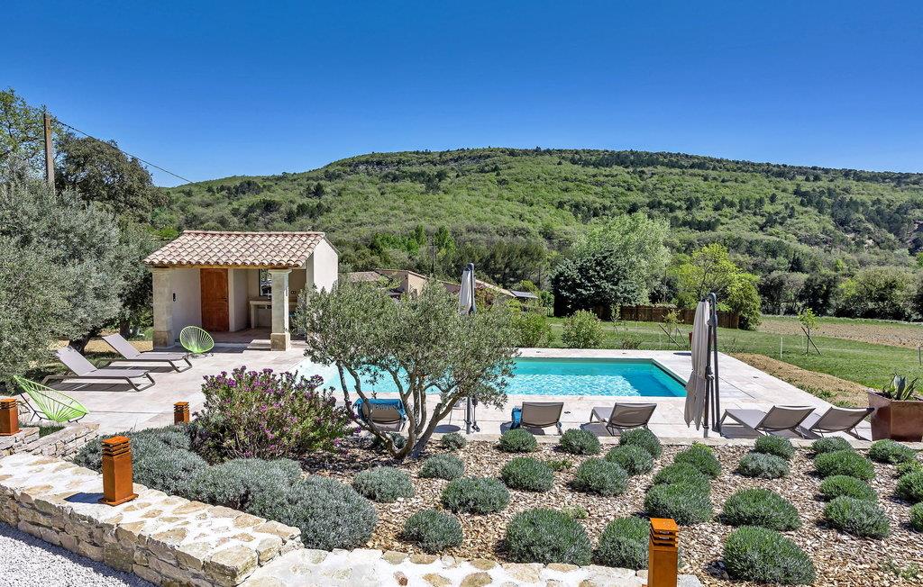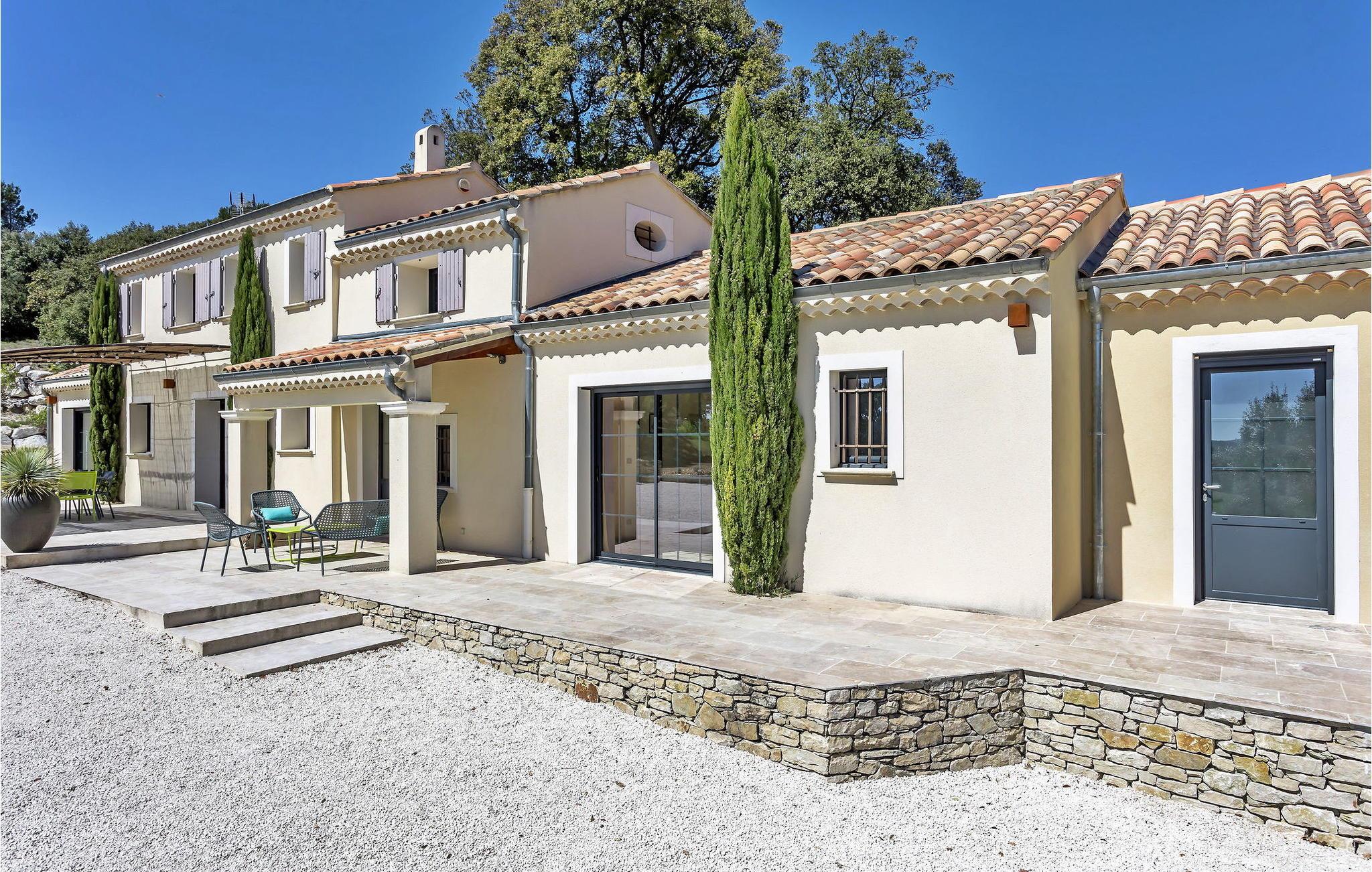 Denne bondegård i Roussas, Drome, Provence, tilbyder et fredfyldt tilflugtssted i et smagfuldt indrettet rum midt i det rolige landskab. I stueetagen finder du en indbydende stue/spisestue med aircondition, møbleret med et tv, sofa, lænestole og et sofabord. Nyd varmen fra en brændeovn. Det åbne køkken er veludstyret for bekvemmelighed. Der er to soveværelser med aircondition i stueetagen. Ovenpå finder du yderligere to soveværelser, det ene med køjesenge. Udenfor kan du nyde det store uindhegnede land og en skyggefuld terrasse til udendørs spisning. Den private opvarmede pool, sikret af en elektrisk skodde, tilbyder afslapning med liggestole og panoramaudsigt over landskabet. Et poolhus med faciliteter fuldender dette udendørs rum. Stuehuset er beliggende i et meget roligt og naturligt miljø ca. 1 km fra landsbyen (lille restaurant, brødbutik). Første butikker inden for 5 km. I Valaurie (2 km) finder du nogle små butikker og en Intermarché i Grignan. Der er forskellige vandrestier i det omkringliggende landskab, opdag de provencalske landsbyer og markeder i regionen (Grignan, Nyons). Den nærmeste by er Grignan (10 km).
