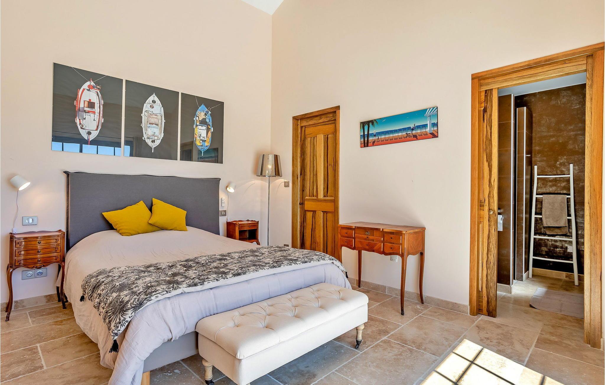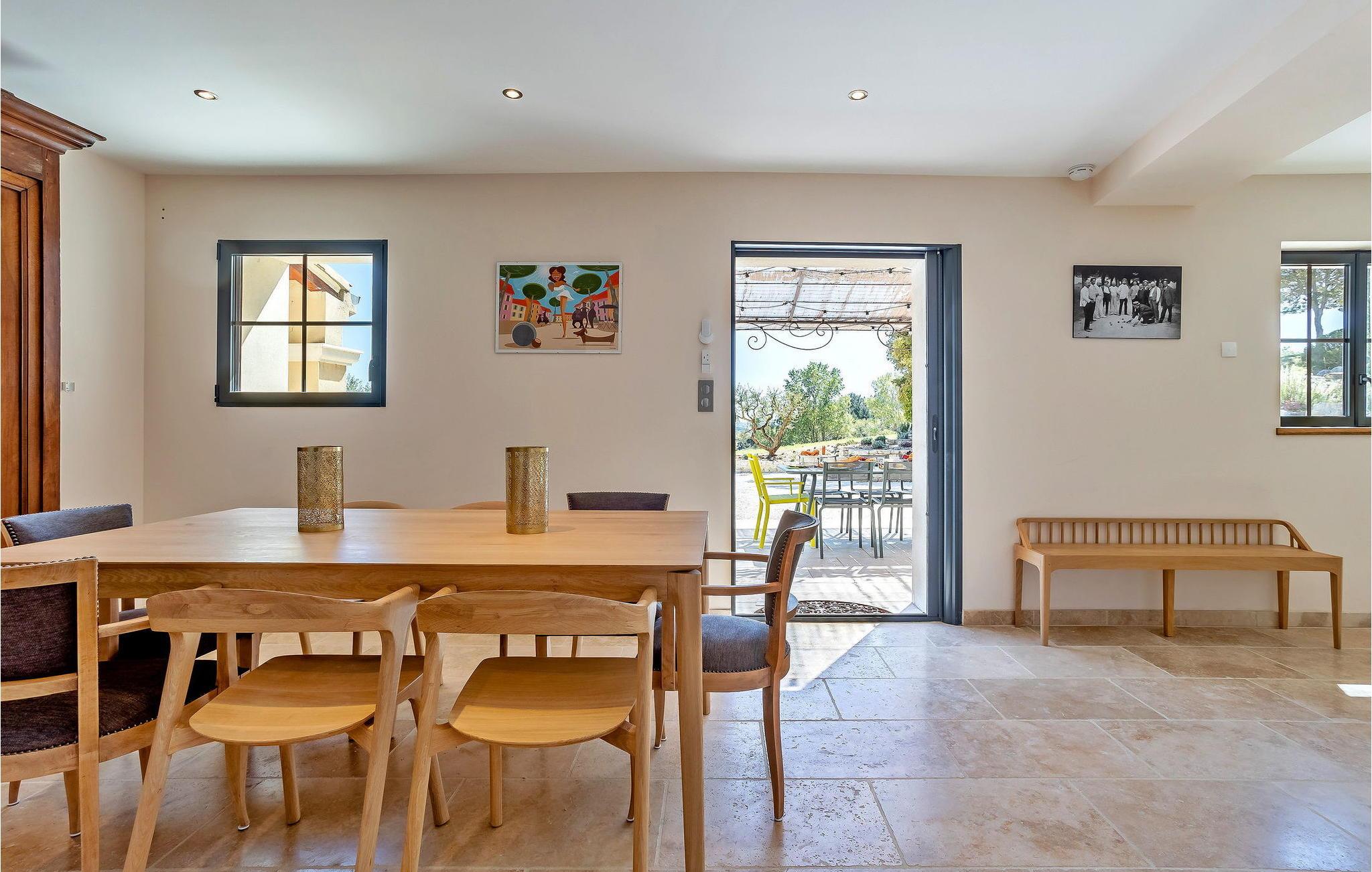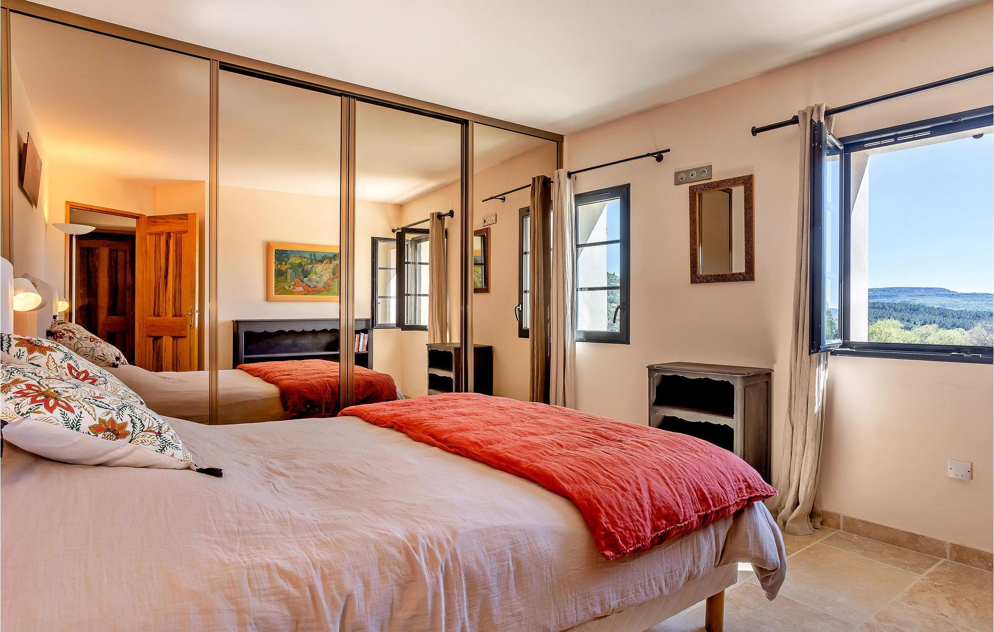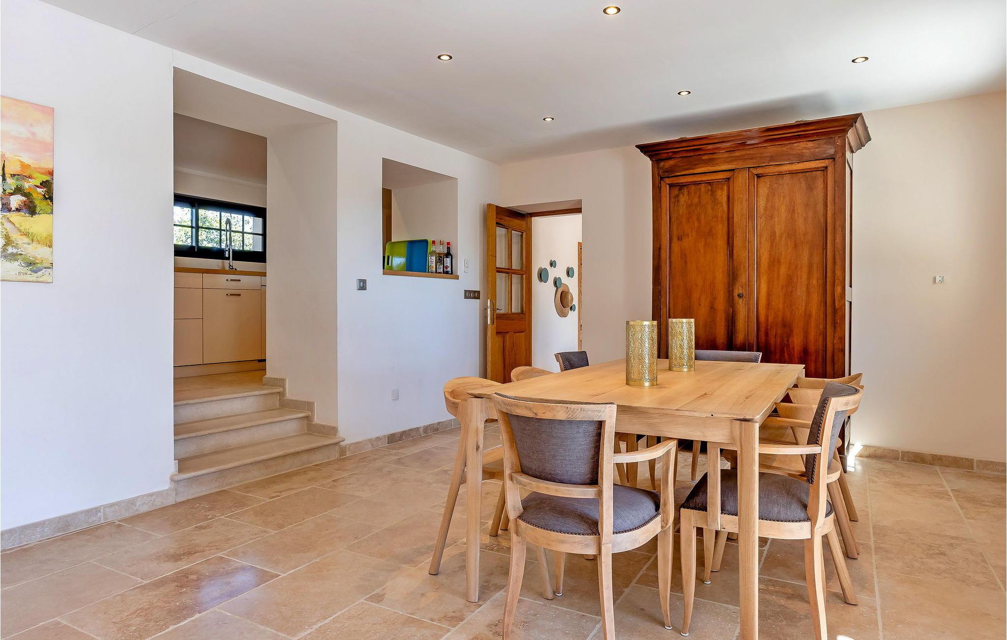 Denne bondegård i Roussas, Drome, Provence, tilbyder et fredfyldt tilflugtssted i et smagfuldt indrettet rum midt i det rolige landskab. I stueetagen finder du en indbydende stue/spisestue med aircondition, møbleret med et tv, sofa, lænestole og et sofabord. Nyd varmen fra en brændeovn. Det åbne køkken er veludstyret for bekvemmelighed. Der er to soveværelser med aircondition i stueetagen. Ovenpå finder du yderligere to soveværelser, det ene med køjesenge. Udenfor kan du nyde det store uindhegnede land og en skyggefuld terrasse til udendørs spisning. Den private opvarmede pool, sikret af en elektrisk skodde, tilbyder afslapning med liggestole og panoramaudsigt over landskabet. Et poolhus med faciliteter fuldender dette udendørs rum. Stuehuset er beliggende i et meget roligt og naturligt miljø ca. 1 km fra landsbyen (lille restaurant, brødbutik). Første butikker inden for 5 km. I Valaurie (2 km) finder du nogle små butikker og en Intermarché i Grignan. Der er forskellige vandrestier i det omkringliggende landskab, opdag de provencalske landsbyer og markeder i regionen (Grignan, Nyons). Den nærmeste by er Grignan (10 km).