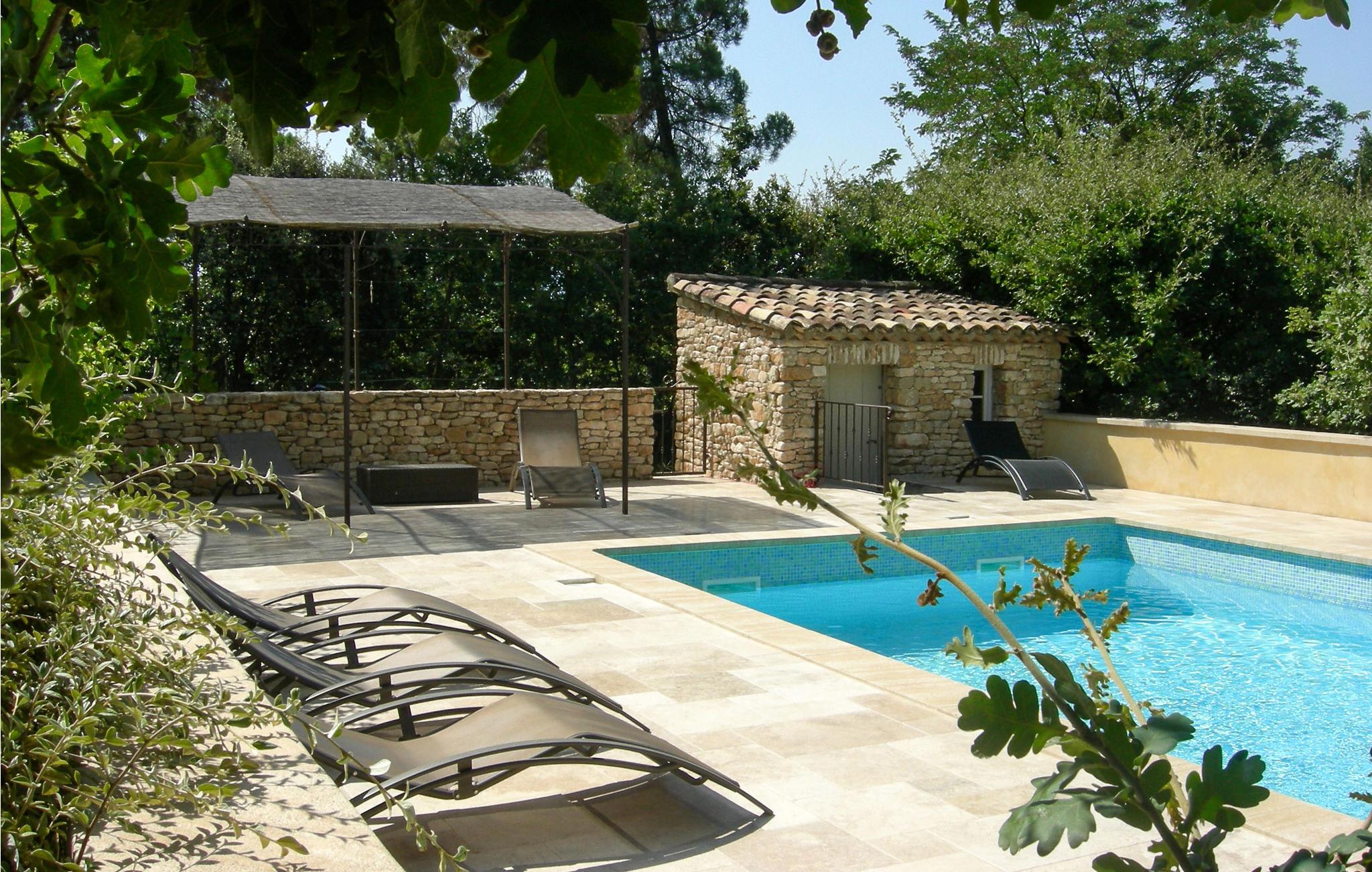 På denne afsondrede, skovklædte grund på 4000 m2 kan du slappe fuldstændigt af. Den store pool tilbyder afkøling og masser af badesjov på varme sommerdage. Der er også både solrige og skyggefulde liggestole ved kanten af swimmingpoolen, hvor du kan ligge og slikke sol eller læse en god bog. Ydermere er der en lille terrasse på den anden side af huset. Her kan du drikke din morgenkaffe eller et godt glas vin om aftenen.