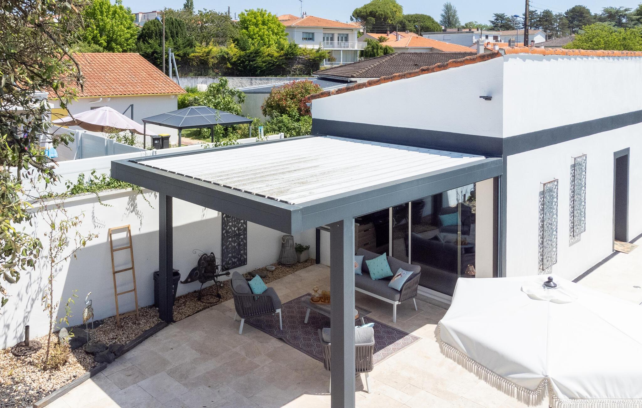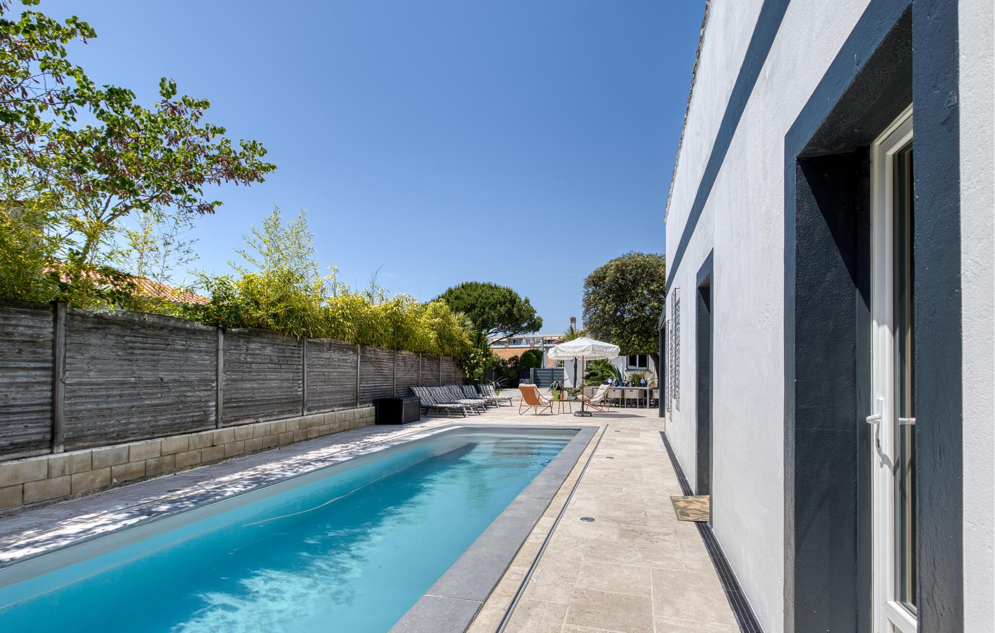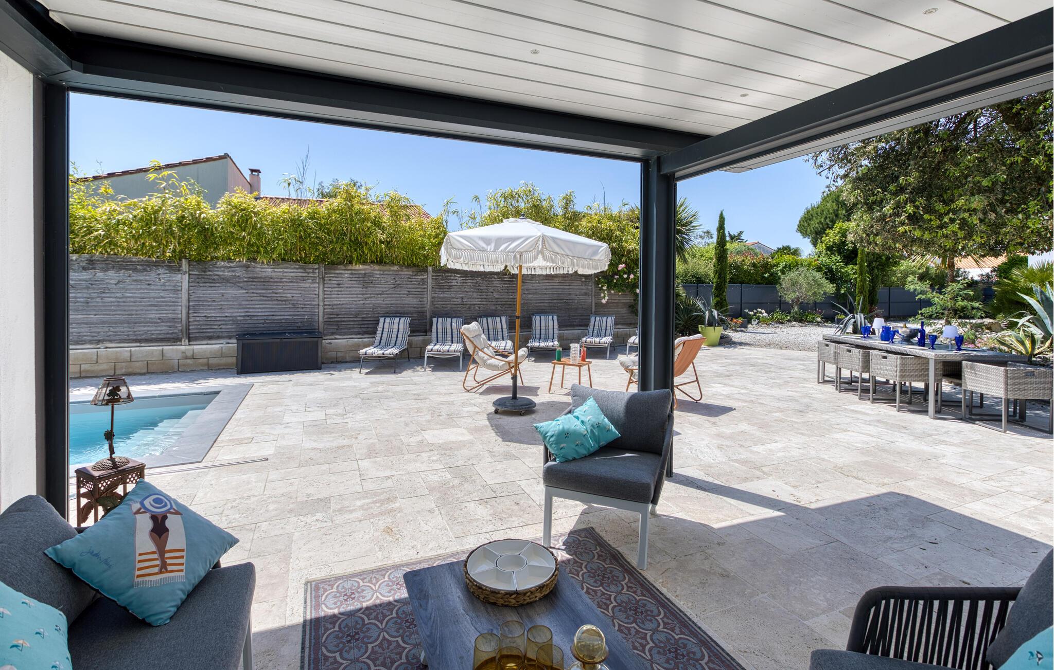 Det store udendørsområde indbyder til skønne timer i det fri. Tag en forfriskende dukkert i poolen, nyd solen på en liggestol, spil bordtennis, hyg jer med en kølig drik i den indbydende lounge, og nyd lune sommeraftener med vin og stearinlys.