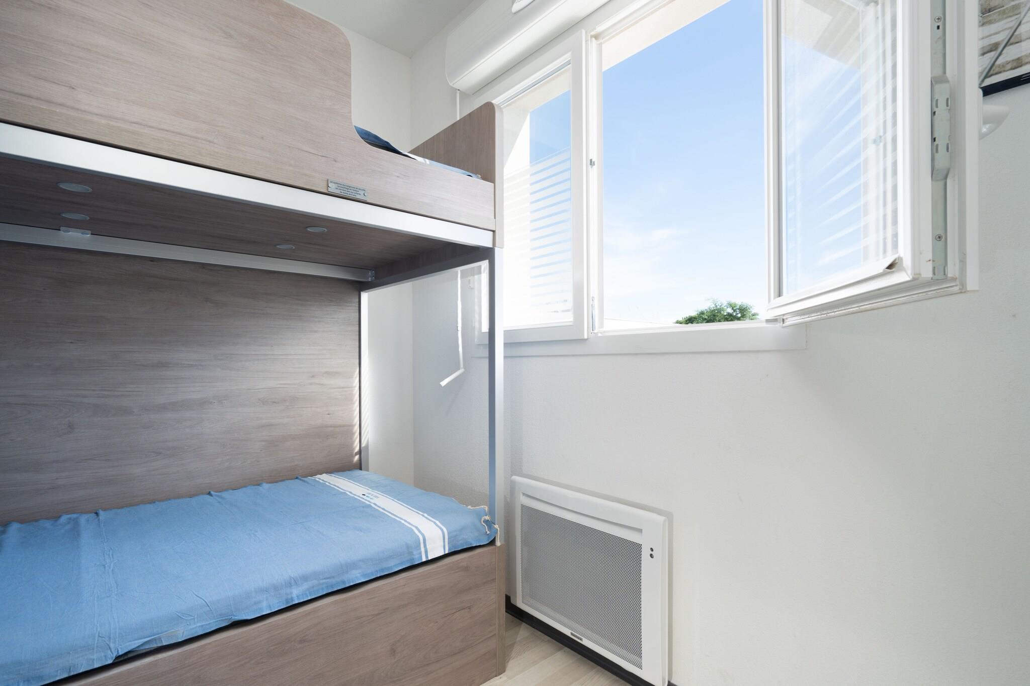 Denne lyse og indbydende villa på 55 m² i Sérignan tilbyder et afslappende tilflugtssted for op til 6 gæster, med 2 soveværelser og en indbydende atmosfære, der er ideel for familier. Kun 450 meter fra sandstranden og 1 km fra både et supermarked og en restaurant, kombinerer det charme ved havet med dagligdags bekvemmelighed. Villaen har en privat indhegnet have, en terrasse med havemøbler og en grill, perfekt til at nyde måltider udendørs eller slappe af i solen. Gæsterne drager fordel af aircondition, elvarme, Wi-Fi og adgang til en fælles opvarmet swimmingpool. Udendørs parkering og et tv tilføjer komforten. Indvendigt er det elektriske køkken i åbent plan fuldt udstyret med køleskab, mikroovn, opvaskemaskine, kaffemaskine, brødrister og alle nødvendige tallerkener og redskaber, hvilket sikrer et glat og behageligt ophold for hver gæst.