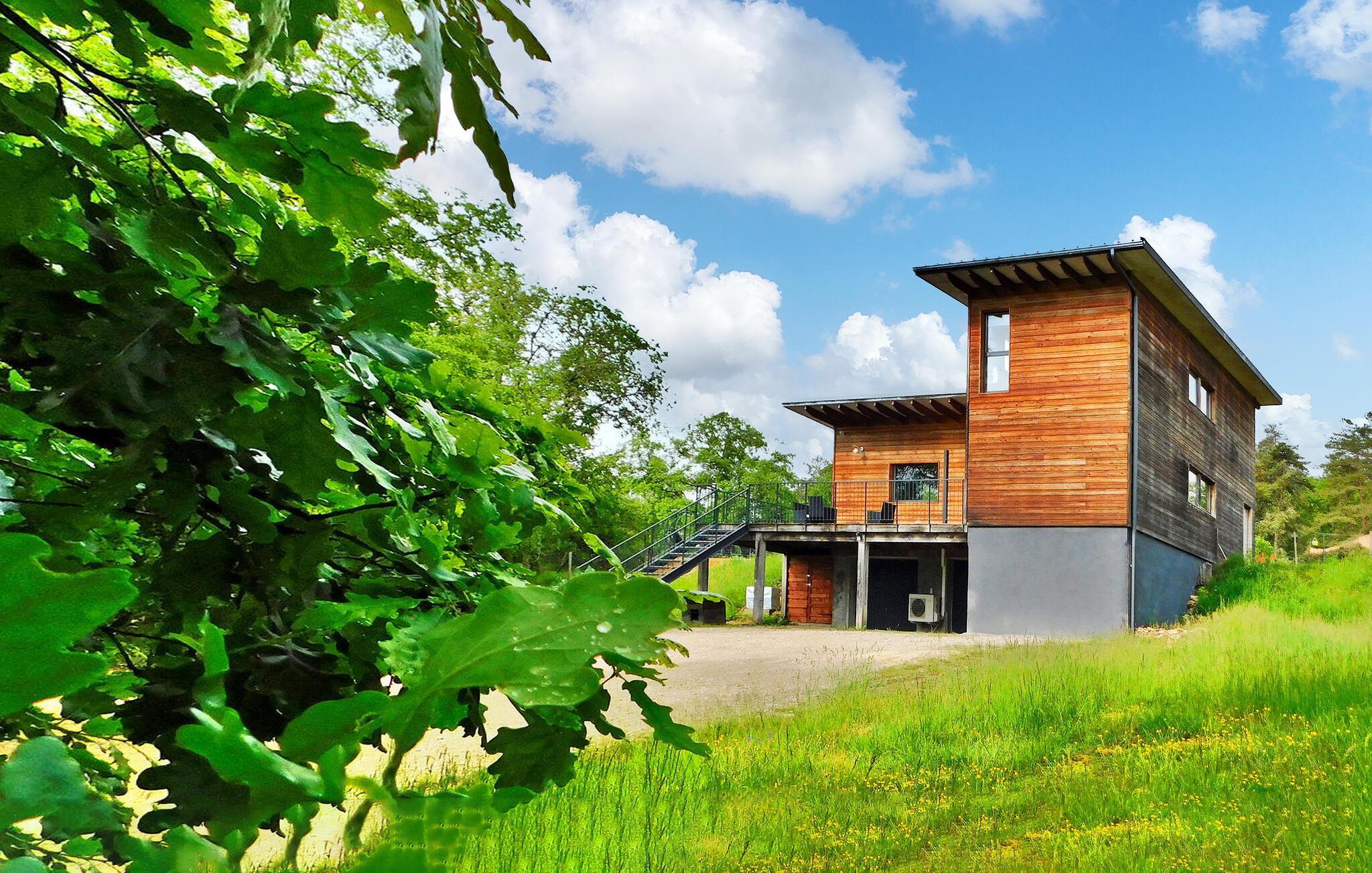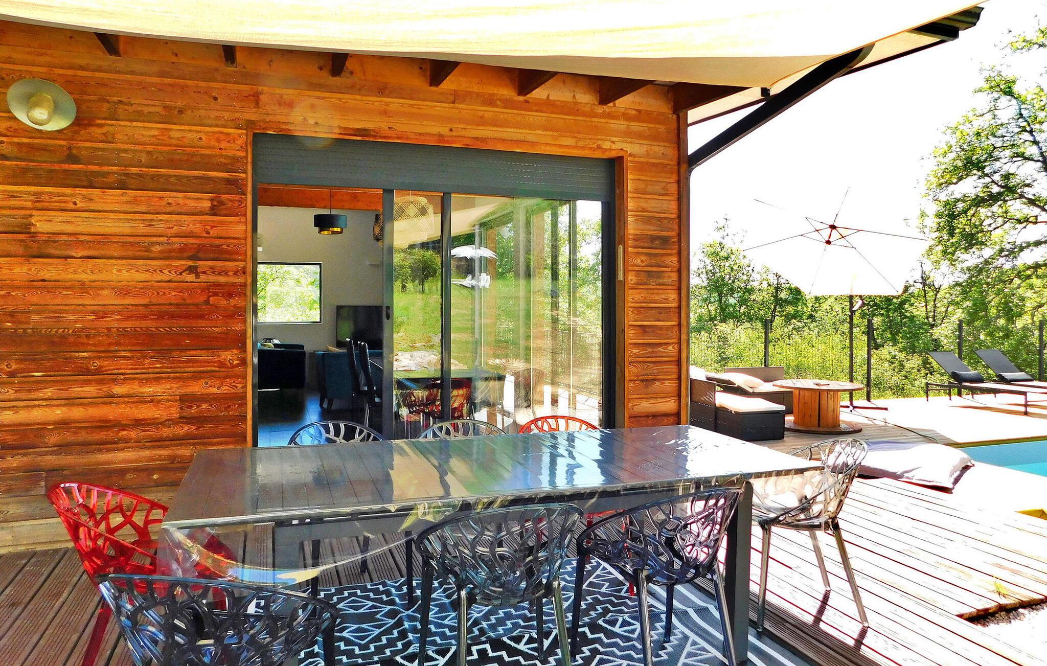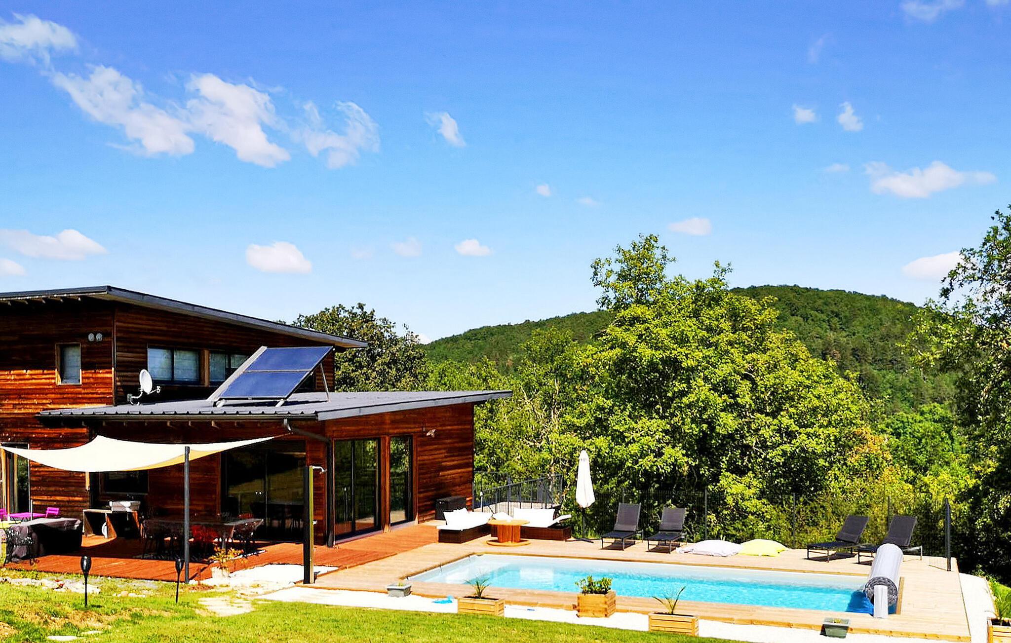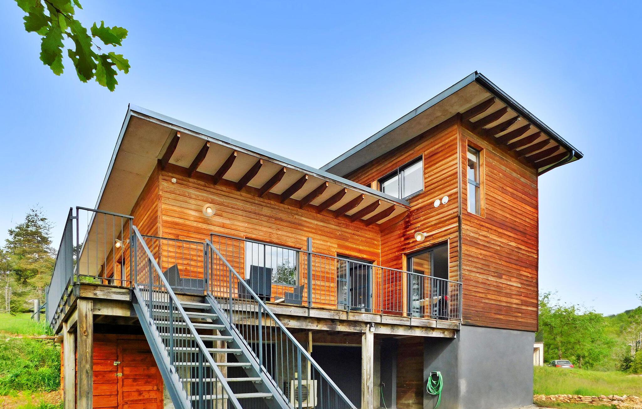 Dette moderne træferiehus i Dordogne ligger i rolige landlige omgivelser nær Saint Amand de Coly. Huset har et airconditioneret og lysende stueetage med en hyggelig opholdsstue, spiseplads og et åbent køkken udstyret med essentielle apparater. Stueetagen rummer desuden to soveværelser, hvoraf det ene er indrettet med køjesenge og et fodboldbord til børn. Ovenpå er der to soveværelser med aircondition og et fælles brusebad. Udenfor byder ejendommen på en privat opvarmet swimmingpool, legeplads med trampolin og legehus, flere terrasser med udendørsmøbler og plancha. Bemærk venligst, at hovedadgangen er gennem en trætrappe med gelændere og en adgangslåge. Om vinteren er opvarmning leveret af en pilleovn. Huset ligger på landet uden for landsbyen Saint-Amand-de-Coly (lokal købmand, restaurant og brøddepot).