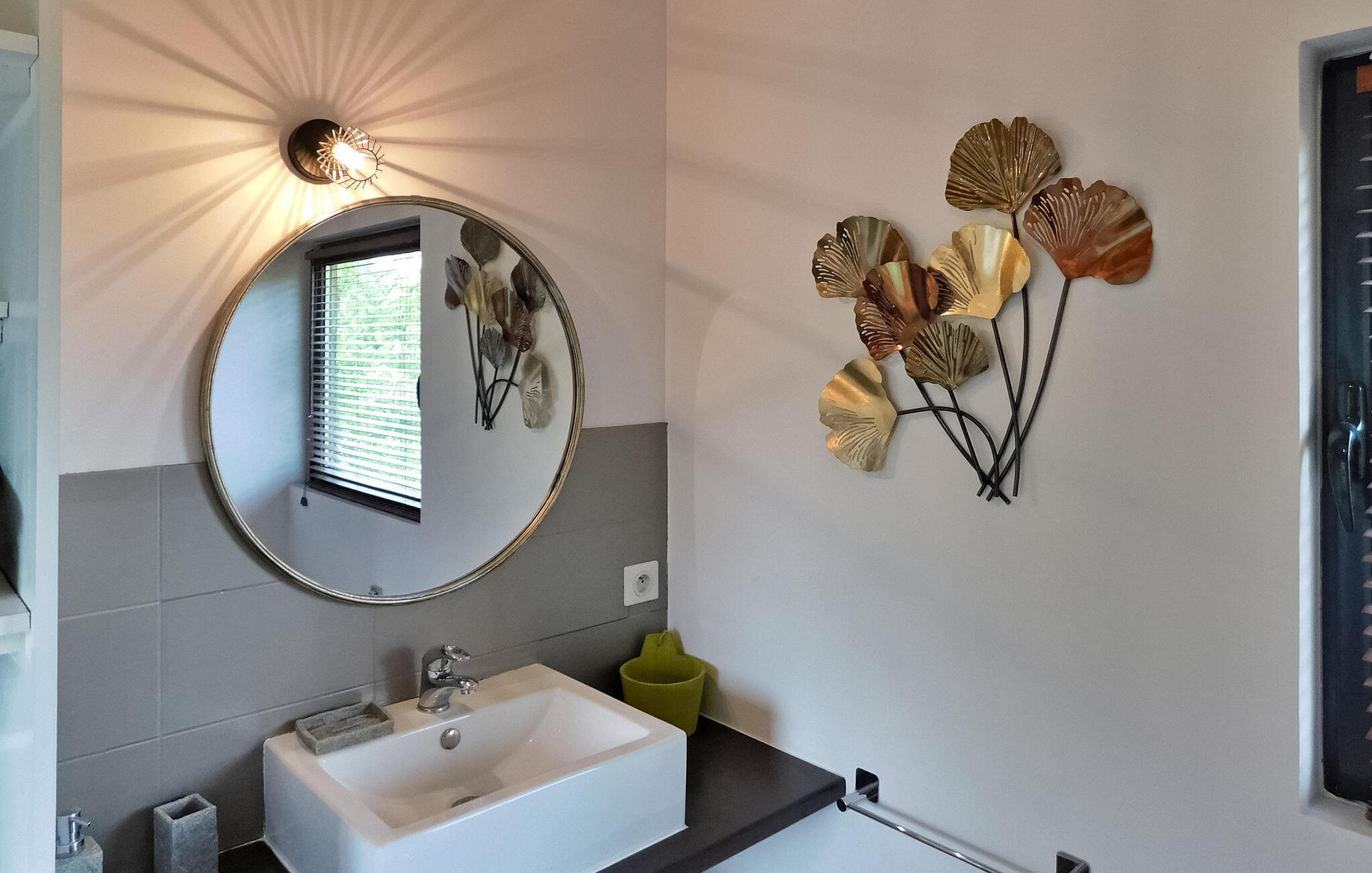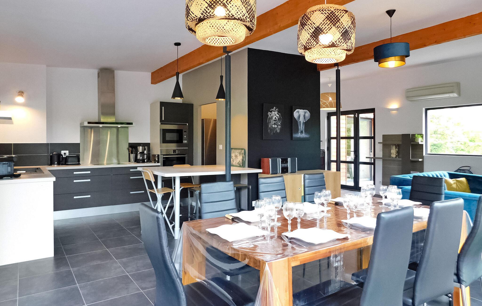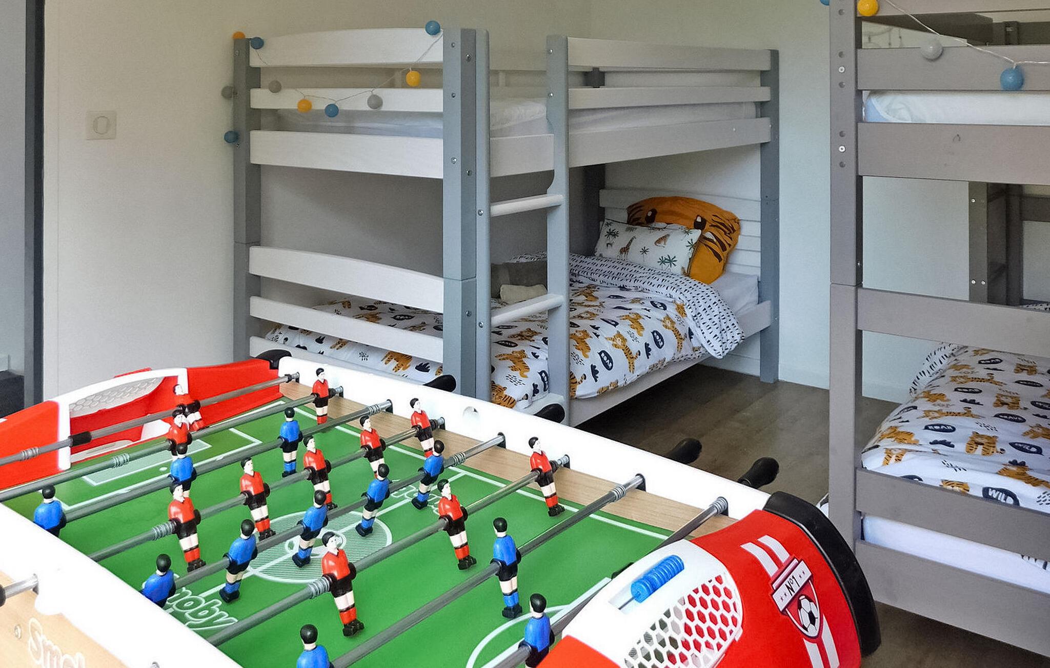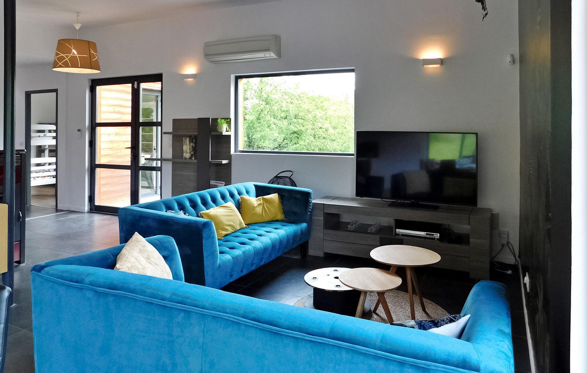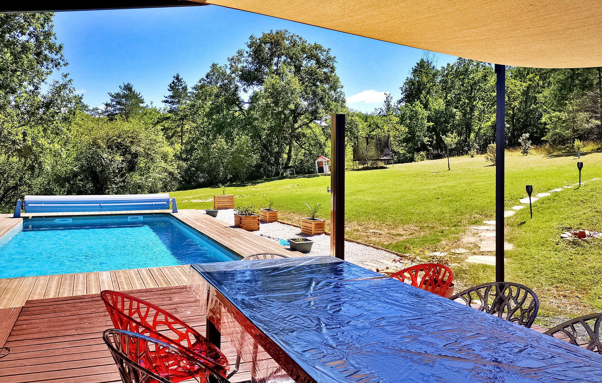 Dette moderne træferiehus i Dordogne ligger i rolige landlige omgivelser nær Saint Amand de Coly. Huset har et airconditioneret og lysende stueetage med en hyggelig opholdsstue, spiseplads og et åbent køkken udstyret med essentielle apparater. Stueetagen rummer desuden to soveværelser, hvoraf det ene er indrettet med køjesenge og et fodboldbord til børn. Ovenpå er der to soveværelser med aircondition og et fælles brusebad. Udenfor byder ejendommen på en privat opvarmet swimmingpool, legeplads med trampolin og legehus, flere terrasser med udendørsmøbler og plancha. Bemærk venligst, at hovedadgangen er gennem en trætrappe med gelændere og en adgangslåge. Om vinteren er opvarmning leveret af en pilleovn. Huset ligger på landet uden for landsbyen Saint-Amand-de-Coly (lokal købmand, restaurant og brøddepot).