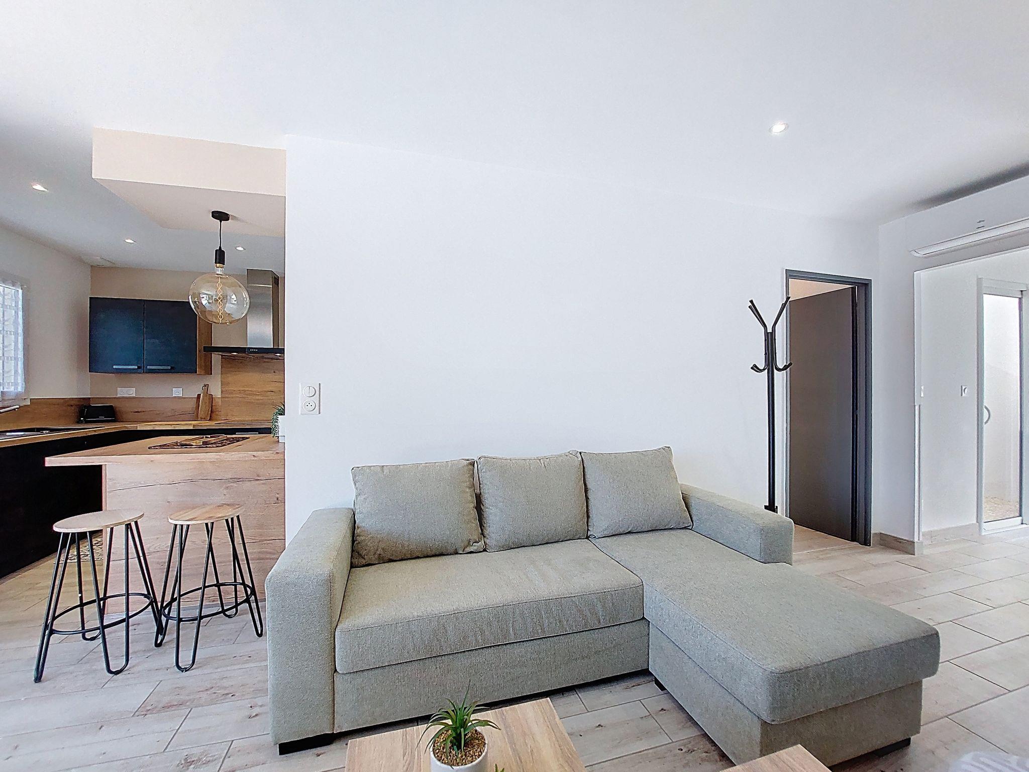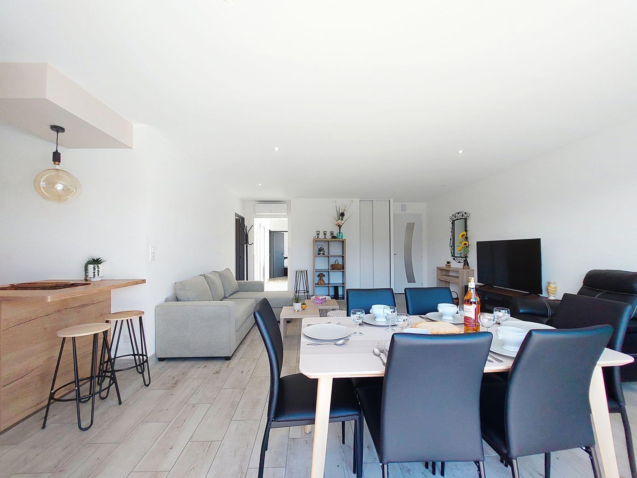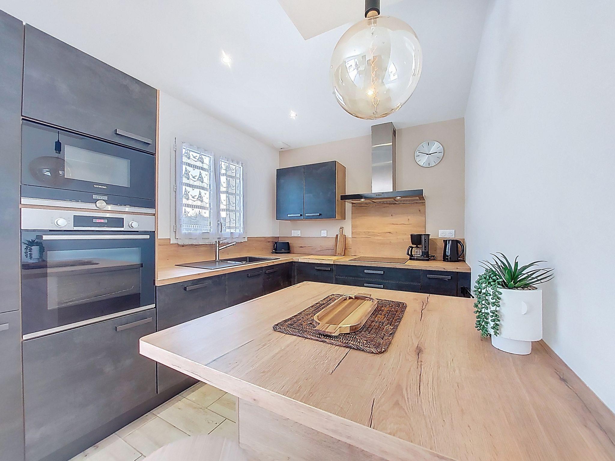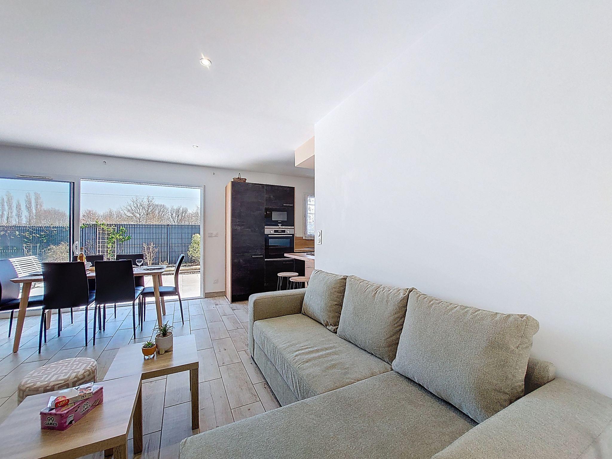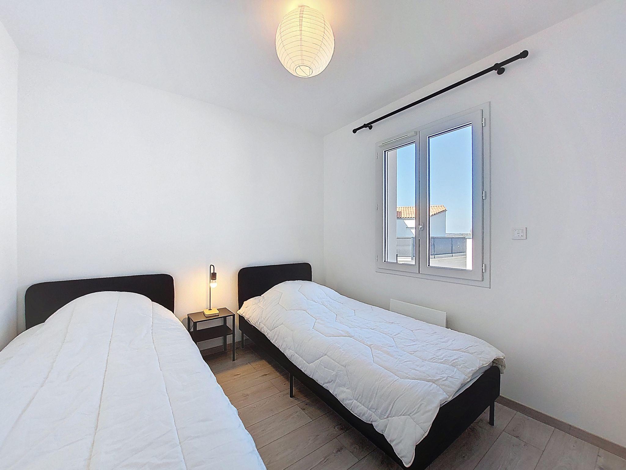 4-room terraced house 94 m2, south-west facing position. Modern furnishings: living/dining room with TV (flat screen), air conditioning. Exit to the terrace. 1 room with 1 french bed (1 x 160 cm, length 190 cm). 1 room with 1 french bed (1 x 140 cm, length 190 cm). 1 room with 2 beds (90 cm, length 190 cm). Open kitchen (oven, dishwasher, 3 induction hot plates, toaster, kettle, microwave, freezer, electric coffee machine). Shower, sep. WC. Large terrace 60 m2. Terrace furniture, electric barbecue. Facilities: washing machine, children's high chair, baby cot. Internet (WiFi, free). Parking (2 cars). Please note: maximum 1 pet/ dog allowed. Smoke alarm. Offer by a private individual according to Art. 155, IV of CGI.