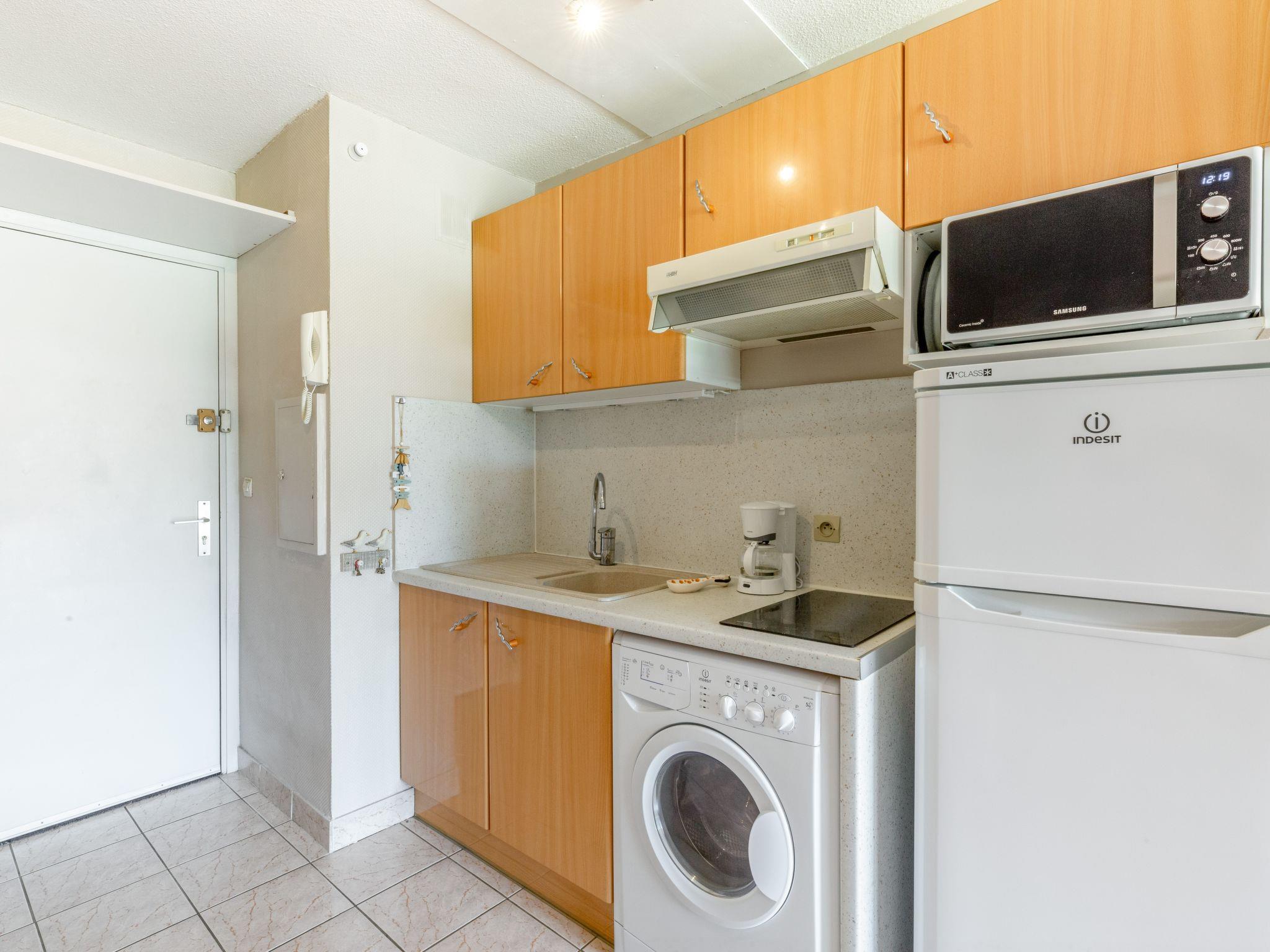 1-room apartment 22 m2, on the upper ground floor, south facing position. Simple furnishings: living/sleeping room with panoramic window with 1 sofabed (140 cm, length 190 cm), dining table and TV (flat screen), air conditioning. Exit to the terrace. Kitchenette (2 induction hot plates, toaster, microwave, freezer, electric coffee machine). Shower/WC. Electric heating. Large terrace 16 m2 partly. View of the swimming pool. Facilities: washing machine, hair dryer. Internet (WiFi, extra). Parking space n 27. Please note: TV only FR. Smoke alarm. 4LCXUQ