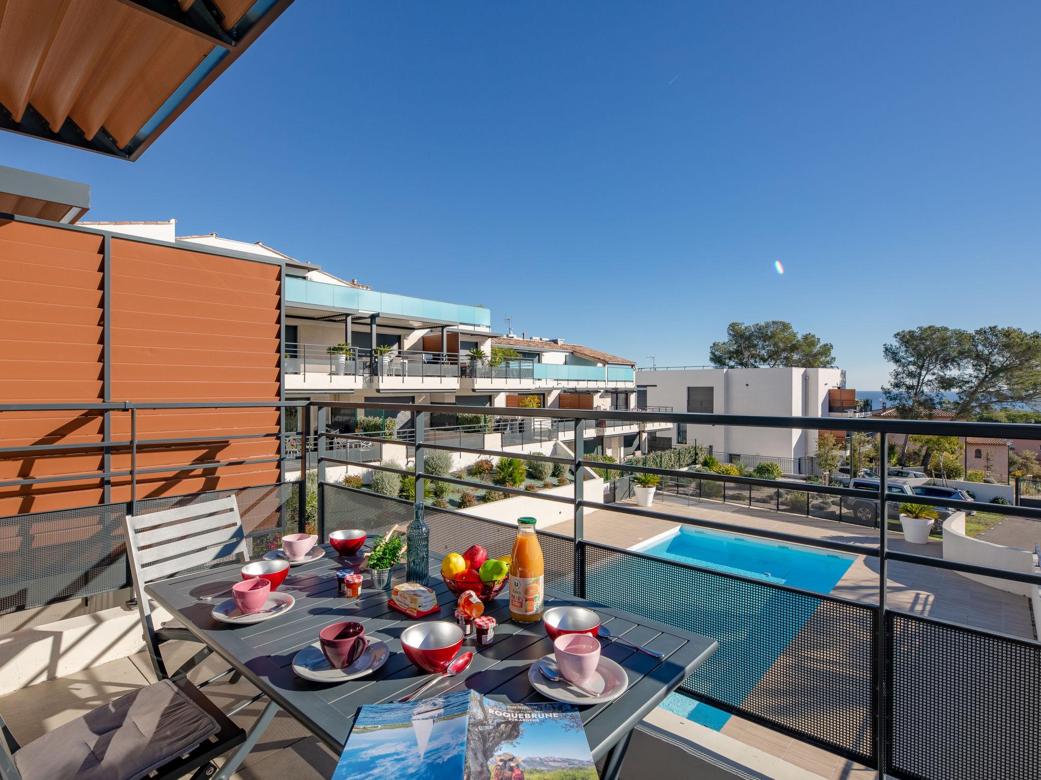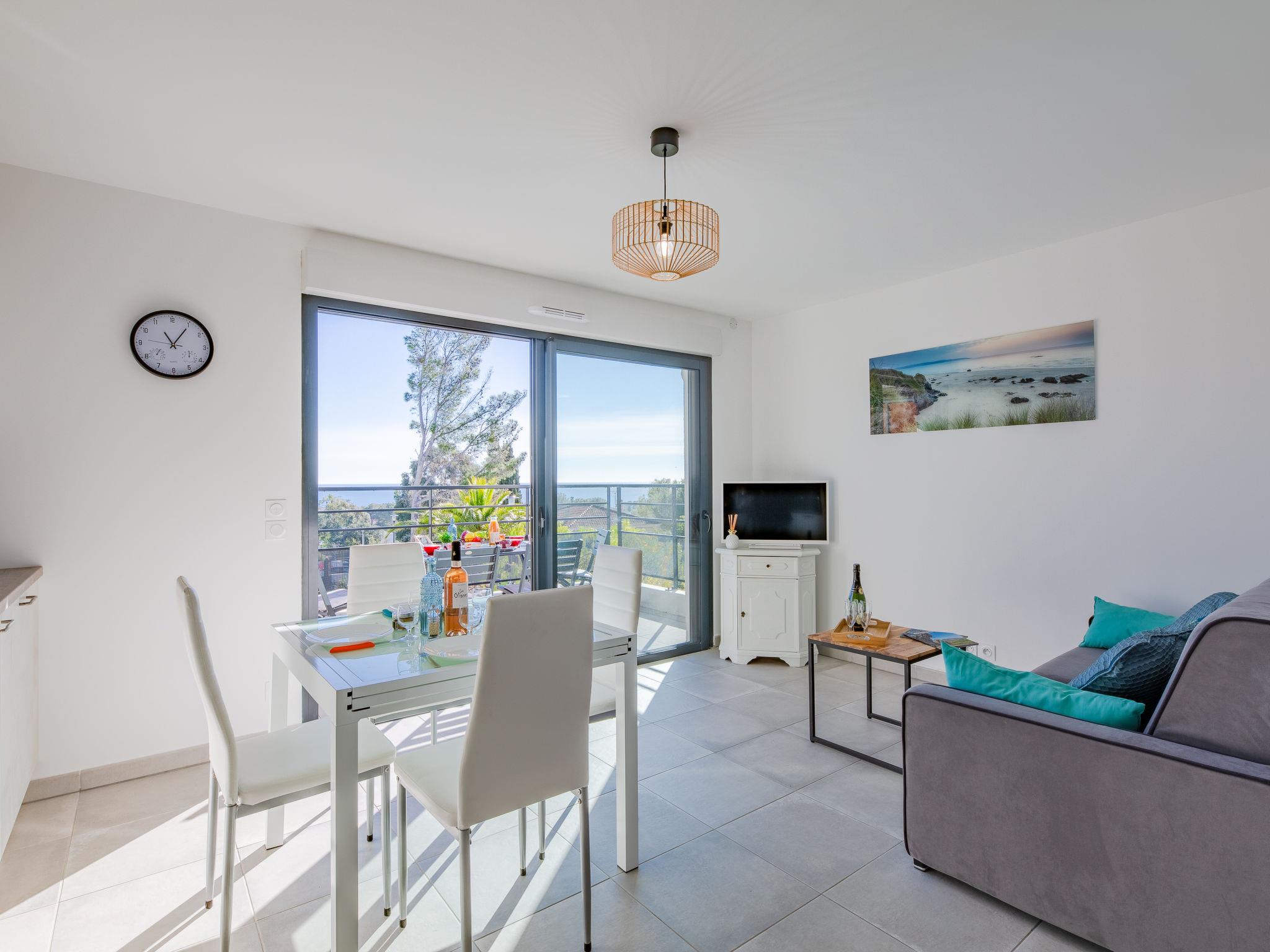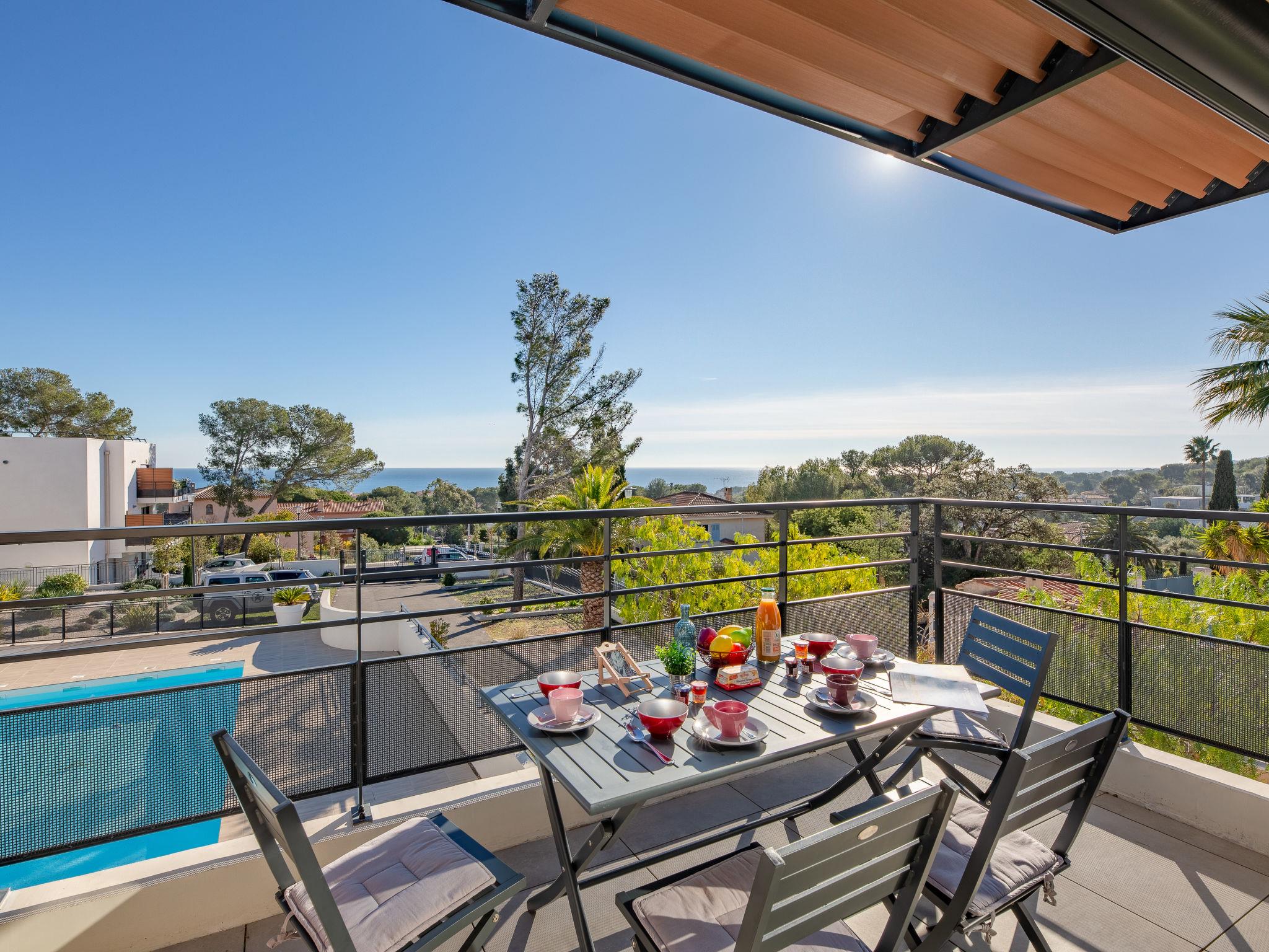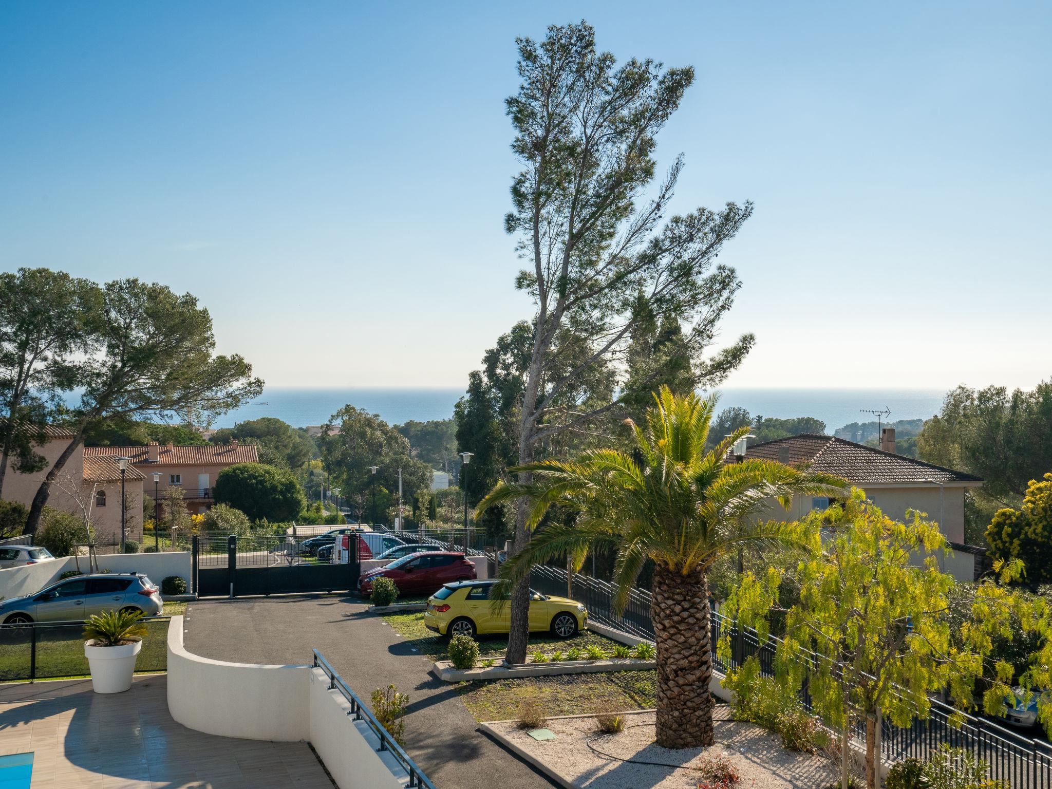 2-room apartment 42 m2 on 1st floor. Comfortable and cosy furnishings: living/dining room 20 m2 with panoramic window with 1 double sofabed (1 x 140 cm, length 190 cm), TV (flat screen), air conditioning. Exit to the terrace. 1 room 12 m2 with Dressing room with 1 french bed (1 x 140 cm, length 190 cm), air conditioning. Open kitchen (oven, dishwasher, 3 induction hot plates, toaster, kettle, microwave, freezer, electric coffee machine). Exit to the terrace. Shower/WC. Air-conditioning. Terrace 8 m2 partly roofed, south-east facing position. Terrace furniture. View of the sea and the swimming pool. Facilities: washing machine, iron, hair dryer. Internet (WiFi, free). Parking space n E12. Please note: smoke alarm, no lift. Offer by a private individual according to Art. 155, IV of CGI. FJS17022445342ERAP