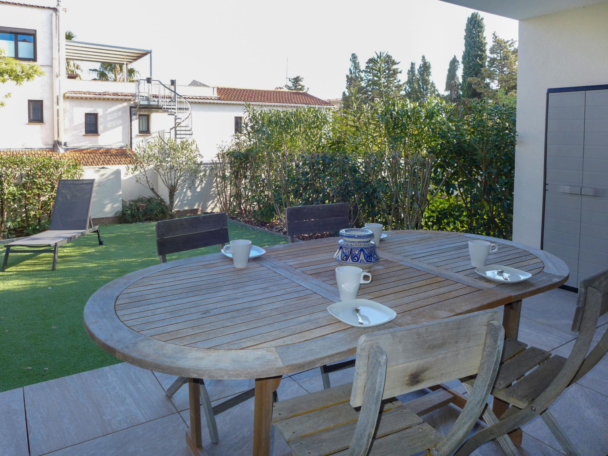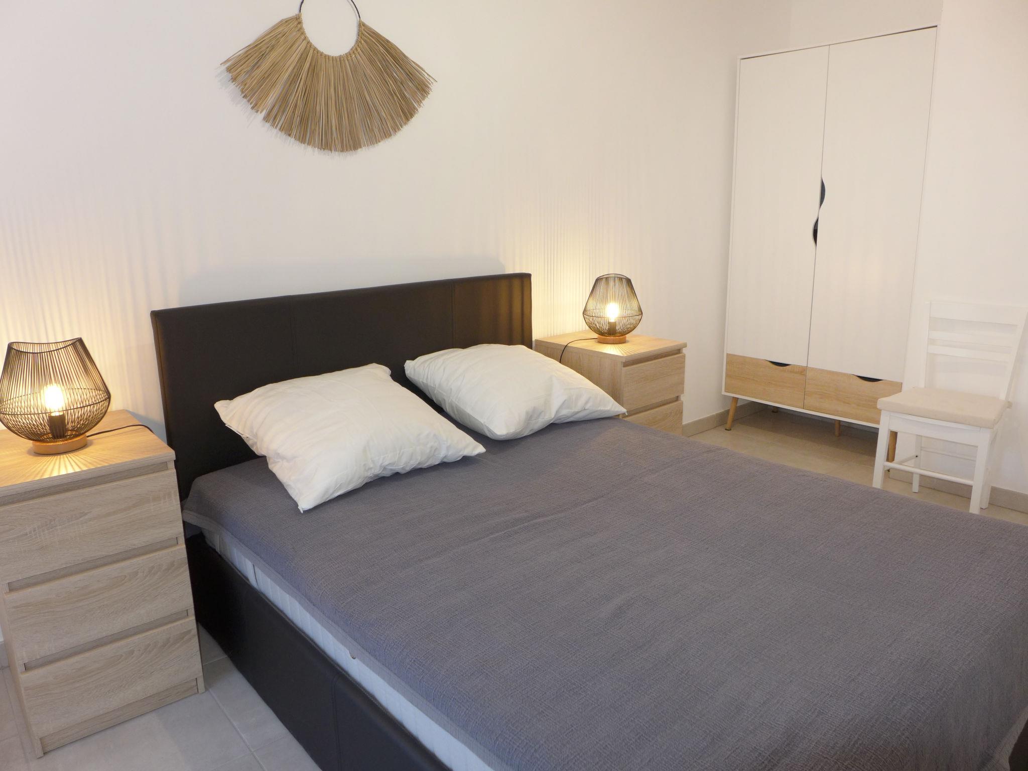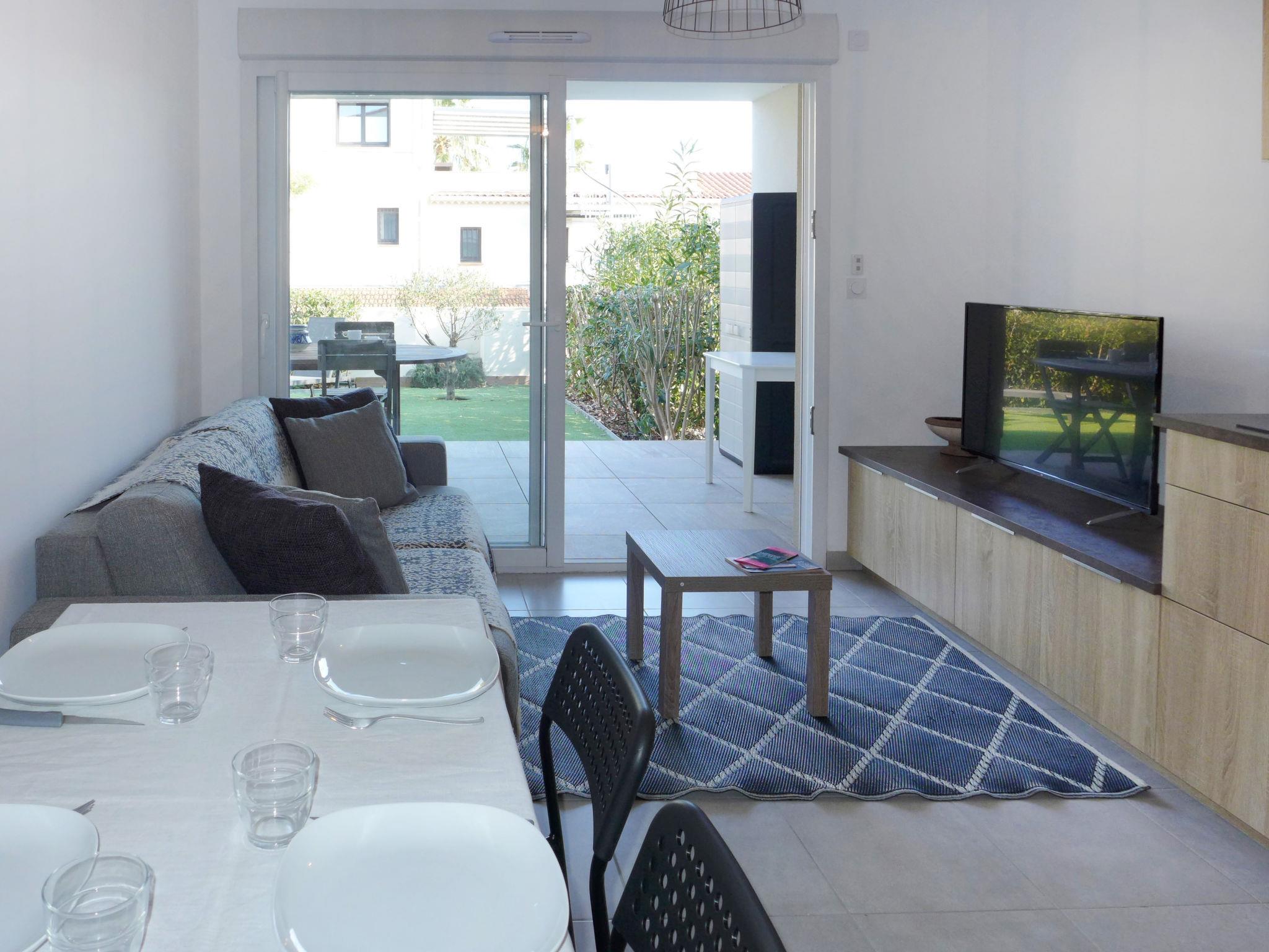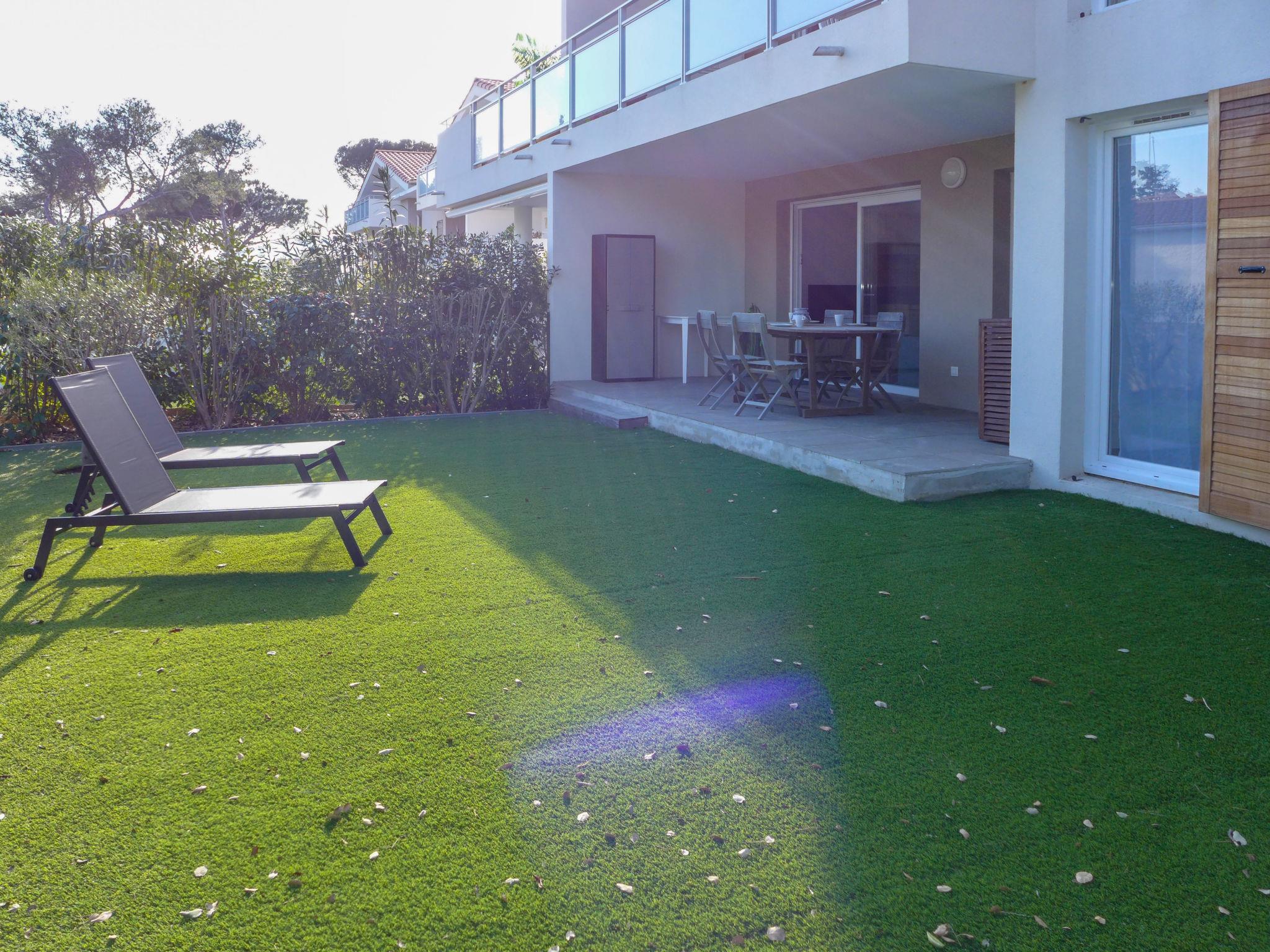 3-room apartment 55 m2, on the ground floor, south-east facing position. Beautiful and modern furnishings: living/dining room with panoramic window with TV (flat screen), air conditioning and electric shutters. Exit to the garden, to the terrace. 1 room with 1 french bed (1 x 140 cm, length 190 cm), TV (flat screen), air conditioning. Exit to the garden, to the terrace. 1 room with 1 french bed (1 x 140 cm, length 190 cm), air conditioning. Exit to the garden, to the terrace. Open kitchen (oven, dishwasher, 3 induction hot plates, toaster, kettle, microwave, freezer, electric coffee machine, Capsules for coffee machine (Nespresso) extra). Shower, sep. WC. Heating. Terrace 15 m2, roofed, garden 73 m2. Terrace furniture, deck chairs (2). View of the garden. Facilities: washing machine, iron, hair dryer. Parking space n 15 (1 car). Please note: suitable for families. Non-smokers only. TV only FR. Smoke alarm. FJS1151HT@