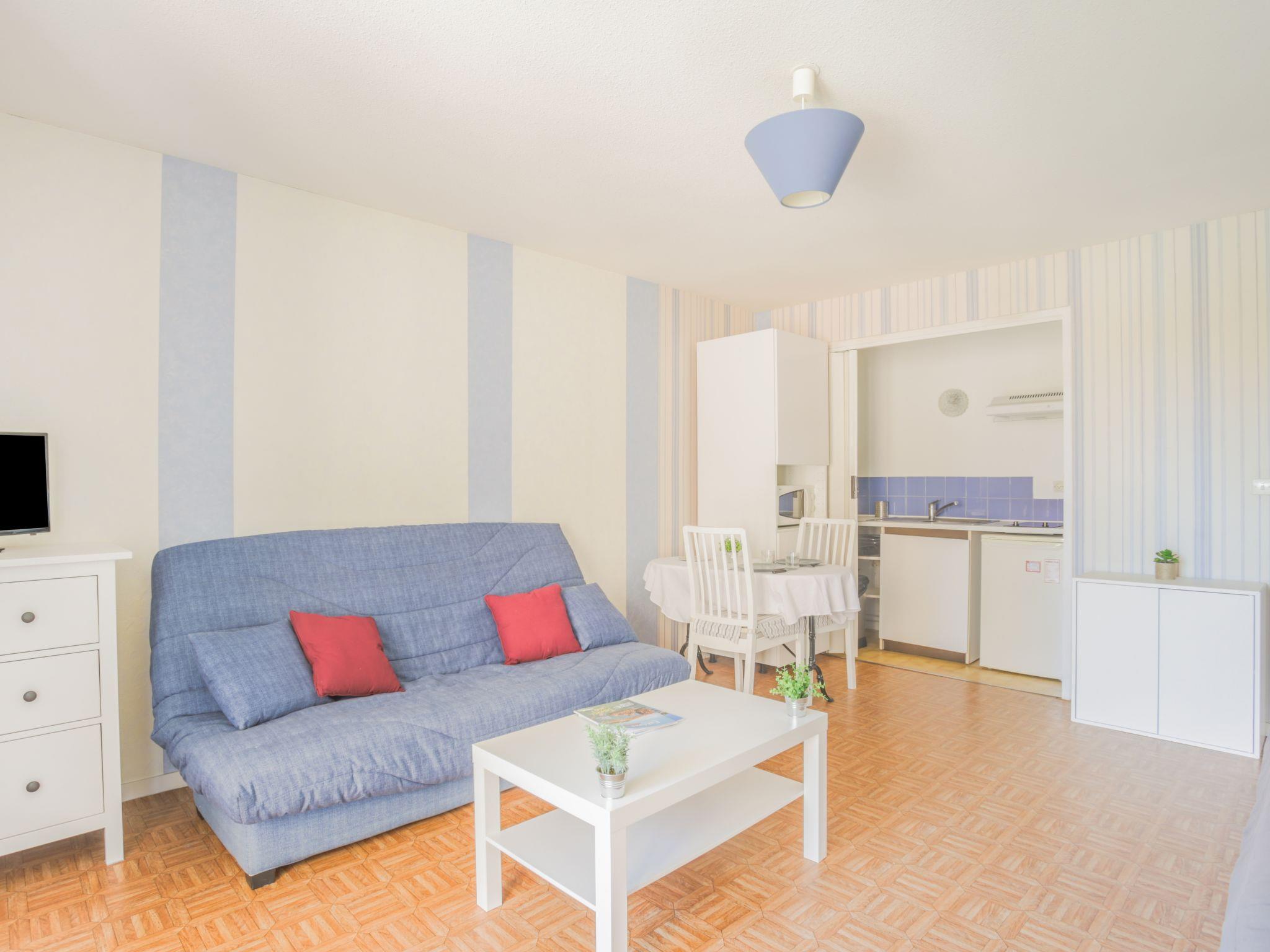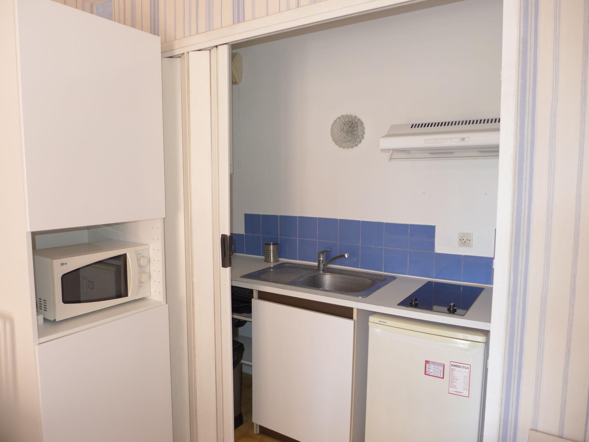 1-room studio 26 m2 on 1st floor, south-east facing position. Simple furnishings: living/dining room with 1 sofabed (140 cm, length 190 cm), TV (flat screen), air conditioning. Exit to the terrace. Kitchenette (2 ceramic glass hob hotplates, toaster, kettle, microwave, electric coffee machine). Bath/WC. Heating. Balcony 3 m2. Balcony furniture. Facilities: iron, hair dryer. Internet (WiFi, extra). Please note: apartment courtyard side. Fridge without freezer. TV only FR. Smoke alarm. C6LYXT