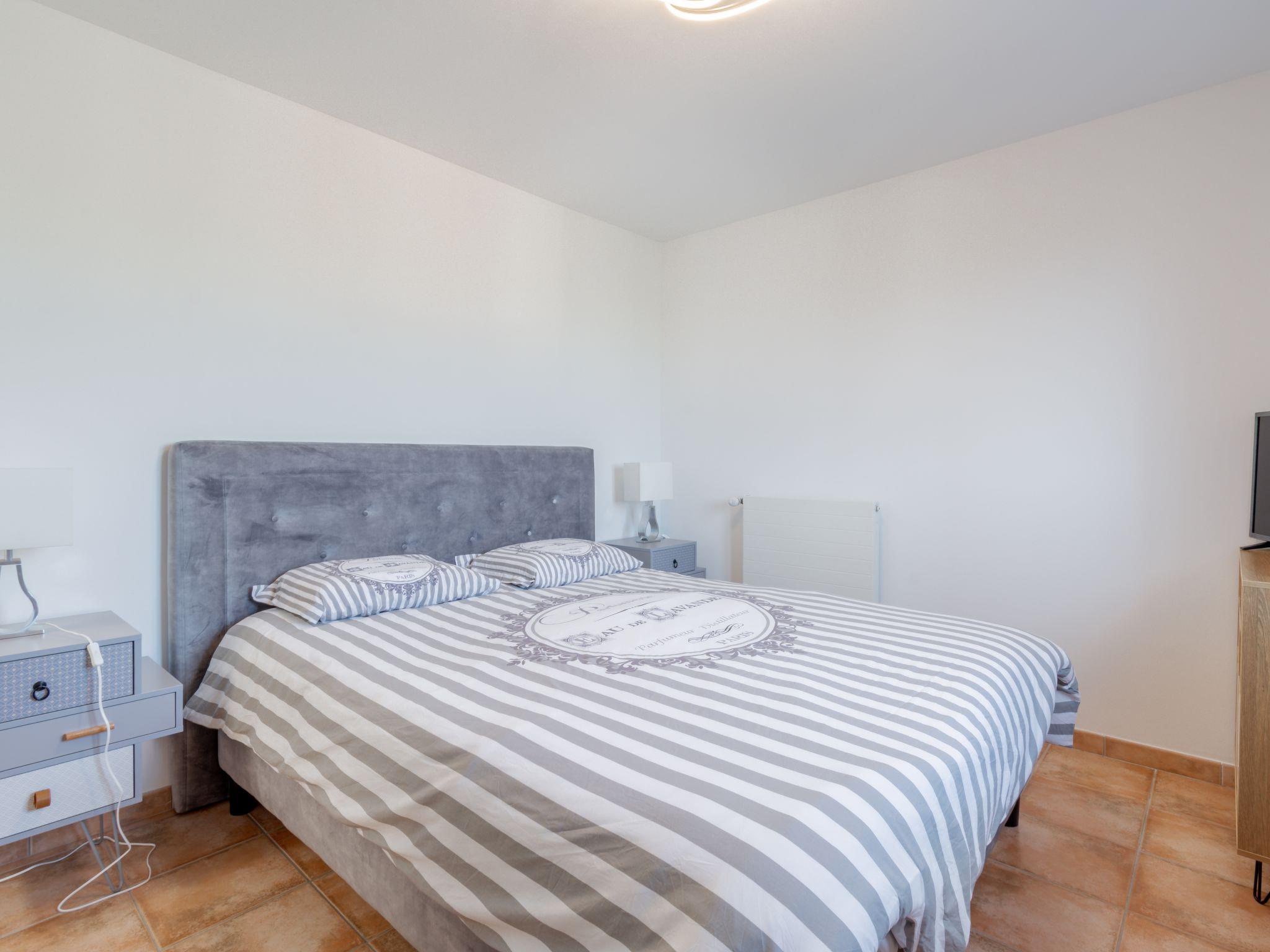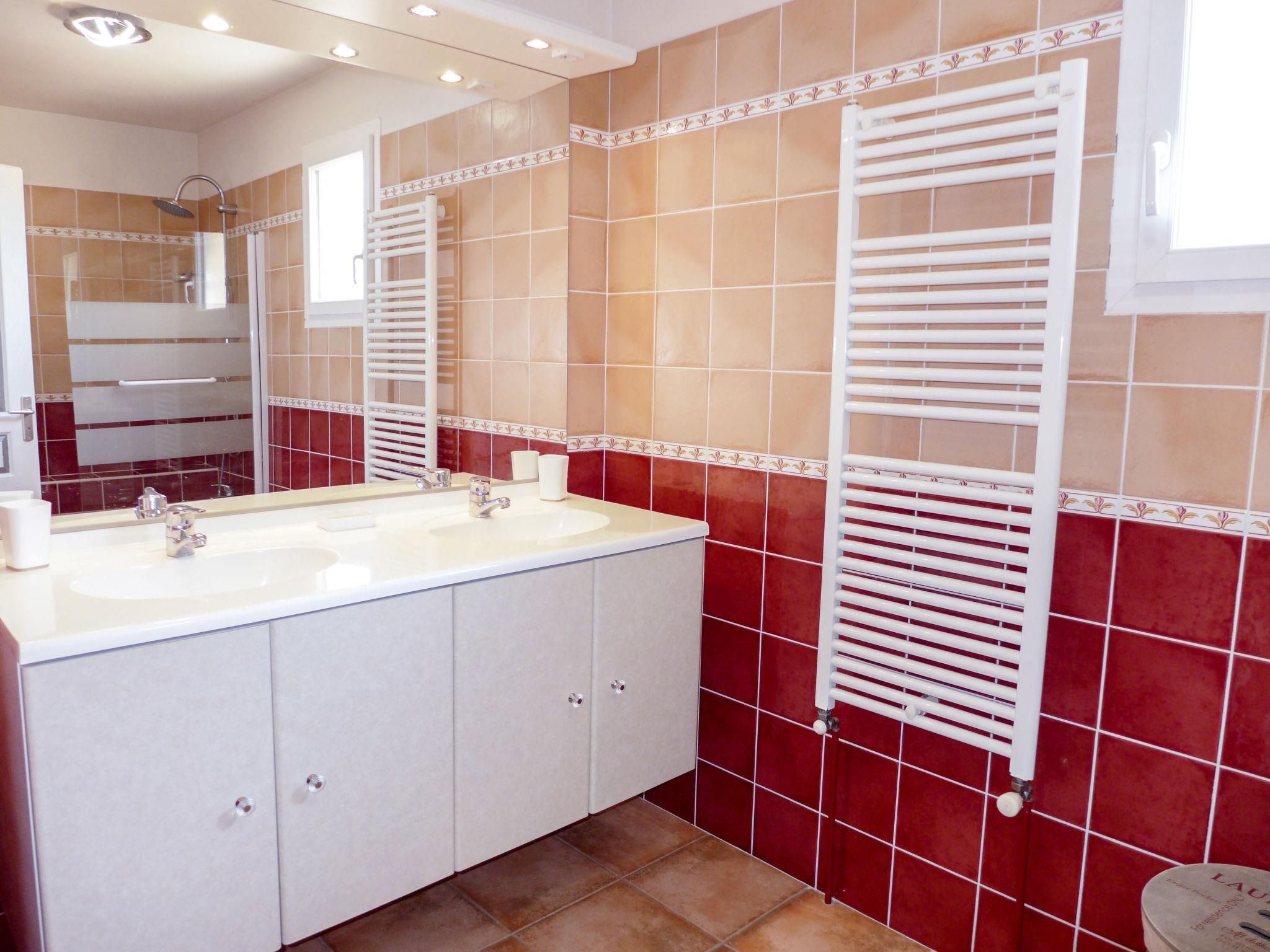 4-room villa 130 m2 on 2 levels. Spacious and bright, comfortable furnishings: living/dining room with TV (flat screen). Exit to the terrace, to the swimming pool. 1 room with 1 french bed (1 x 160 cm, length 200 cm), bathroom and TV (flat screen). Open kitchen (oven, dishwasher, 4 ceramic glass hob hotplates, toaster, kettle, microwave, freezer, electric coffee machine, Capsules for coffee machine (Nespresso L'OR) extra). Sep. WC. Heating, air-conditioning. Upper floor: 1 room with 1 french bed (1 x 160 cm, length 200 cm), TV (flat screen). 1 room with 2 beds (80 cm, length 190 cm), TV (flat screen). Bathroom, sep. WC, double hand-basin. Air-conditioning. Terrace 15 m2, roofed, south facing position. Terrace furniture, barbecue, deck chairs (2). View of the swimming pool. Facilities: washing machine, iron, hair dryer. Internet (WiFi, free). Parking (fenced 2 cars). Please note: non-smoking house. Smoke alarm. 6TH53E
