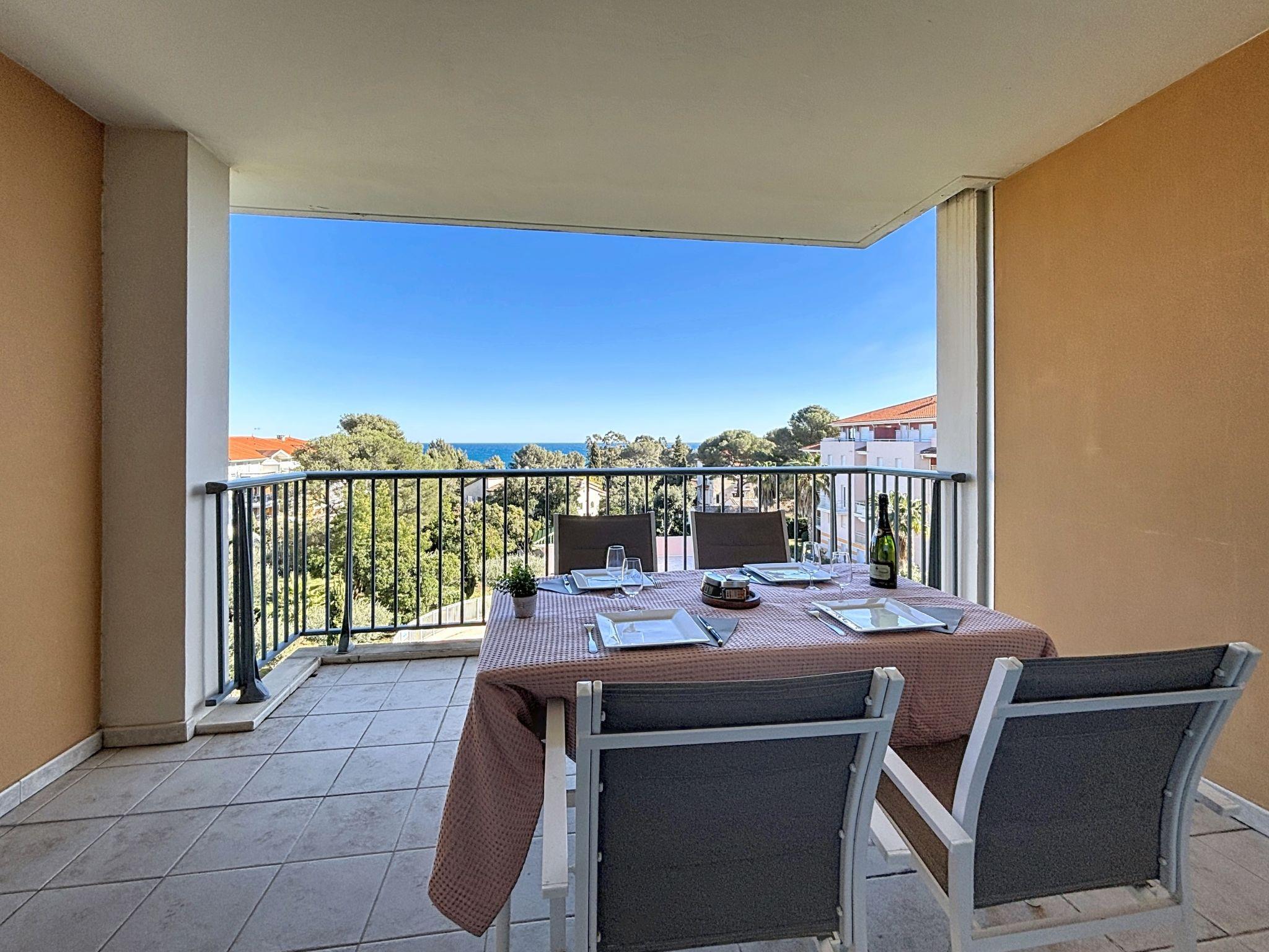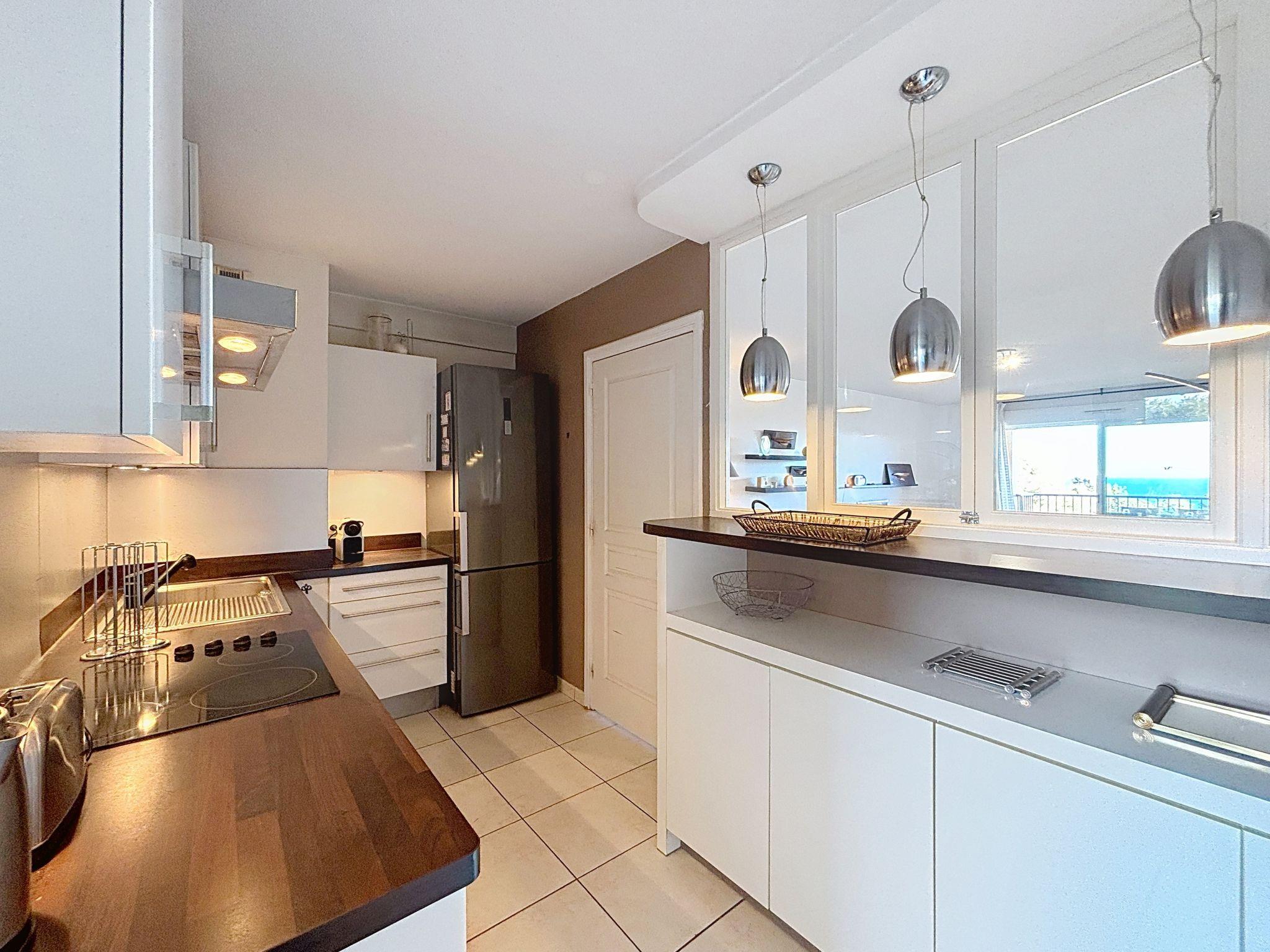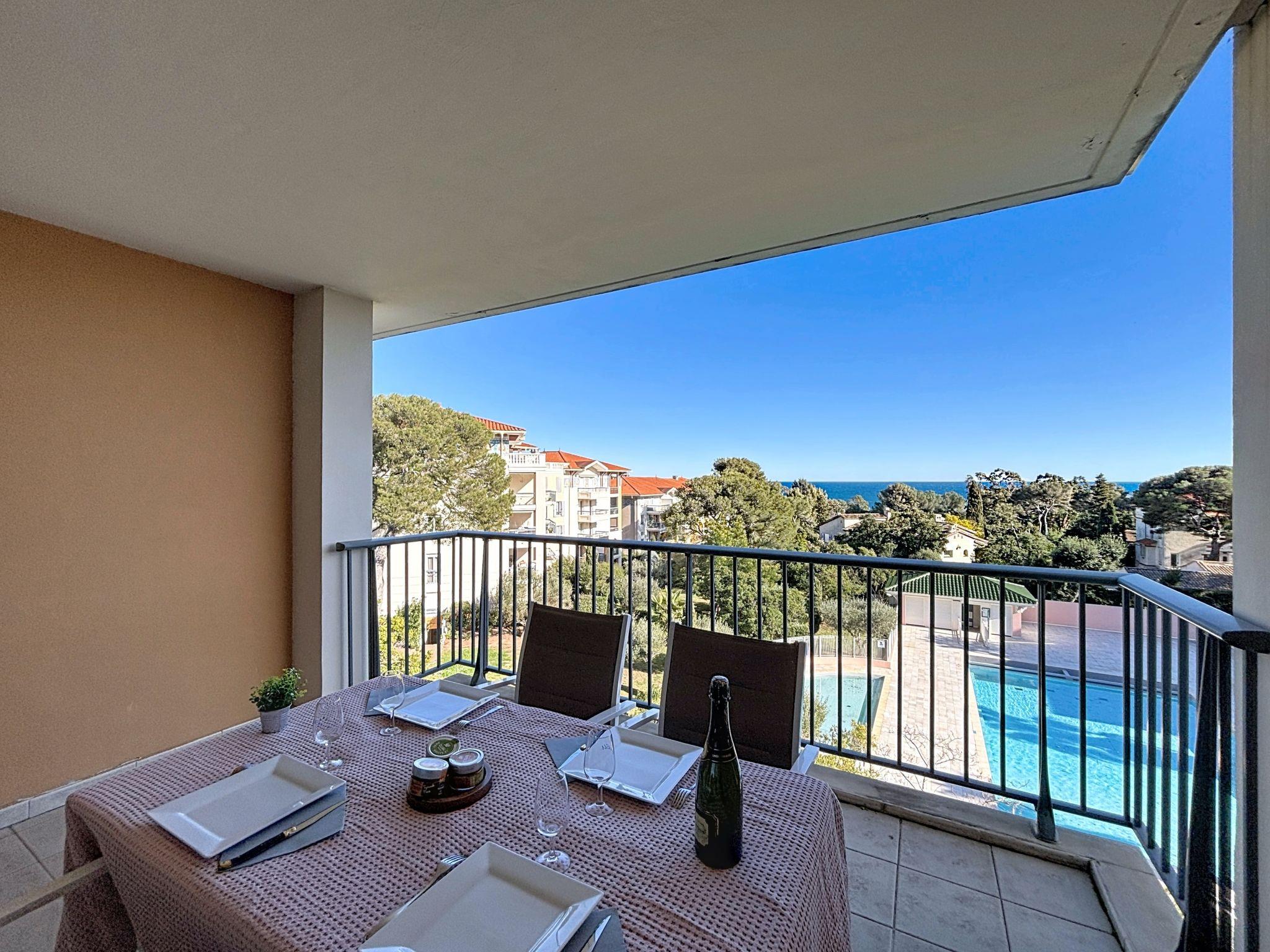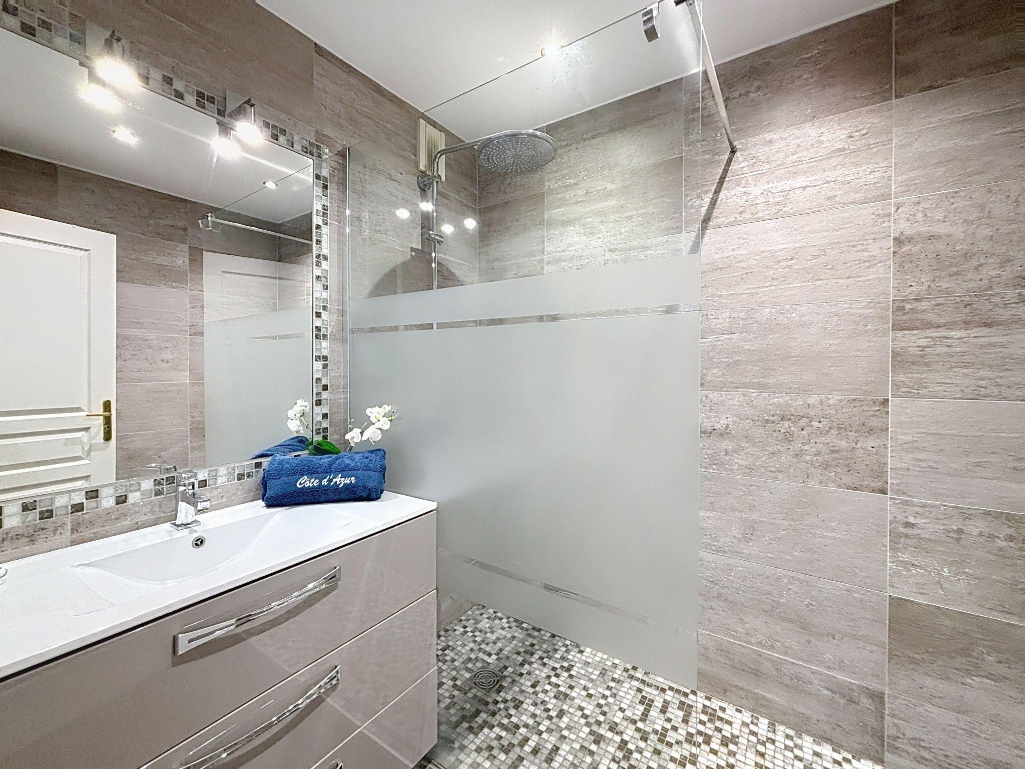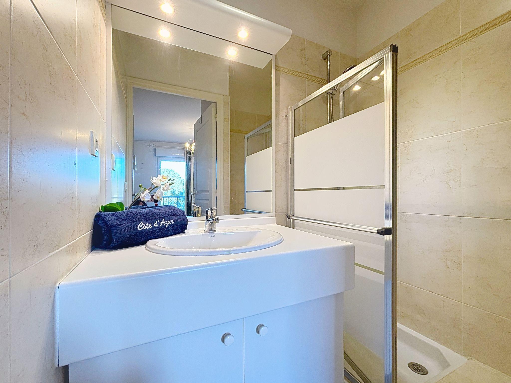 3-room apartment 79 m2 on 3rd floor. Comfortable and modern furnishings: living/dining room with panoramic window with TV (flat screen), DVD and electric shutters. Exit to the terrace. 1 room with 1 french bed (1 x 140 cm, length 190 cm), shower. 1 room with 2 beds (90 cm, length 190 cm). Large kitchen (dishwasher, 4 ceramic glass hob hotplates, toaster, kettle, freezer, electric coffee machine, Capsules for coffee machine (Nespresso), combination microwave). Exit to the balcony. Shower, sep. WC. Air-conditioning. Balcony 8 m2, north facing position terrace 12 m2, south-east facing position. Terrace furniture. Beautiful view of the sea, the swimming pool and the garden. Facilities: washing machine, iron, hair dryer. Internet (WiFi, extra). Garage space n 34, height 190 cm, width 230 cm. Please note: suitable for families. Maximum 1 pet/ dog allowed. TV only FR. Smoke alarm. Offer by a private individual according to Art. 155, IV of CGI. GOARHM
