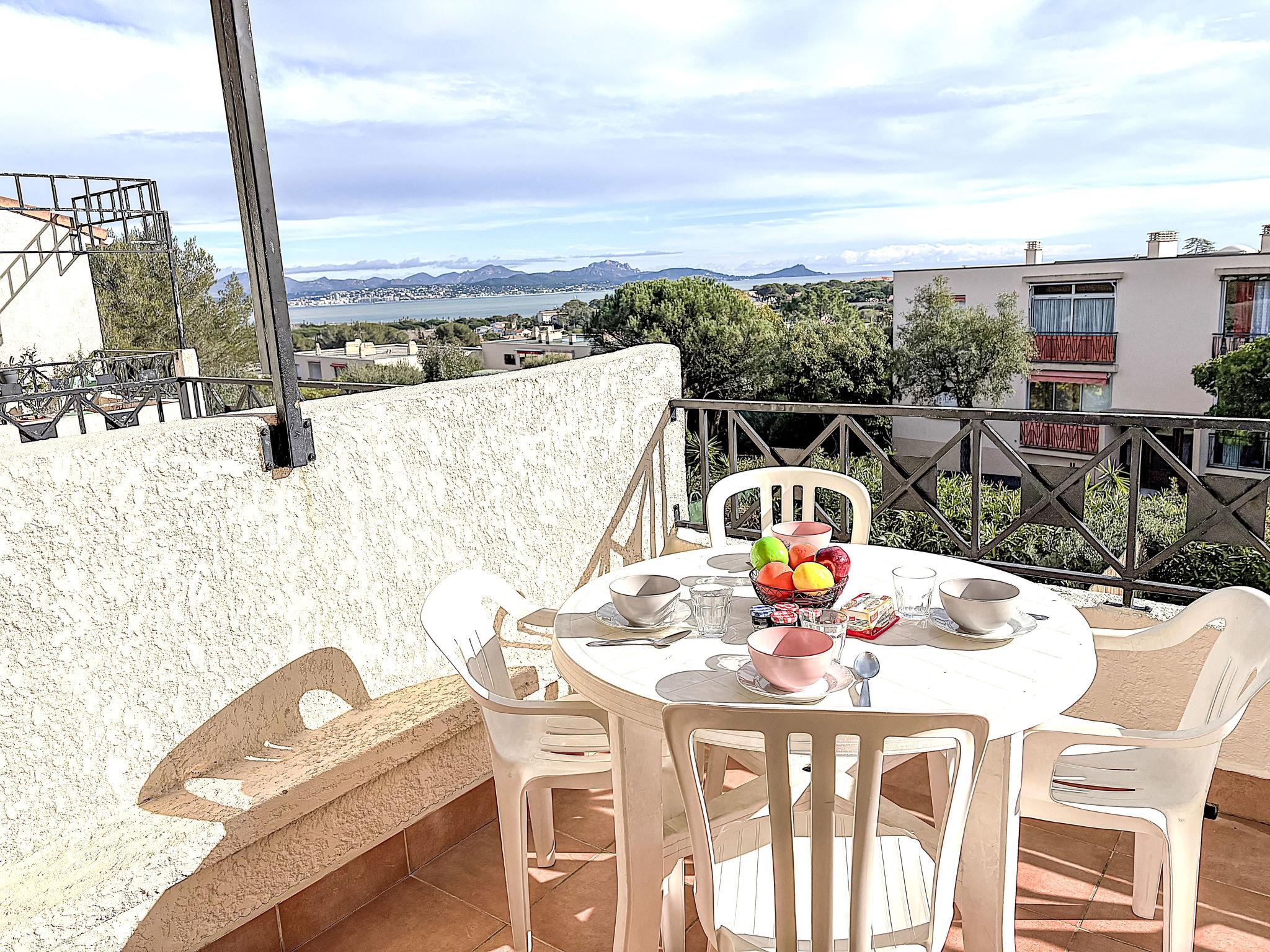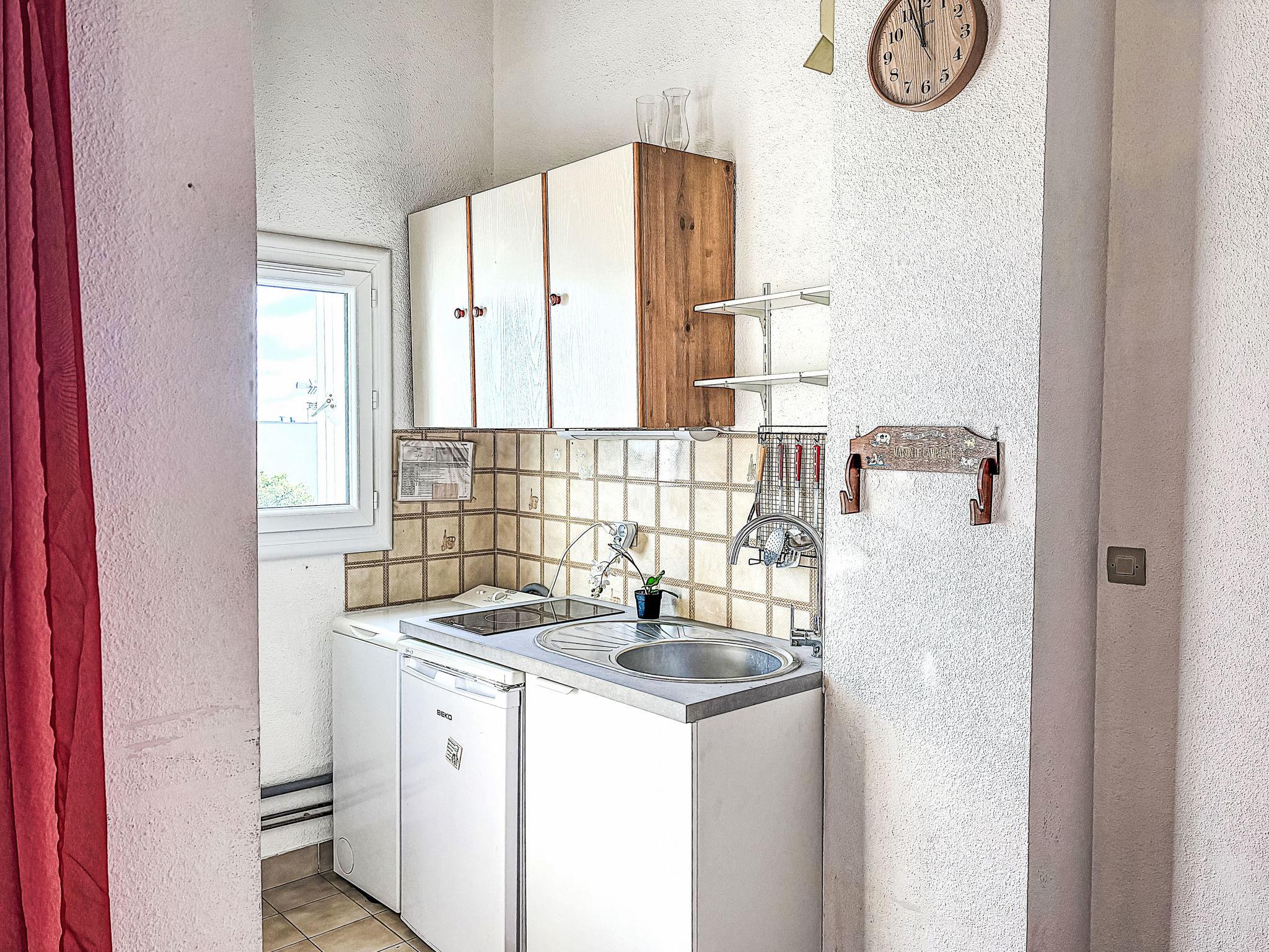 2-room apartment 32 m2 on 1st floor. Simple furnishings: living/dining room with TV (flat screen). Exit to the terrace. 1 small room with 1 x 1 bunk beds (80 cm, length 190 cm). Gallery with 1 french bed (1 x 140 cm, length 190 cm), fan. Kitchenette (4 hot plates, oven, toaster, kettle, electric coffee machine). Exit to the terrace. Shower/WC. Electric heating. Terrace 8 m2. Terrace furniture. View of the sea. Facilities: washing machine, iron. Internet (WiFi, extra). Parking (1 car). Please note: TV only FR. Smoke alarm. Offer by a private individual according to Art. 155, IV of CGI.