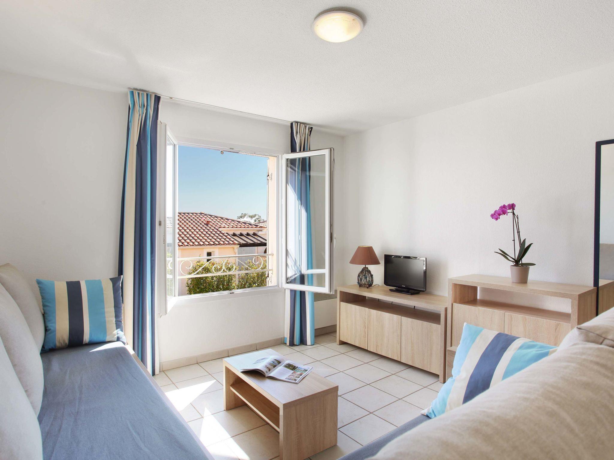 "Odalys Référence Domaine des Eucalyptus", 2-room apartment 32 m2. Bright, comfortable furnishings: living/sleeping room with 2 sofabeds, 1 pull-out bed, dining table and TV. 1 room with 2 sleeping facilities. Open kitchen (4 hot plates, dishwasher, microwave). Bath/WC. Electric heating, air-conditioning. Balcony or terrace. Balcony furniture. Facilities: children's high chair, baby cot. Internet (WiFi, extra). Please note: non-smokers only. Maximum 2 pets/ dogs allowed. Smoke alarm, fire extinguisher.