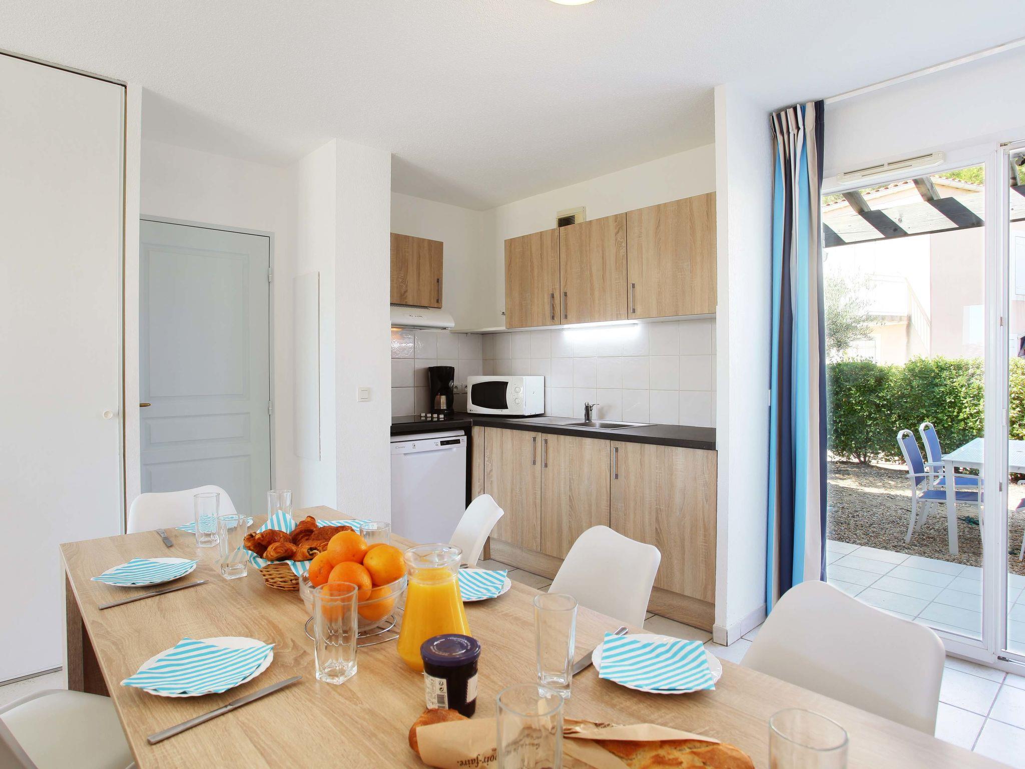 "Odalys Référence Domaine des Eucalyptus", 4-room apartment 55 m2. Object suitable for 8 adults. Bright, comfortable furnishings: living/sleeping room with 2 sofabeds, 1 pull-out bed, dining table and TV. 1 room with 1 french bed. 1 room with 2 beds. 1 room with 1 x 2 bunk beds. Open kitchen (4 hot plates, dishwasher, microwave). Bath/WC or shower/WC. Electric heating, air-conditioning. Terrace. Terrace furniture. Facilities: children's high chair, baby cot (extra). Internet (WiFi, free). Please note: non-smokers only. Maximum 2 pets/ dogs allowed. Smoke alarm, fire extinguisher.