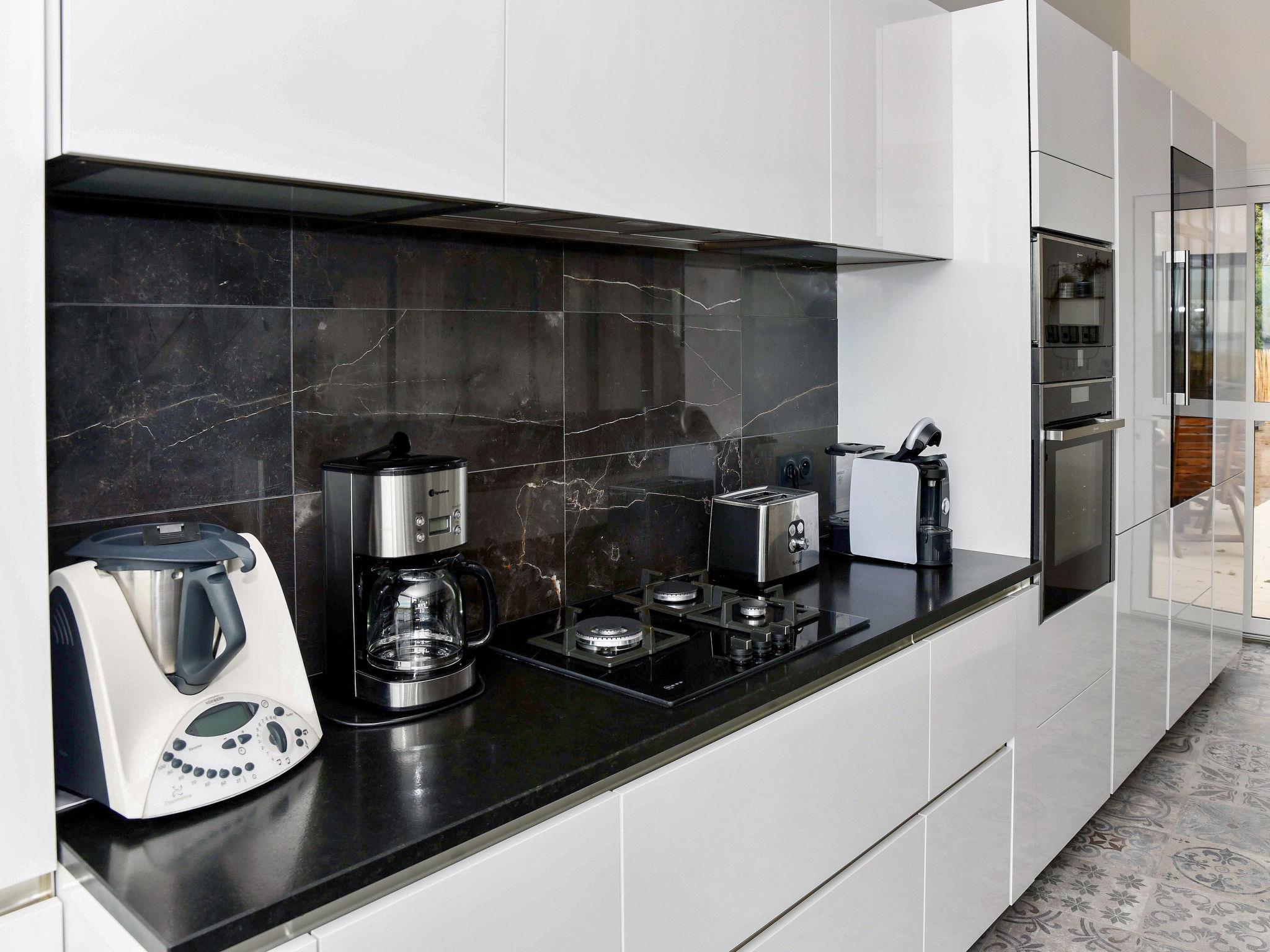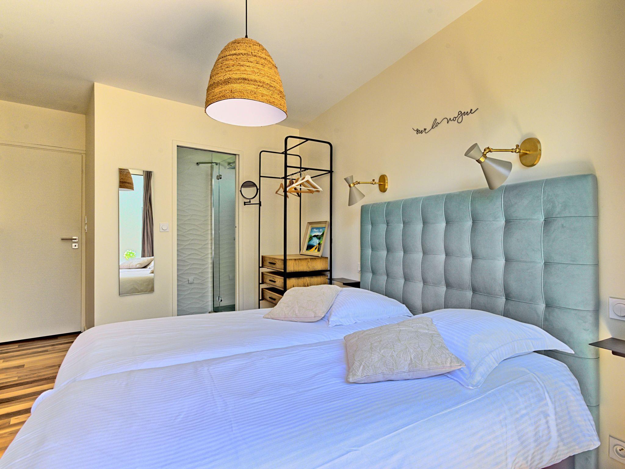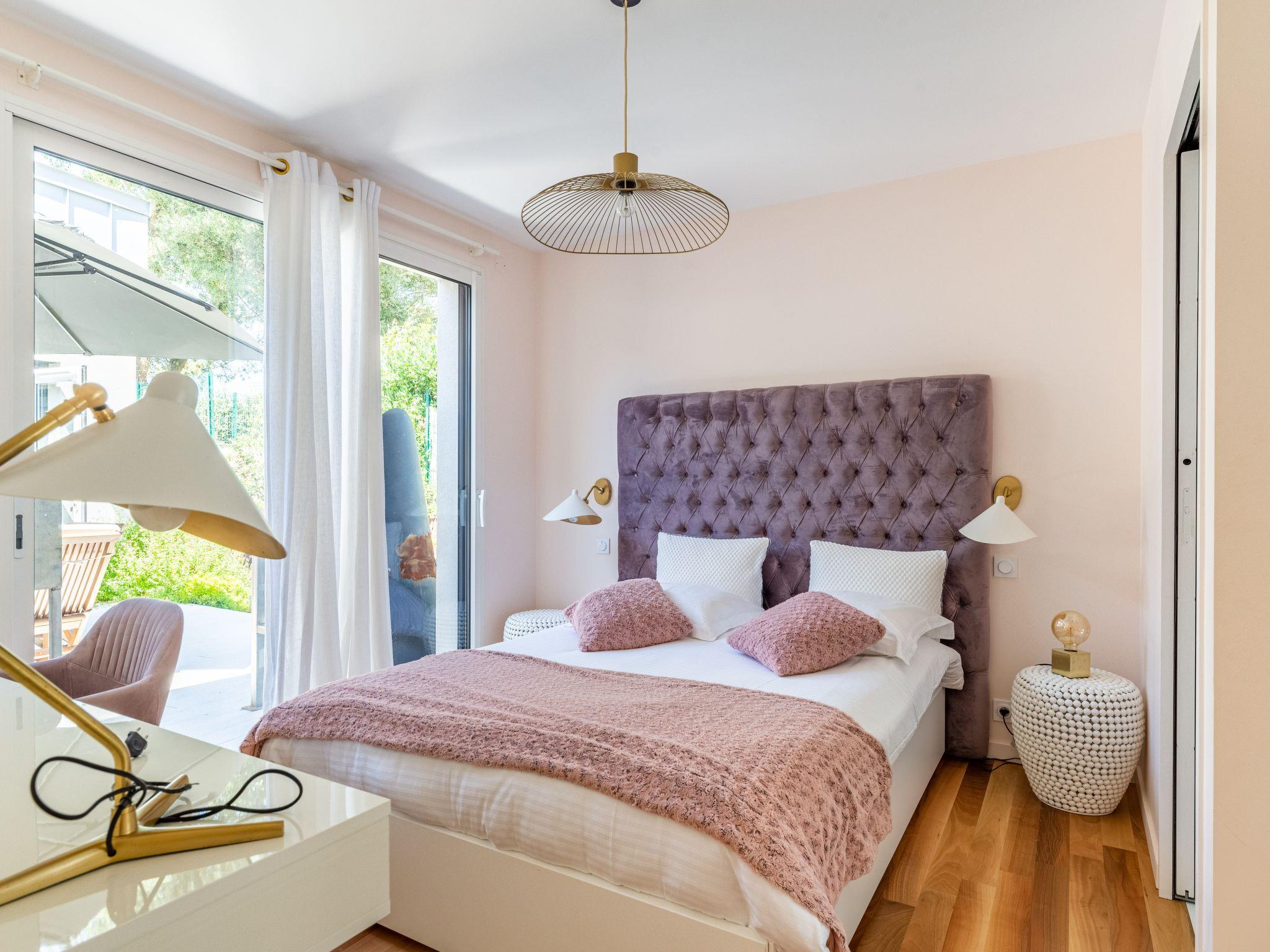 "Indigo-Vue Mer et Piscine chauffée", 4-room terraced house 136 m2. Comfortable furnishings: living/dining room with open-hearth fireplace, dining table, satellite TV and international TV channels. Exit to the terrace, to the swimming pool. 1 room with 1 french bed (160 cm, length 200 cm), bath/shower and double hand-basin. Exit to the terrace. 1 room with 1 french bed (140 cm, length 200 cm), bathroom. Exit to the terrace. 1 room with 2 beds (80 cm, length 200 cm), shower. Exit to the garden. Kitchen (oven, dishwasher, 3 gas rings, microwave, freezer, electric coffee machine) with small dining table. Exit to the terrace. 2 sep. WC's. Gas heating, underfloor heating. Terrace. Terrace furniture, barbecue (portable), deck chairs (4). View of the sea. Facilities: washing machine, dryer, children's high chair, baby cot. Internet (WiFi, free). Please note: non-smoking house. Smoke alarm.