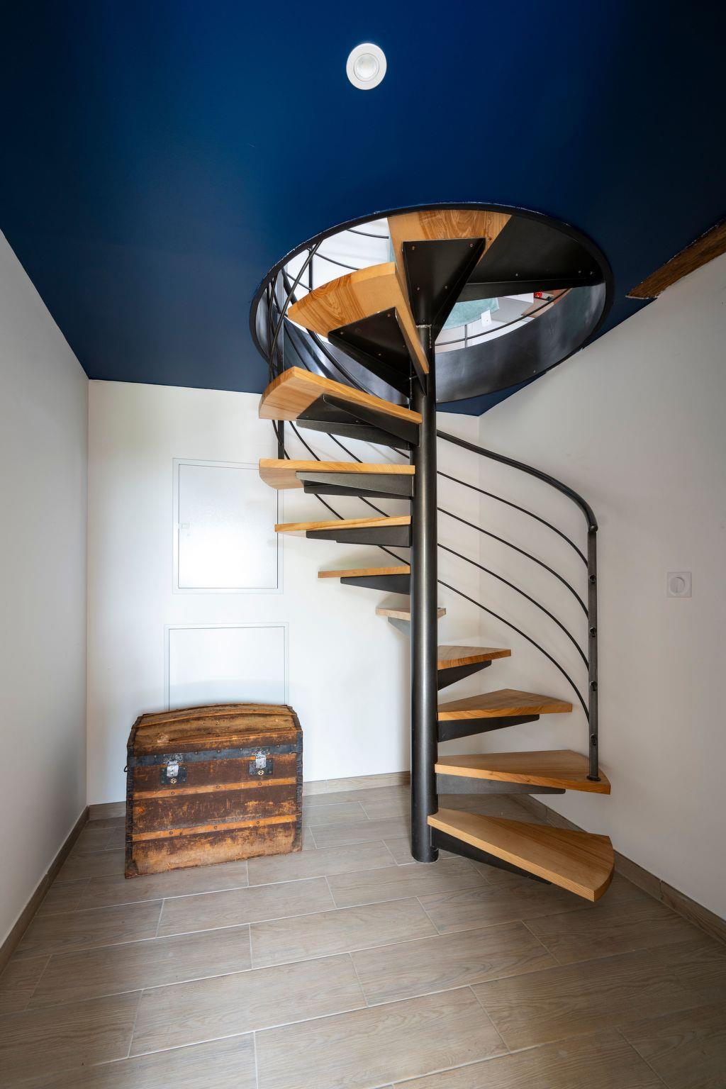 - A wrought iron spiral staircase leads to both floors.