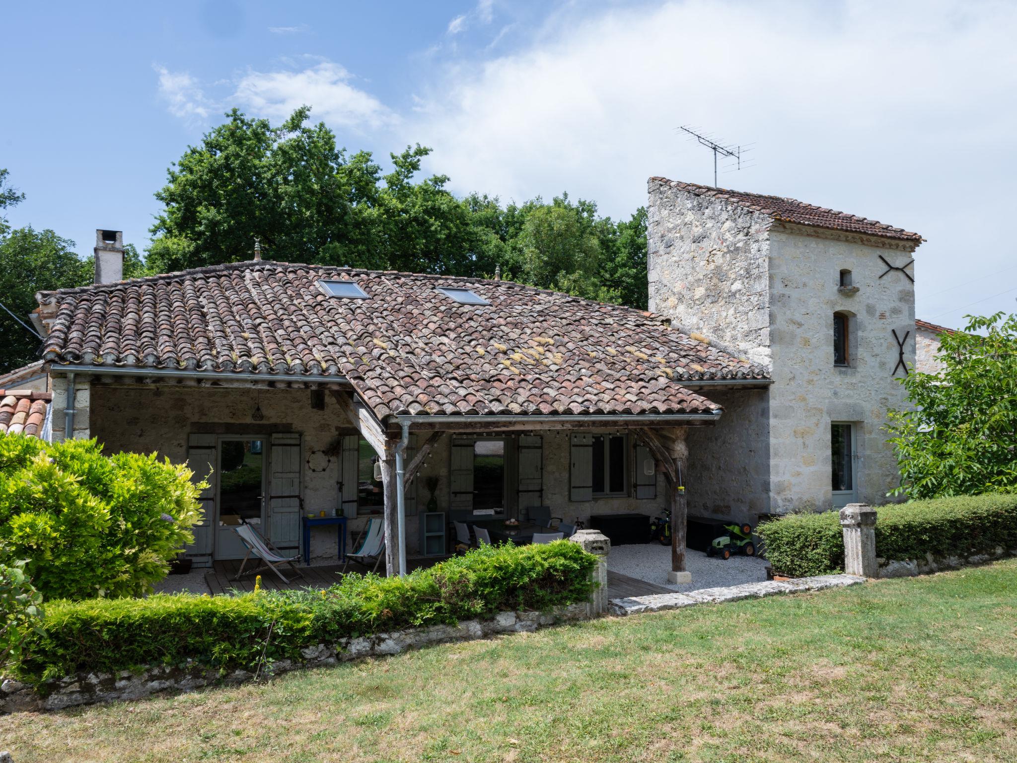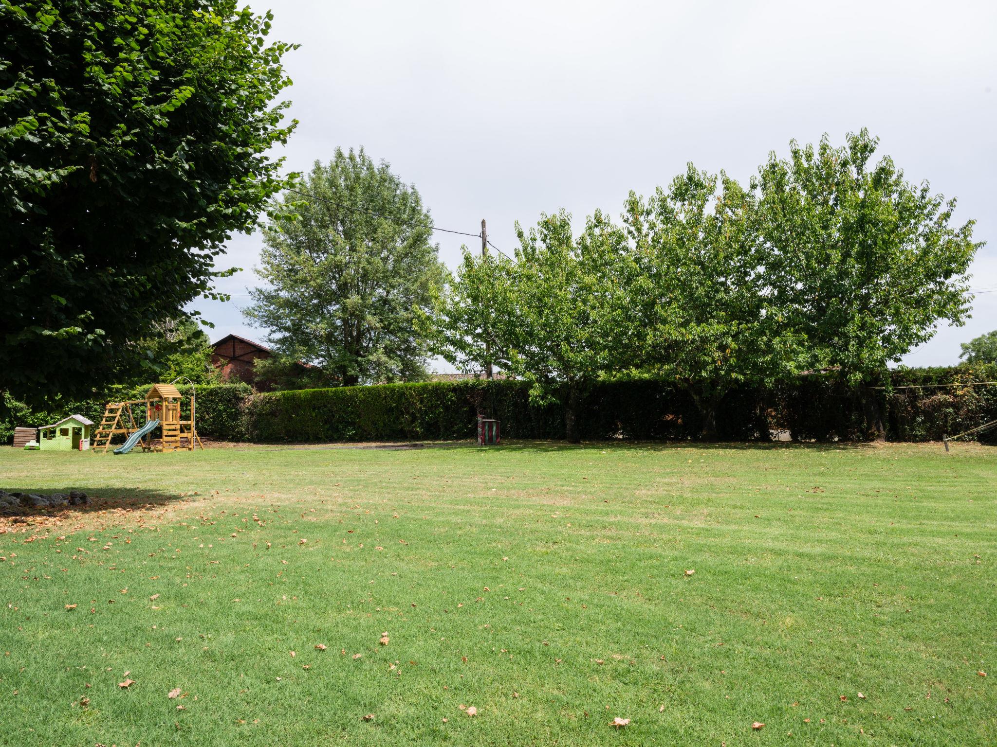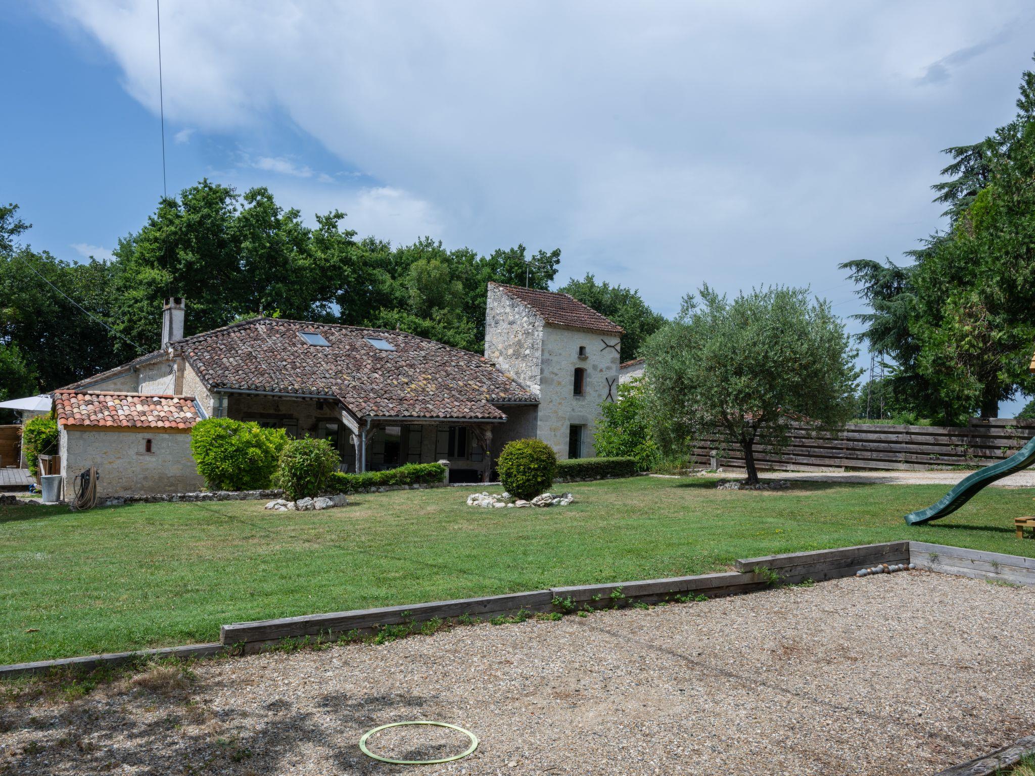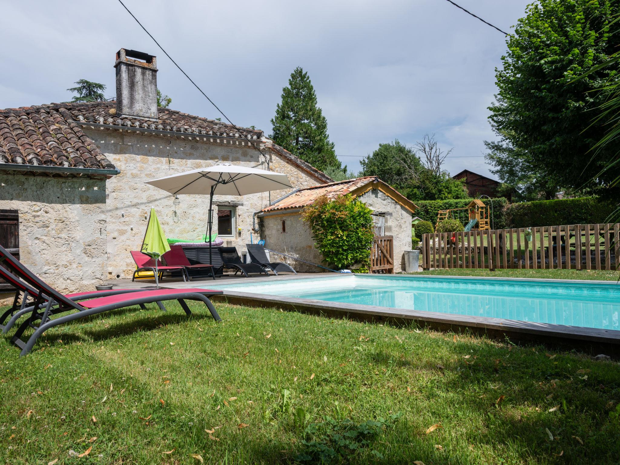 Saint Caprais de Lerm: Single-family house "Villa CAPPE". In a quiet position, in a cul-de-sac. Private: large garden 2'000 m2 (not fenced), swimming pool heated (8 x 4 m, depth 140 cm, seasonal availability: 01.Jul. - 31.Aug.) with alarm system. Boules, children's playground. Motor access to the house. (5 steps). Parking (for 2 cars) on the premises. Grocery 7.5 km, supermarket 7.5 km, restaurant 2.5 km, bakery 7.5 km, bus stop 7 km, railway station "Agen" 12 km, thermal baths "Aginum Thermae" 11 km. Golf course (9 hole) 8 km, tennis 6 km, riding stable 5.5 km. Nearby attractions: Agen 13 km, Happy Forest Parc 8 km, Parc attraction Walygator 15 km, Parc Naturel Passeligne 13 km. Well-known lakes can easily be reached: Lac Passeligne 13 km. Please note: car recommended.
