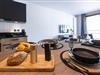 Stue(dobbeltseng(140 x 190 cm), Fjernsyn(fladskærm), sofahjørne), åbent køkken(kogeplade(glaskeramisk), elkedel, brødrister, kaffemaskine, espressomaskine, ovn, mikrobølgeovn, opvaskemaskine , køleskab, ), soveværelse(dobbeltseng(160 x 200 cm)), soveværelse(dobbeltseng(160 x 200 cm)), Hytte(køjeseng(80 x 200 cm)), badeværelse(bruser), toilet(toilet), toilet(toilet), balkon eller terrasse