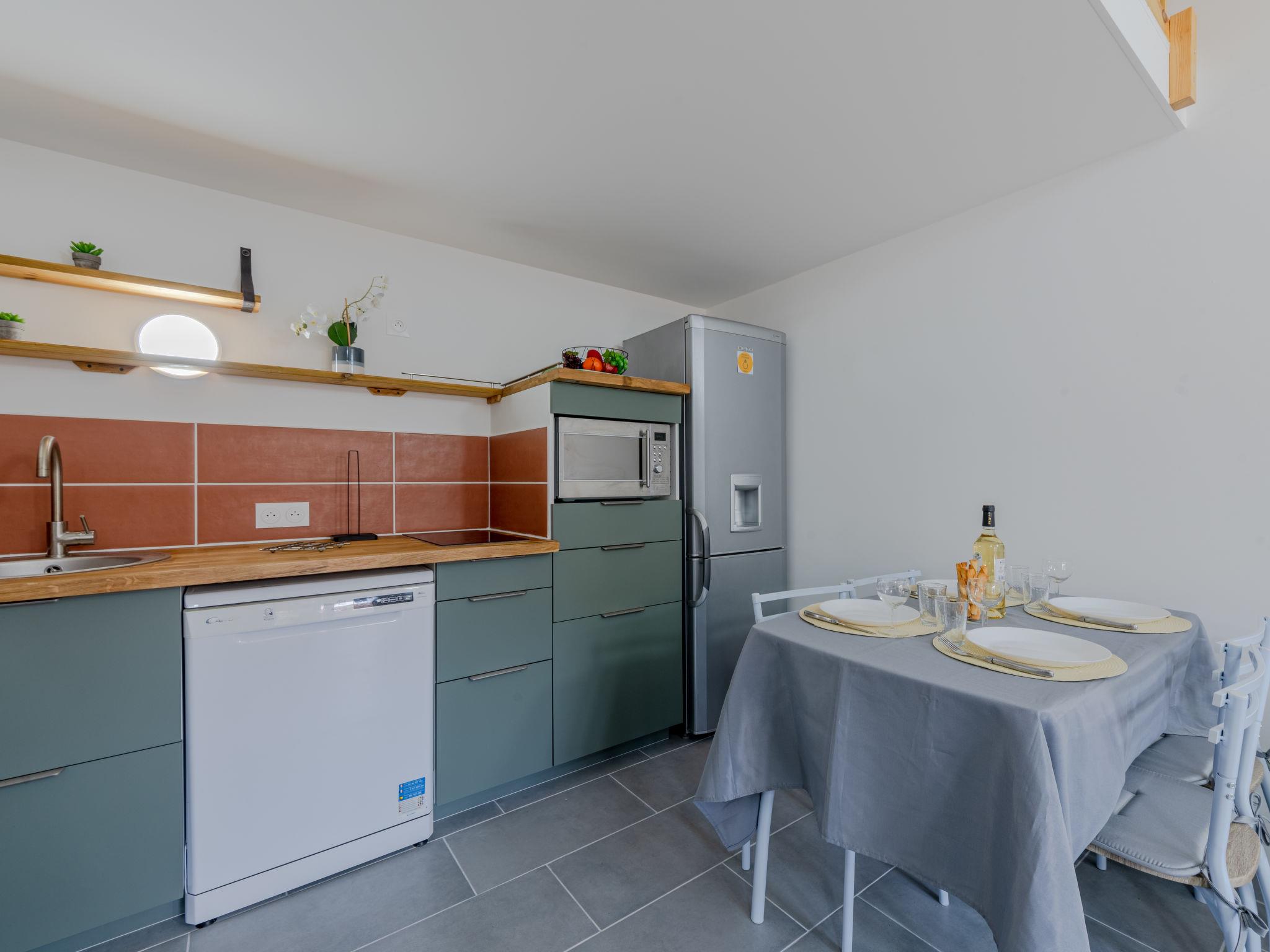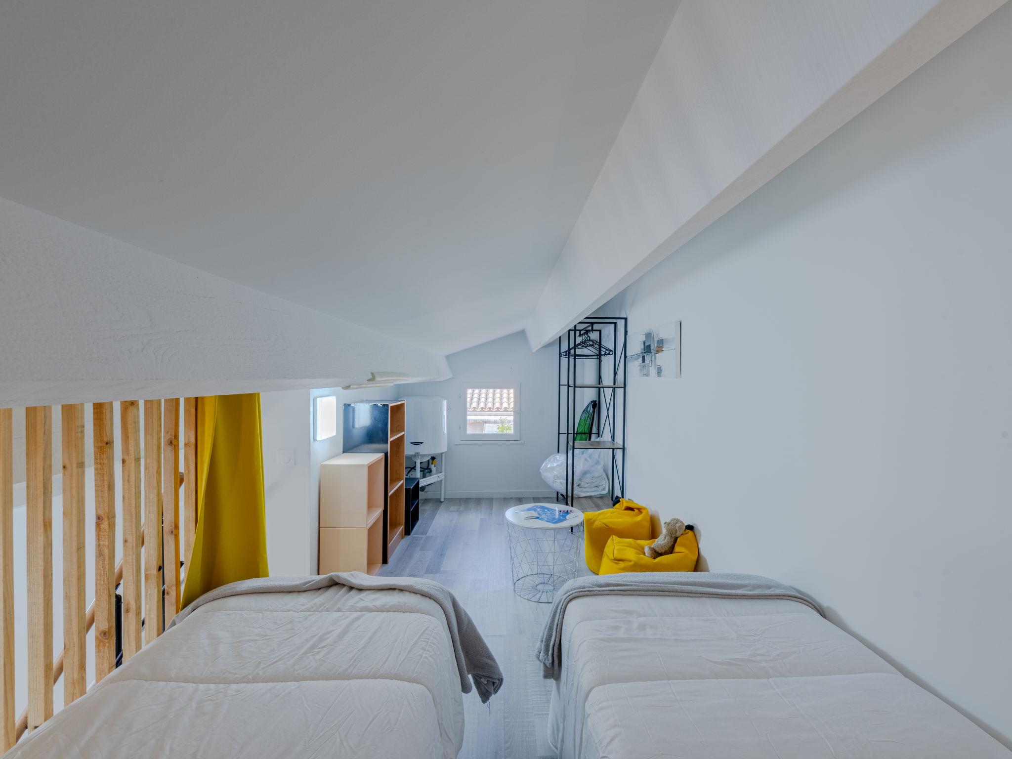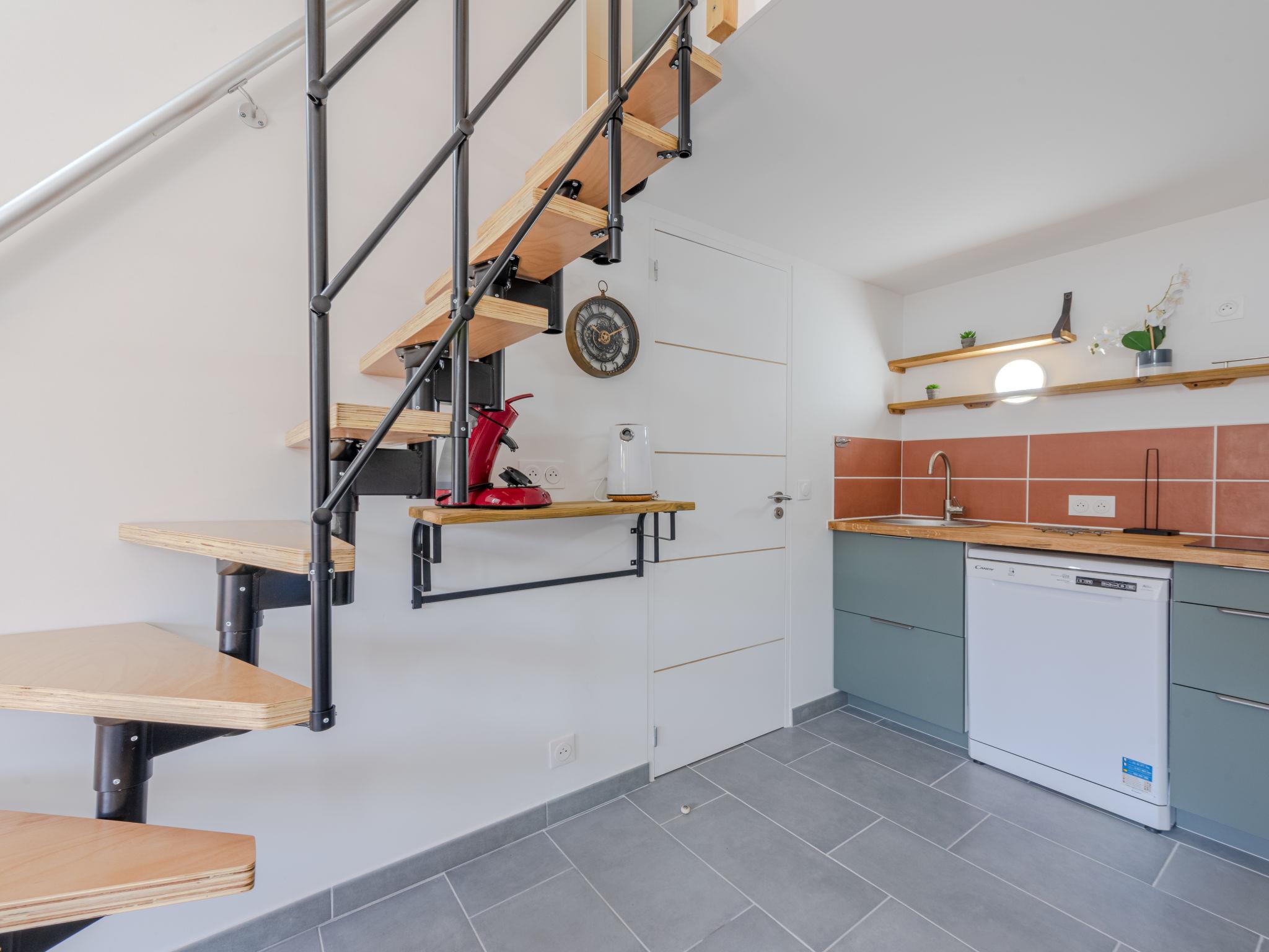 2-room house 28 m2. Beautiful furnishings: living/dining room. Exit to the terrace. 1 room with sliding door with 1 french bed (140 cm, length 190 cm), TV (flat screen). Kitchenette (dishwasher, 2 induction hot plates, toaster, kettle, microwave, freezer, electric coffee machine, Capsules for coffee machine (senseo) extra). Shower/WC. Electric heating, air-conditioning. Upper floor: (steep stair) open gallery with sloping ceilings, ceiling height 120 - 190 cm with 2 beds (70 cm, length 190 cm). Terrace. Terrace furniture, barbecue. Facilities: washing machine. Internet (WiFi). Parking. Please note: smoke alarm. Offer by a private individual according to Art. 155, IV of CGI.