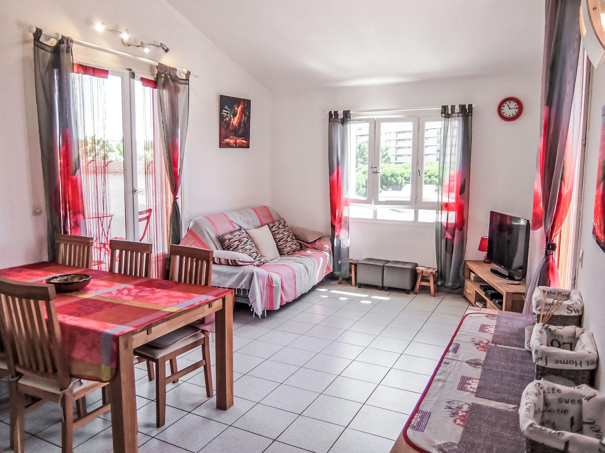 3-room apartment 50 m2 on 3rd floor. Comfortable furnishings: living/dining room with TV, DVD and air conditioning. Exit to the terrace. 1 room with 1 french bed (140 cm, length 190 cm), air conditioning. 1 room with 2 beds (90 cm, length 190 cm). Open kitchen (4 hot plates, oven, dishwasher, microwave, freezer, grill). Shower, sep. WC. Air-conditioning. Terrace 12 m2, east facing position terrace 12 m2, south facing position. Terrace furniture. Facilities: washing machine. Internet (WiFi, free). Parking space n 25 extérieur. Please note: smoke alarm, no lift.