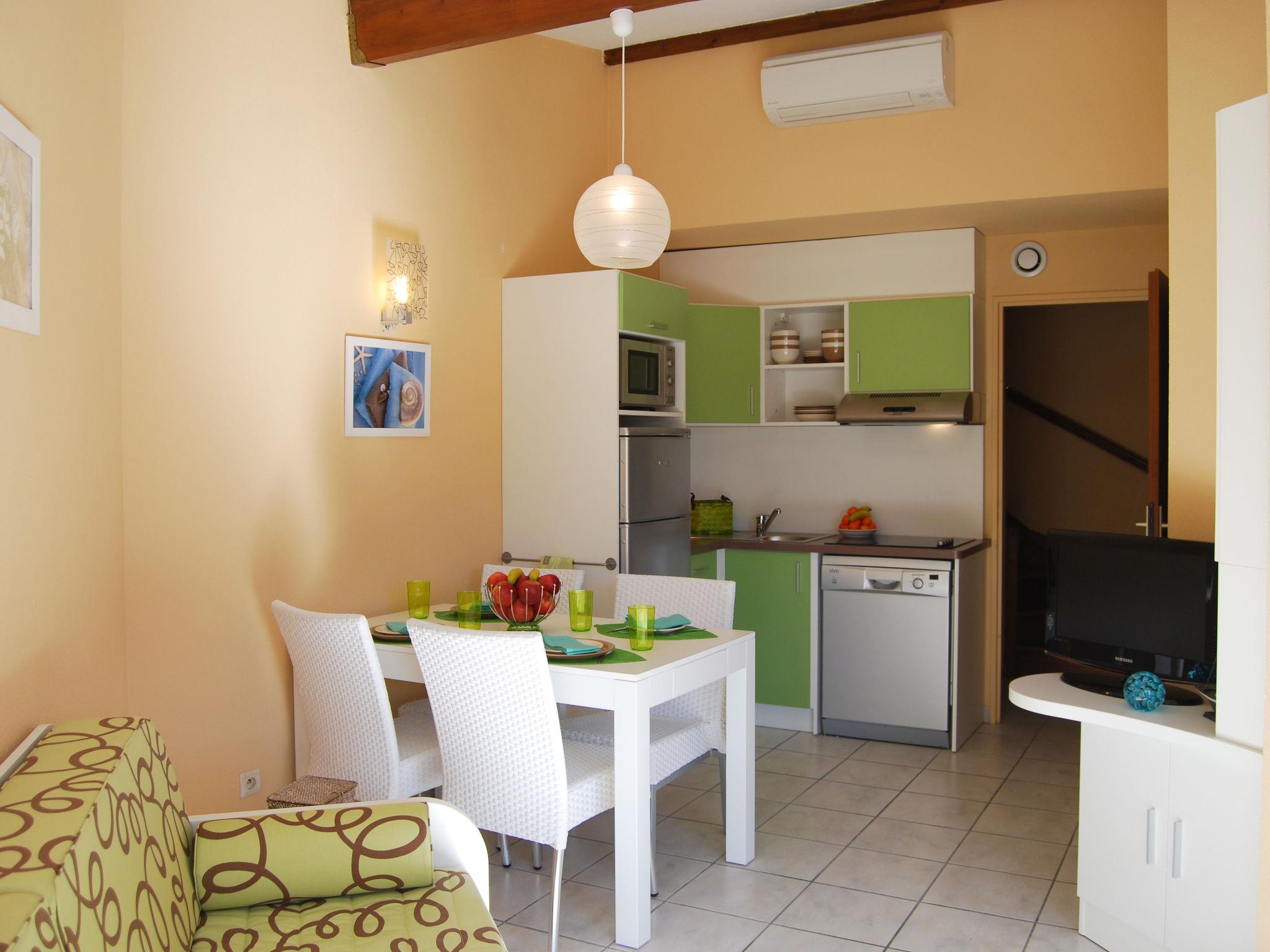 "Les Jardins de Neptune", 2-room apartment 24 m2. Beautiful furnishings: living/dining room with dining table, TV and air conditioning. 1 room with 2 beds. Kitchenette (dishwasher, 2 ceramic glass hob hotplates, microwave, freezer). Bathroom, sep. WC. Electric heating. Balcony or terrace. Terrace furniture, balcony furniture. Facilities: safe, children's high chair, baby cot (extra). Internet (WiFi, extra). Please note: non-smokers only. Maximum 2 pets/ dogs allowed. Smoke alarm, fire extinguisher. The flat is on the ground floor or on the 1st floor.