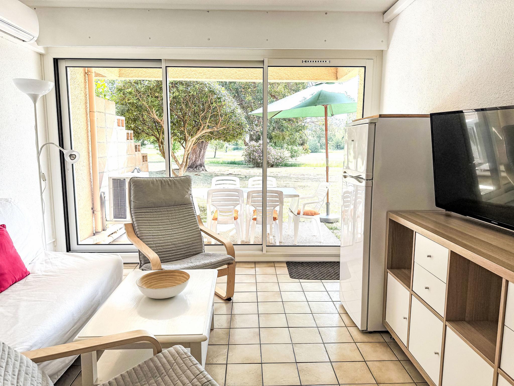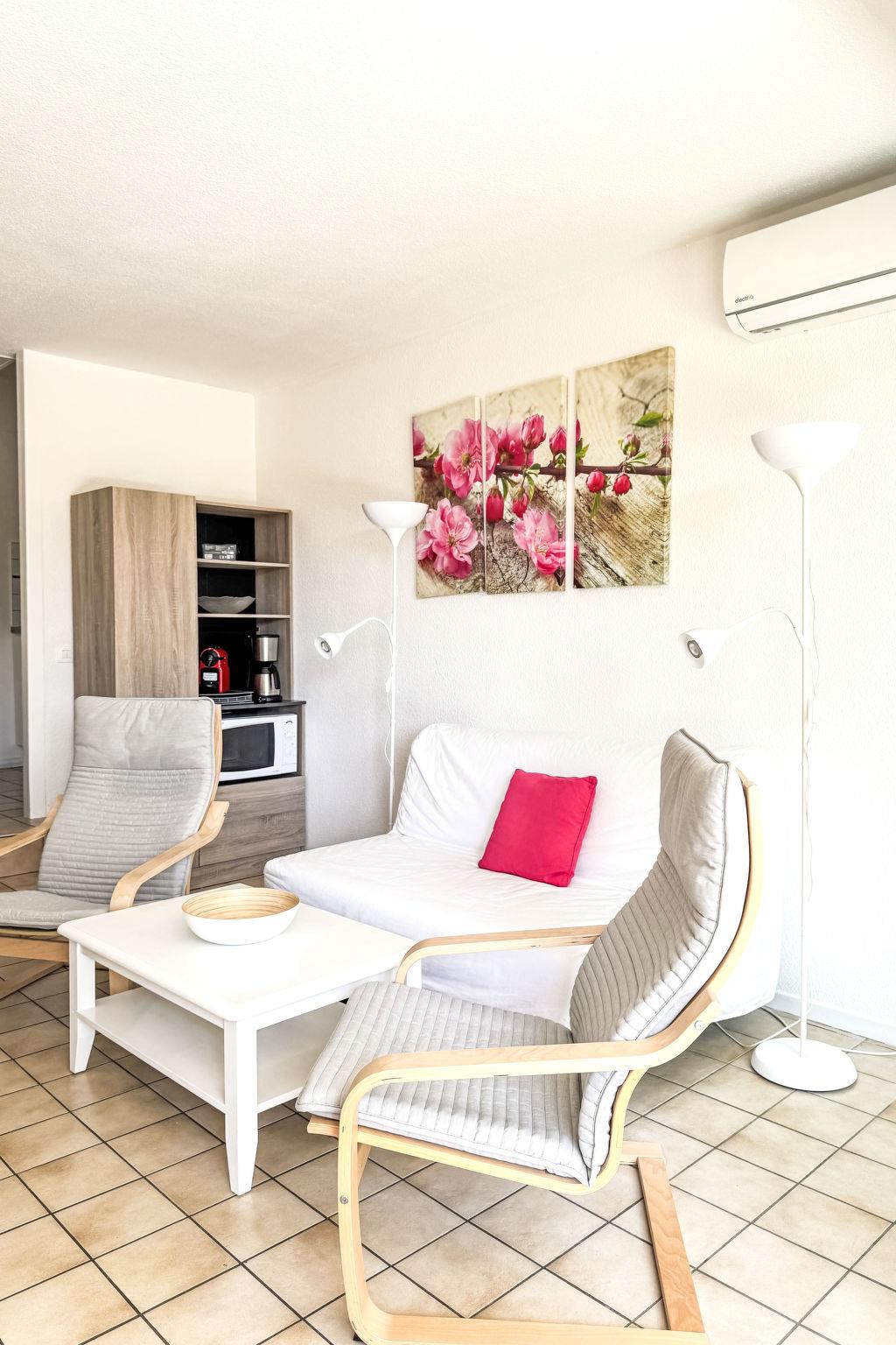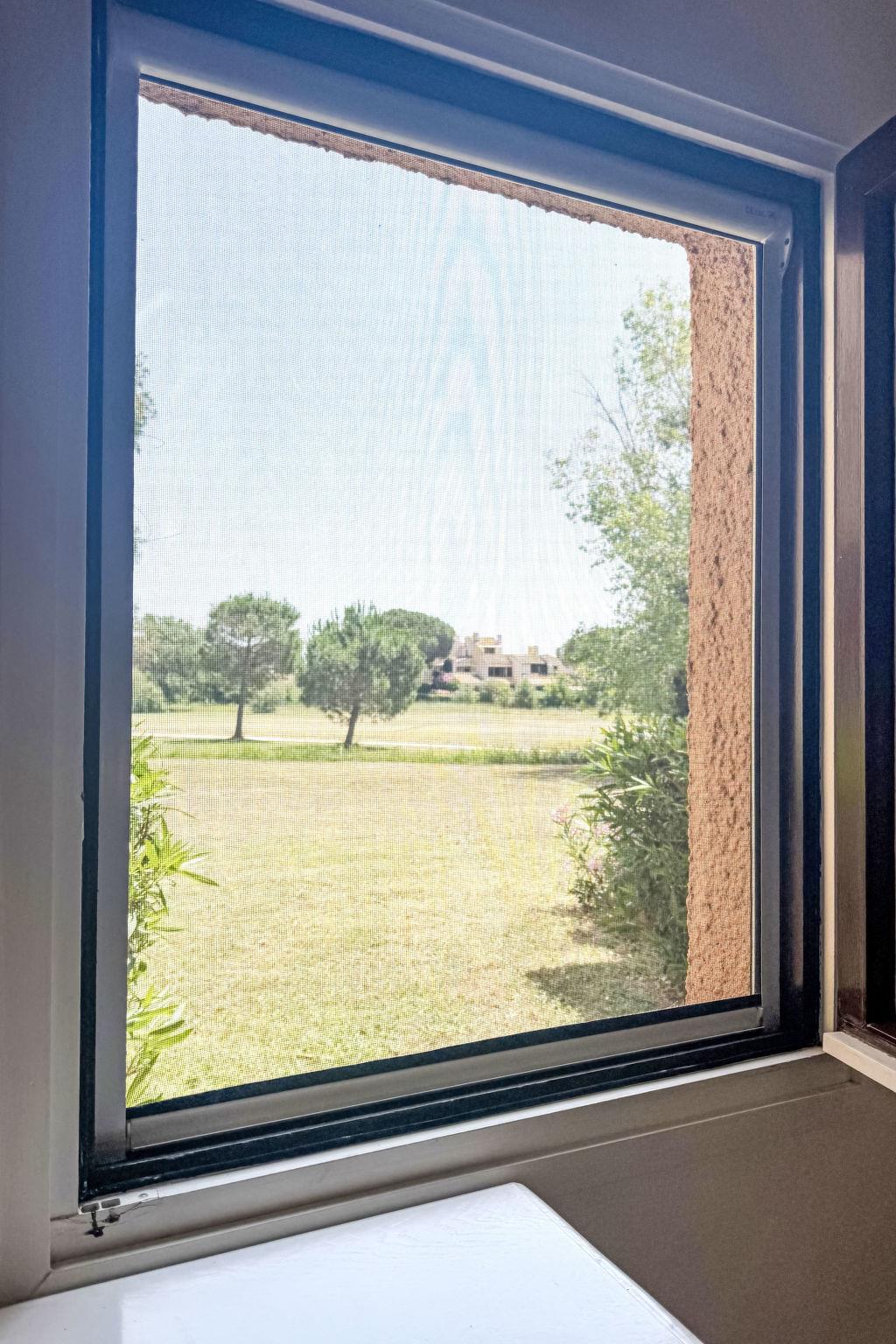 2-room apartment 35 m2, on the ground floor. Entrance hall with 1 bed (70 cm, length 180 cm). Living/dining room with 1 double sofabed (140 cm, length 190 cm), TV (flat screen), air conditioning. Exit to the terrace. 1 room with 2 beds (80 cm, length 190 cm), air conditioning. Kitchenette (mini-oven, oven, dishwasher, 3 ceramic glass hob hotplates, toaster, kettle, microwave, freezer, electric coffee machine, Capsules for coffee machine (Nespresso) extra). Bathroom, sep. WC. Electric heating. Terrace 8 m2, east facing position. Terrace furniture. View of golf course. Facilities: Internet (WiFi, extra). Please note: non-smokers only. Smoke alarm. Offer by a private individual according to Art. 155, IV of CGI.