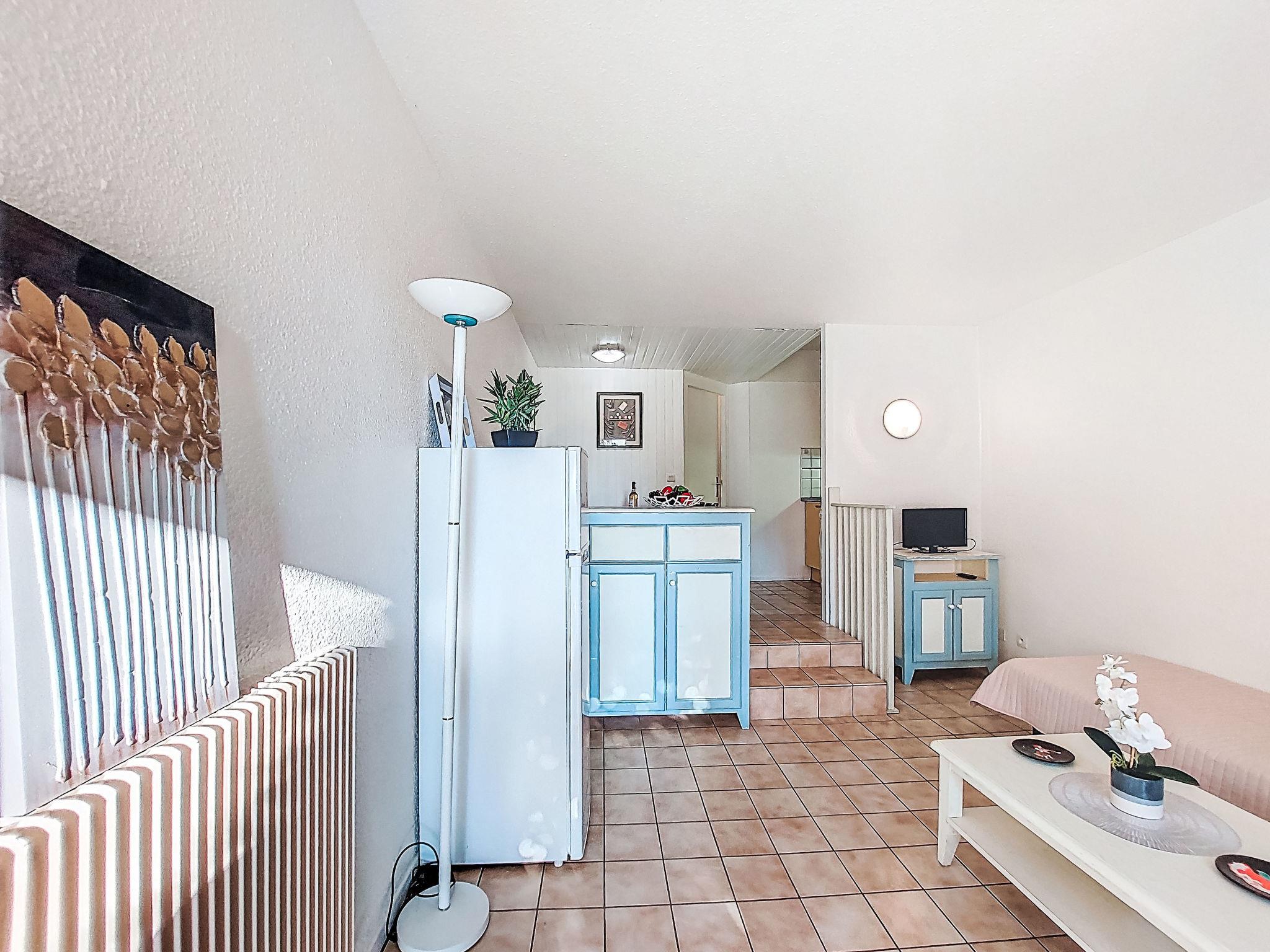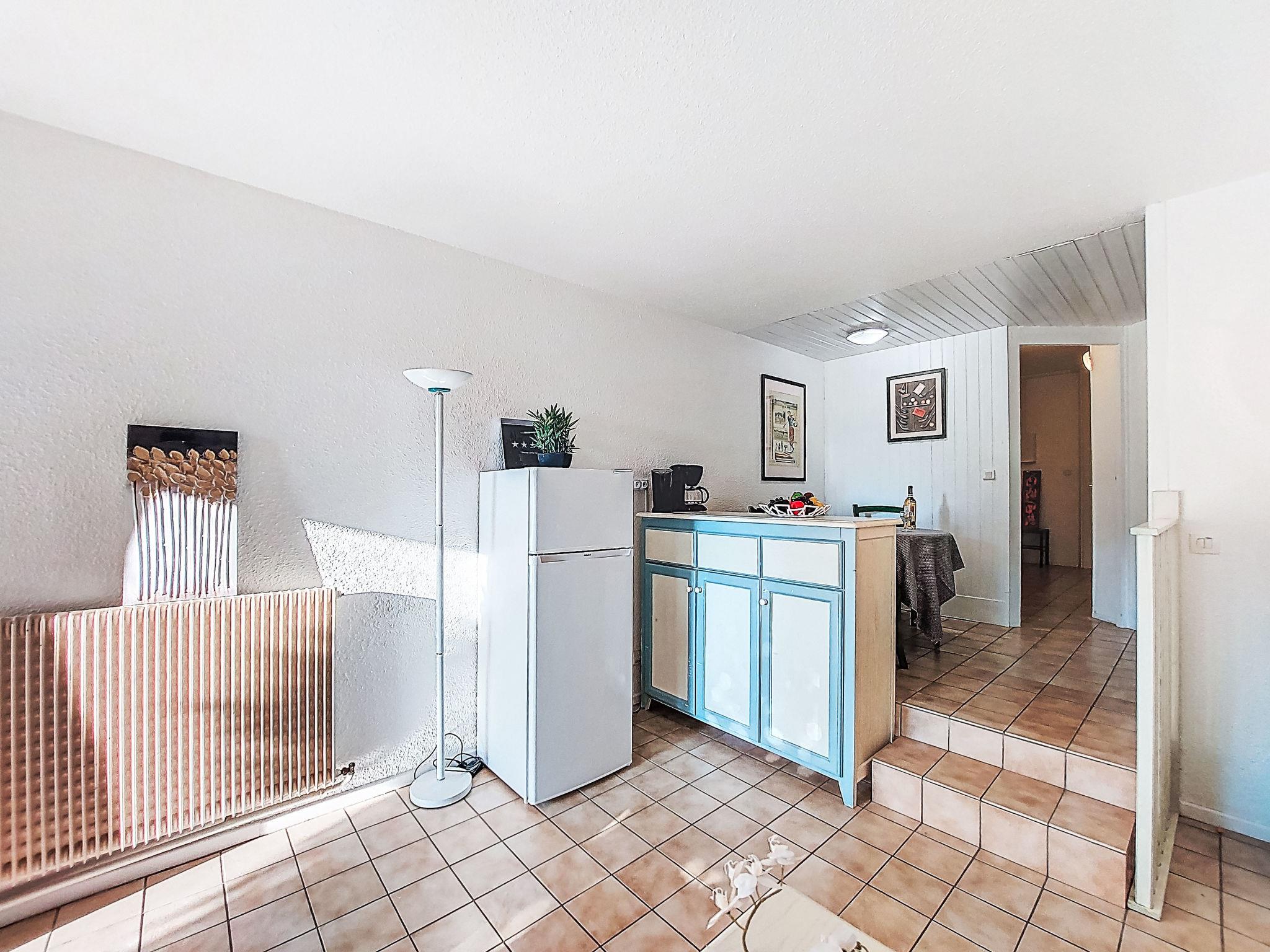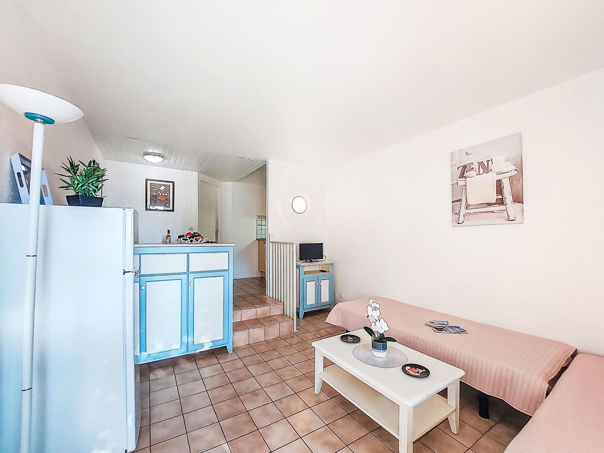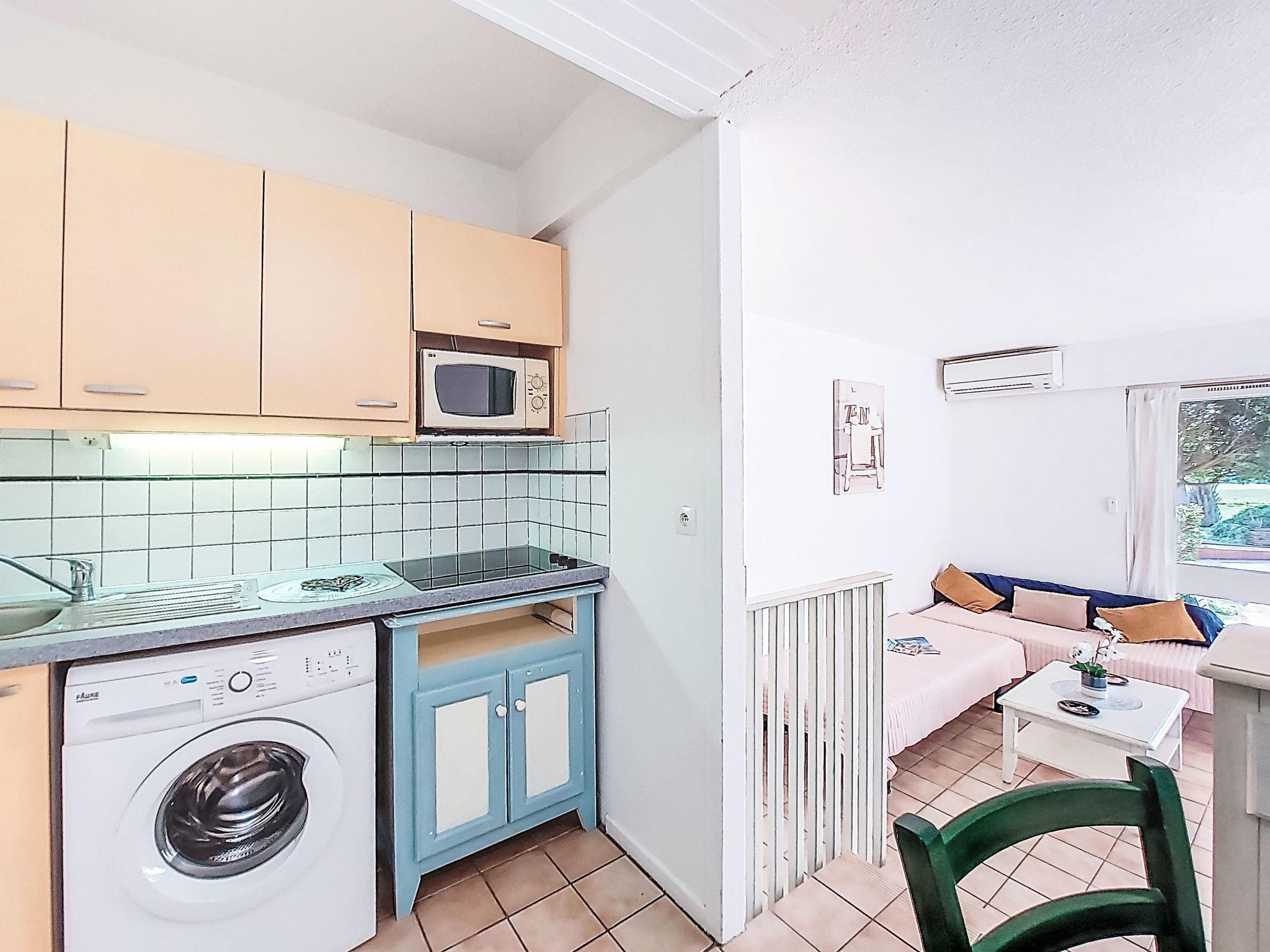 1-room studio 28 m2, on the ground floor. Simple furnishings: entrance hall with 1 x 2 bunk beds (80 cm, length 190 cm). Living/dining room with 2 beds (80 cm, length 190 cm), TV (flat screen), air conditioning. Exit to the terrace. Kitchenette (3 ceramic glass hob hotplates, toaster, kettle, microwave, freezer, electric coffee machine). Bathroom, sep. WC. Heating. Terrace 10 m2, north-west facing position. Terrace furniture. View of the garden and golf course. Facilities: washing machine. Internet (WiFi, extra). Please note: non-smokers only. Maximum 1 small pet/ dog allowed. Smoke alarm. Offer by a private individual according to Art. 155, IV of CGI.