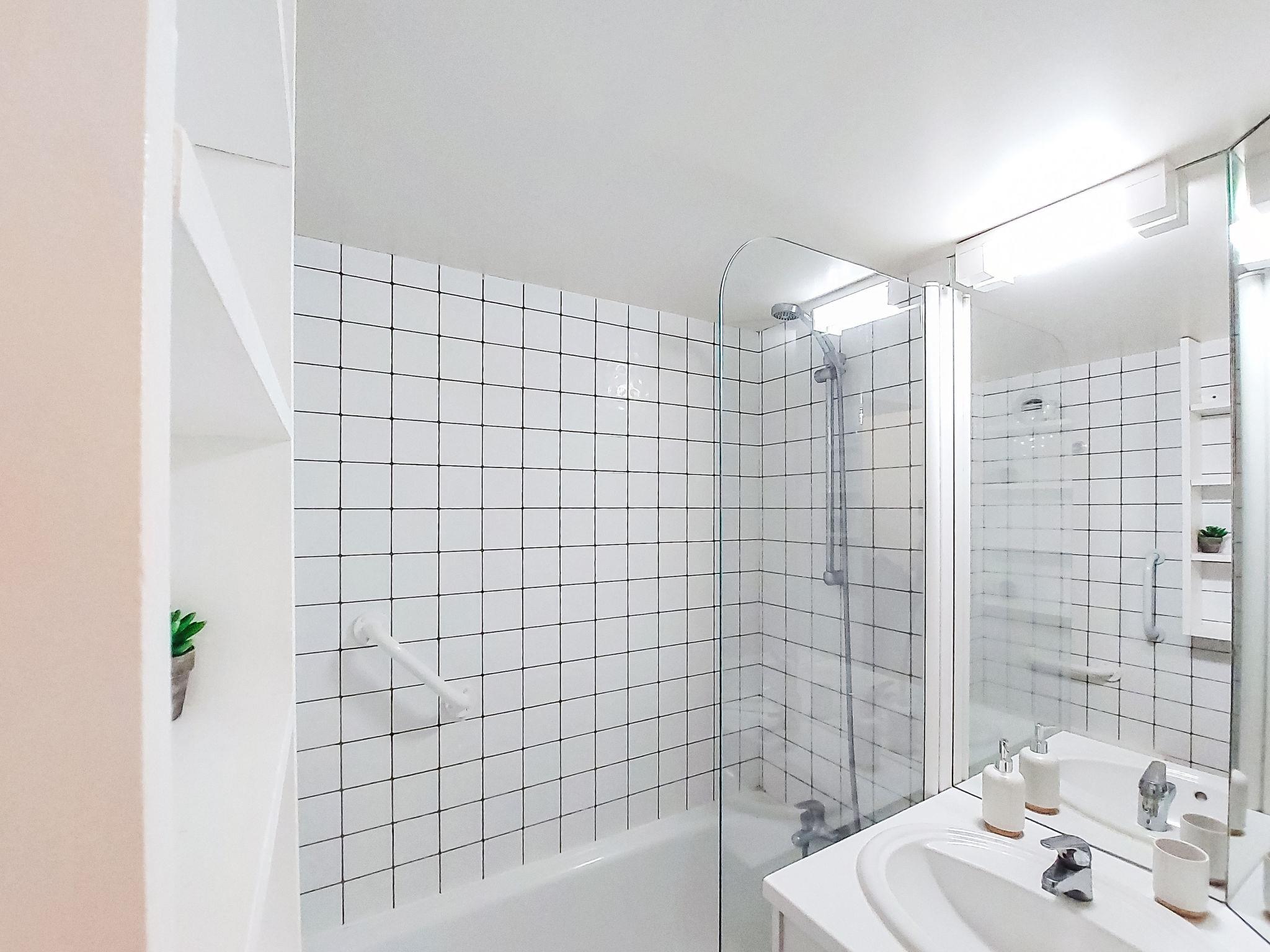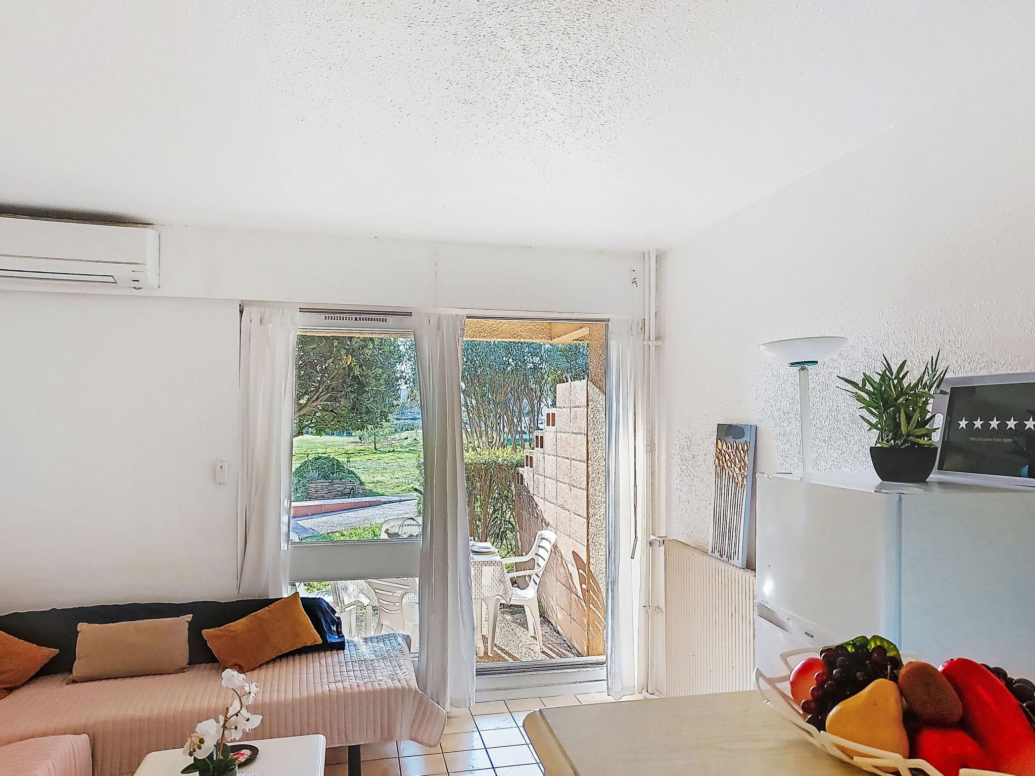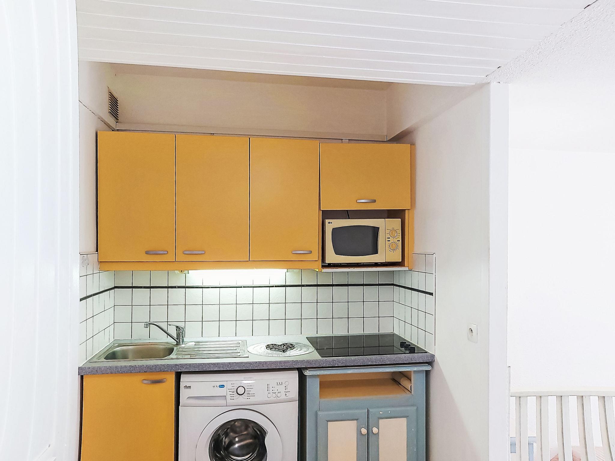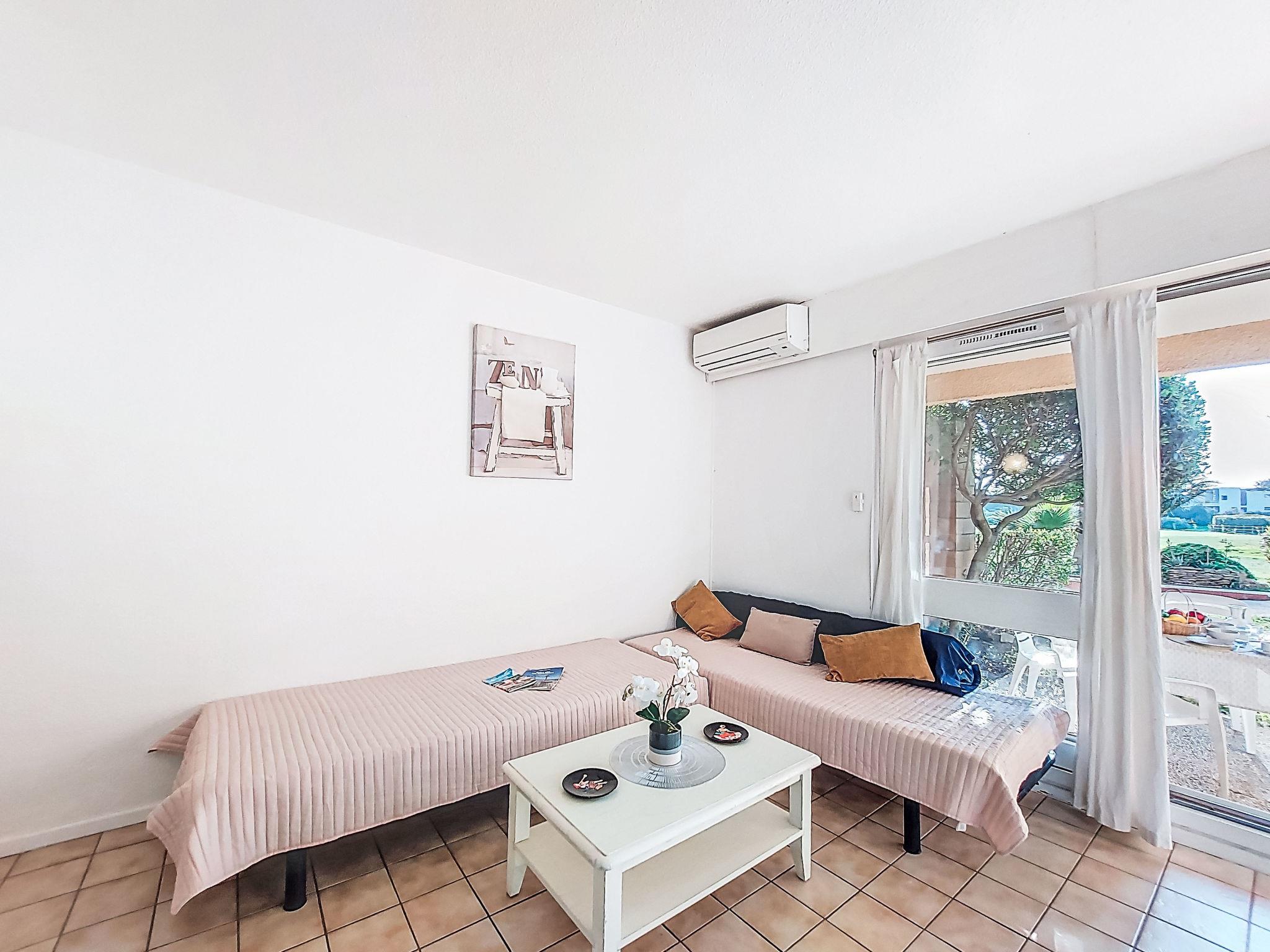 1-room studio 28 m2, on the ground floor. Simple furnishings: entrance hall with 1 x 2 bunk beds (80 cm, length 190 cm). Living/dining room with 2 beds (80 cm, length 190 cm), TV (flat screen), air conditioning. Exit to the terrace. Kitchenette (3 ceramic glass hob hotplates, toaster, kettle, microwave, freezer, electric coffee machine). Bathroom, sep. WC. Heating. Terrace 10 m2, north-west facing position. Terrace furniture. View of the garden and golf course. Facilities: washing machine. Internet (WiFi, extra). Please note: non-smokers only. Maximum 1 small pet/ dog allowed. Smoke alarm. Offer by a private individual according to Art. 155, IV of CGI.