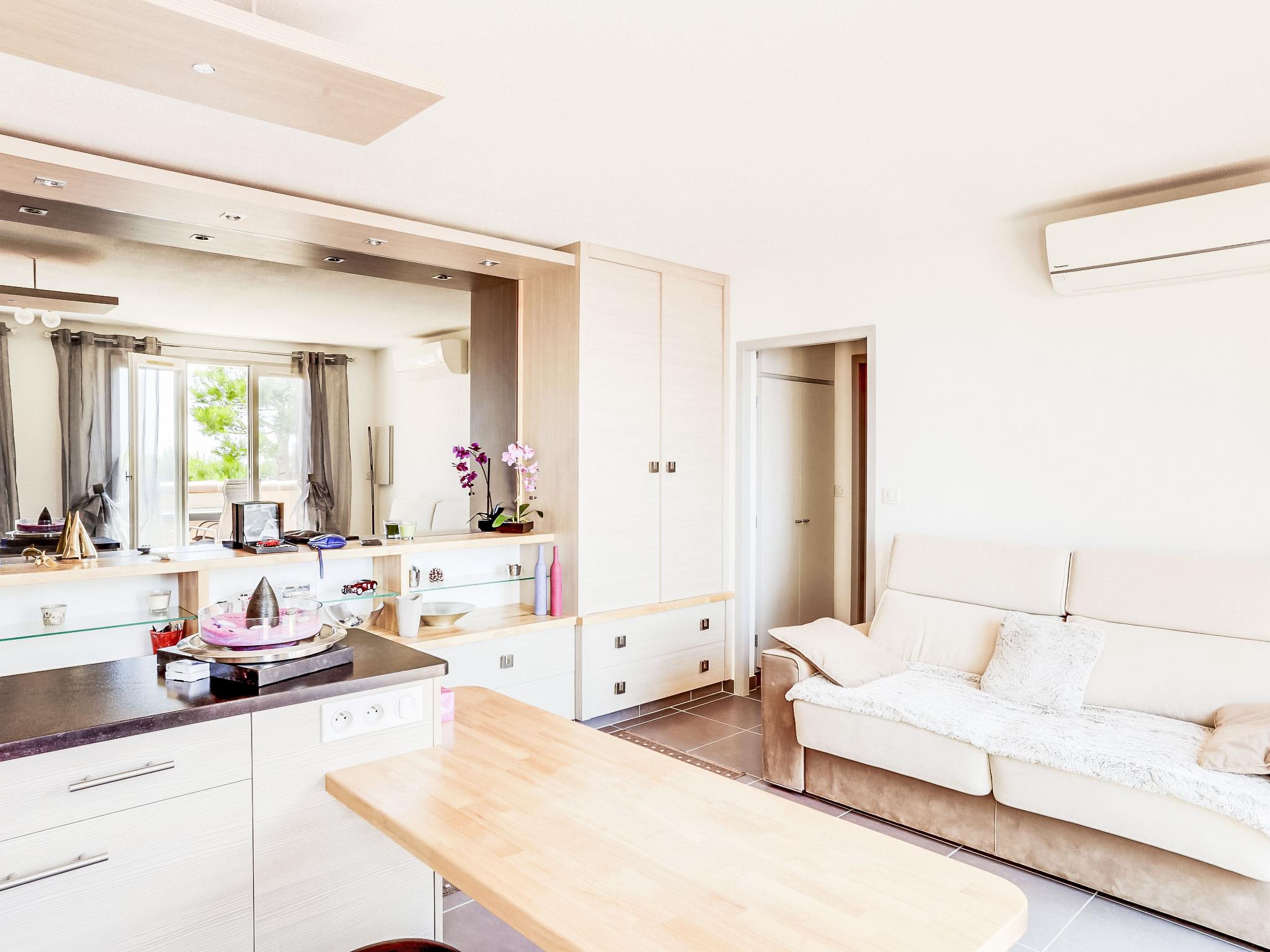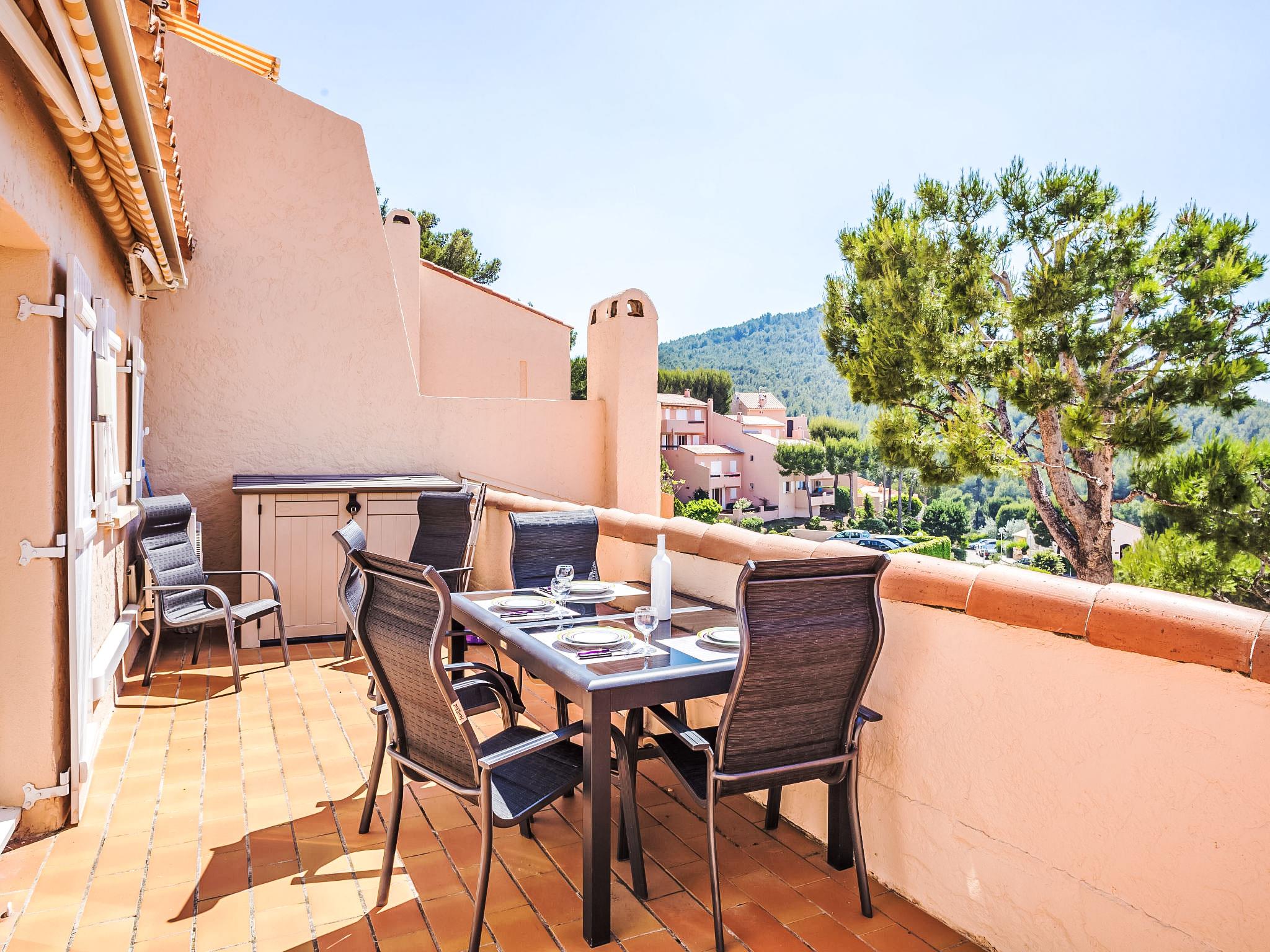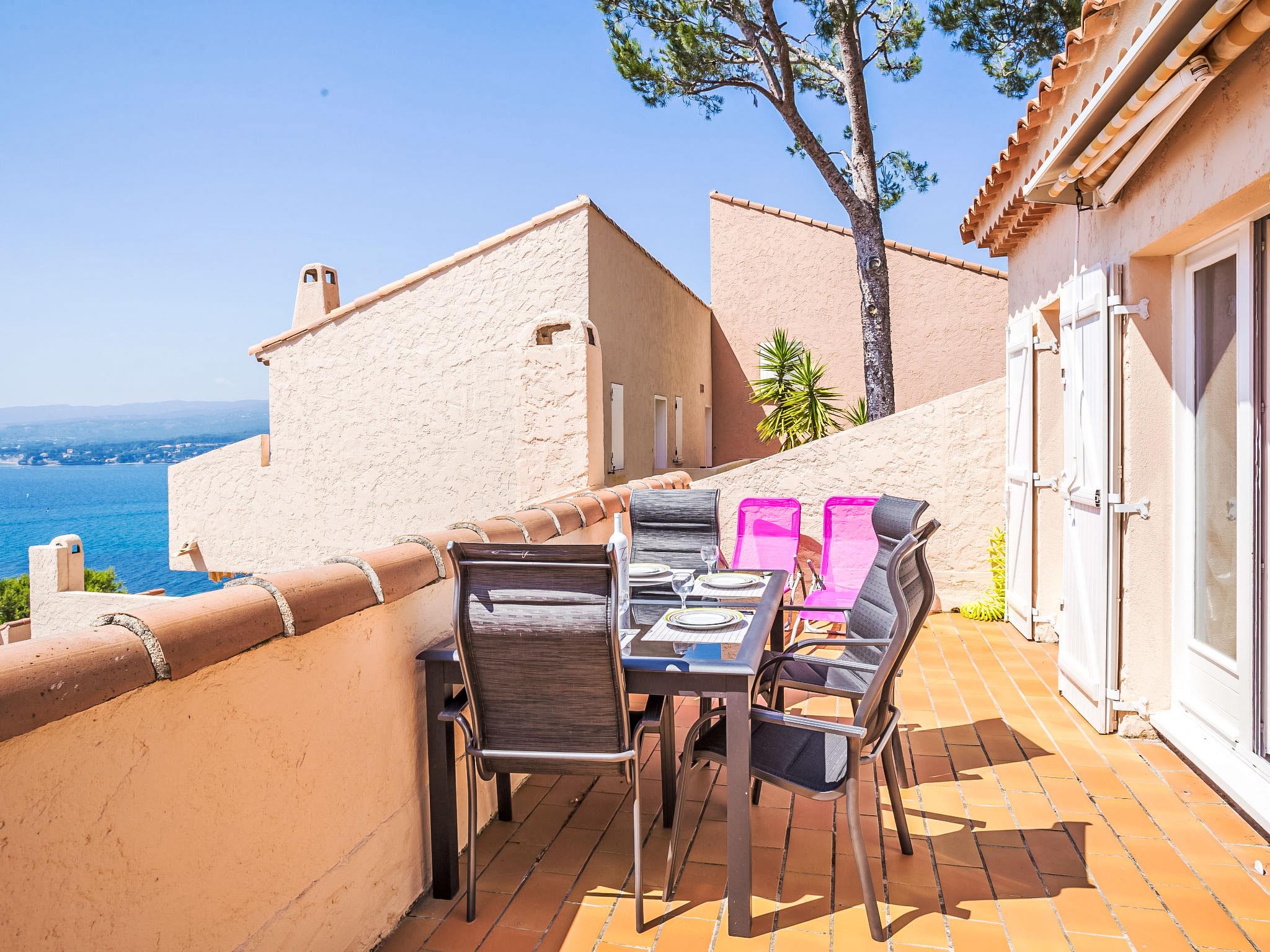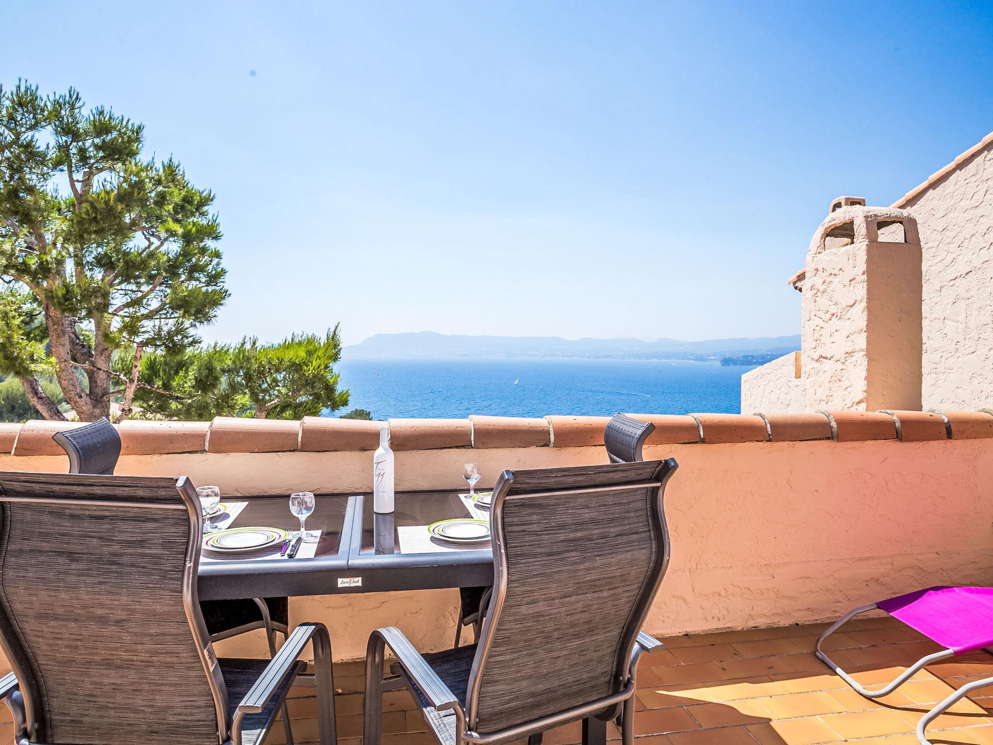 2-room apartment 31 m2, on the upper ground floor. Comfortable and modern furnishings: living/dining room with 1 double sofabed (140 cm, length 190 cm). Exit to the terrace. 1 room with 1 french bed (160 cm, length 200 cm), TV (flat screen). Kitchenette (2 induction hot plates, electric coffee machine, Capsules for coffee machine (senséo) extra, combination microwave). Shower/WC. Air-conditioning, forced-air heating. Terrace 19 m2, west facing position. Terrace furniture. Very beautiful view of the sea. Facilities: washing machine, iron. Internet (WiFi, extra). Parking space n 66. Please note: parking space for small car only. TV only FR. Smoke alarm. 83112 000243 FM