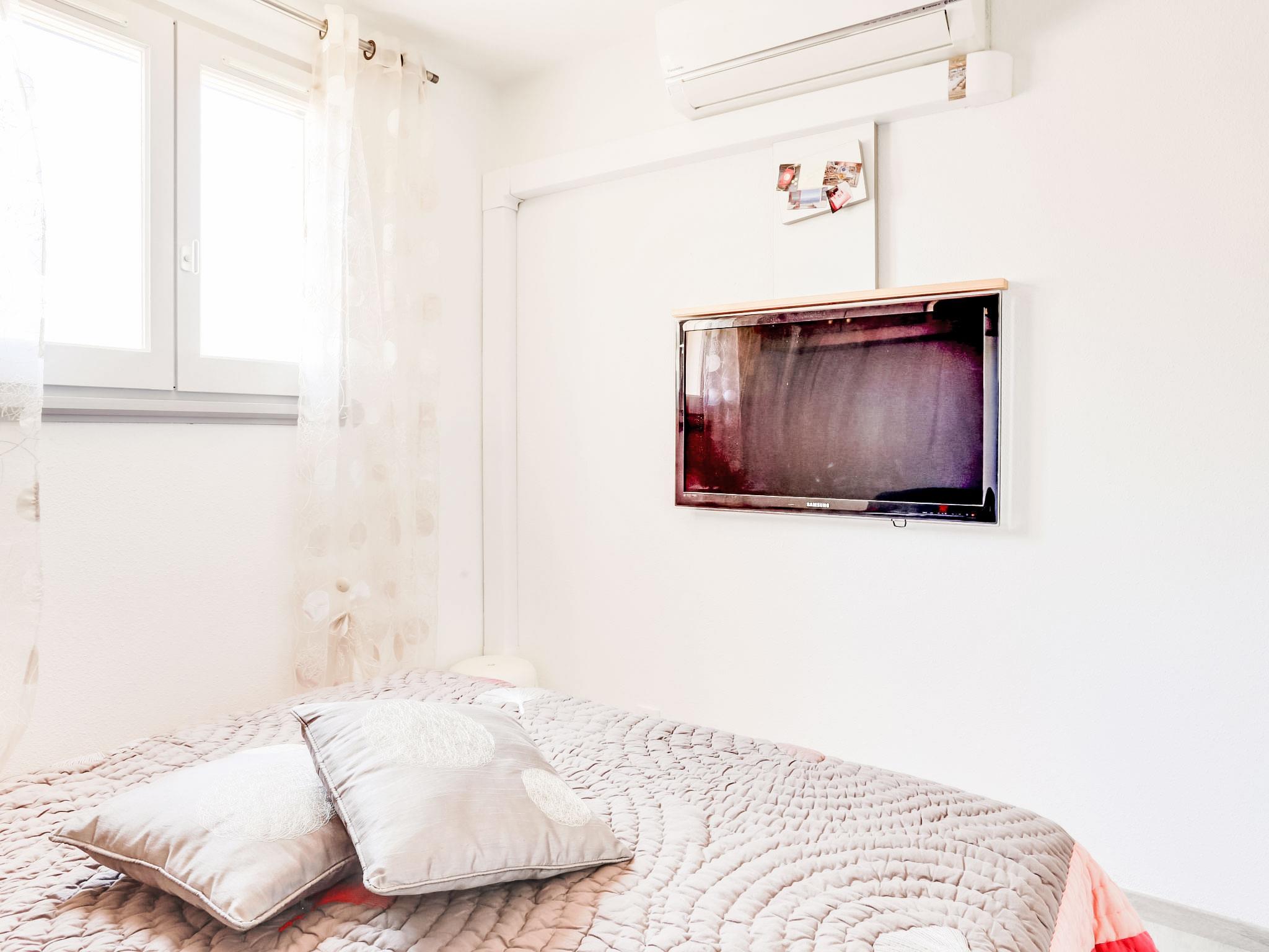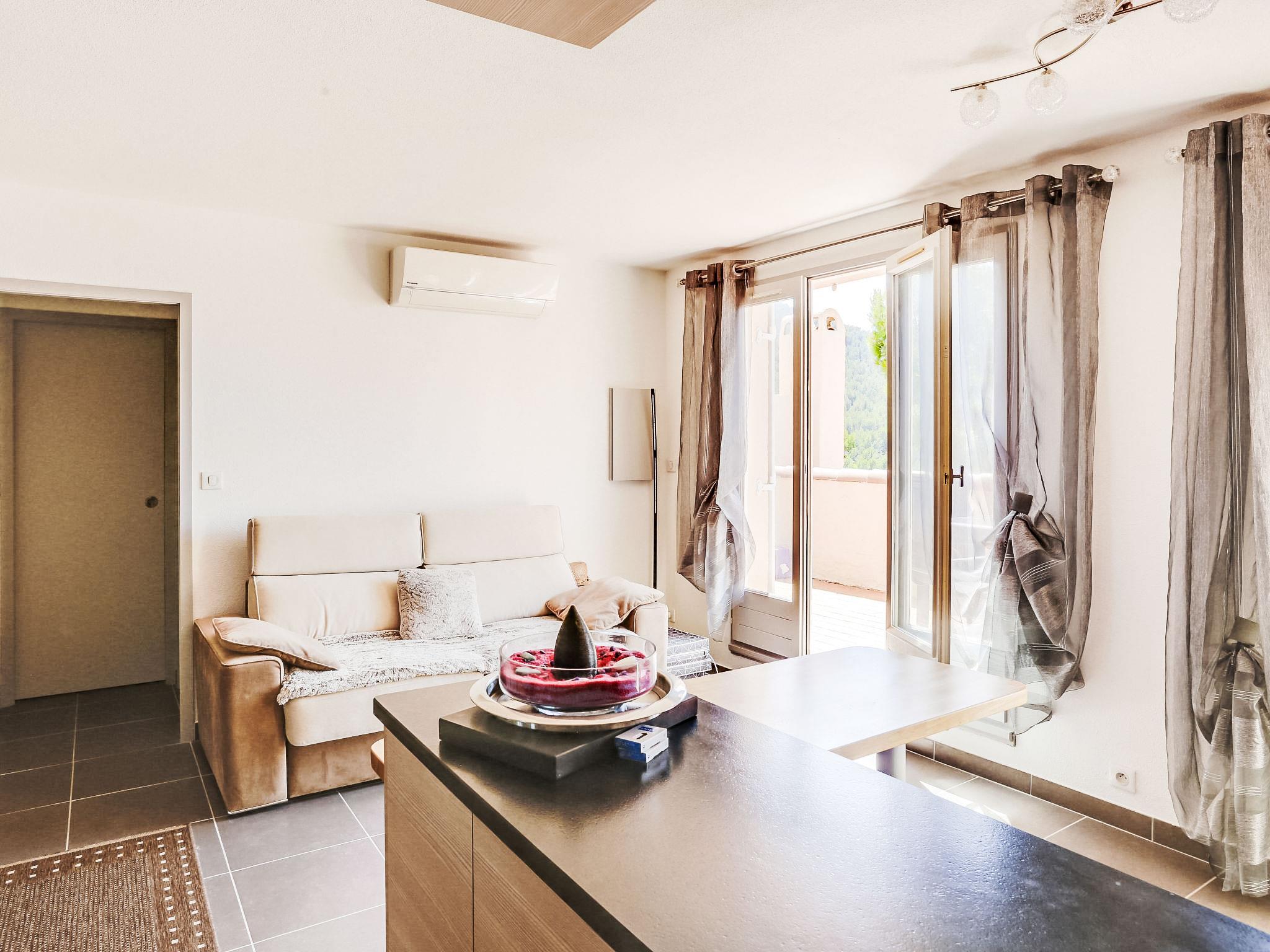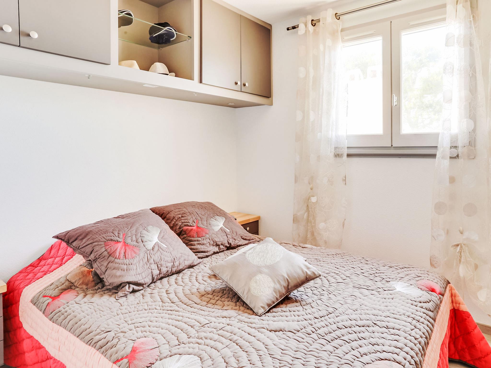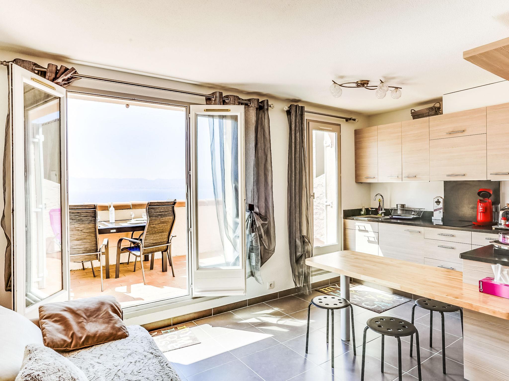 2-room apartment 31 m2, on the upper ground floor. Comfortable and modern furnishings: living/dining room with 1 double sofabed (140 cm, length 190 cm). Exit to the terrace. 1 room with 1 french bed (160 cm, length 200 cm), TV (flat screen). Kitchenette (2 induction hot plates, electric coffee machine, Capsules for coffee machine (senséo) extra, combination microwave). Shower/WC. Air-conditioning, forced-air heating. Terrace 19 m2, west facing position. Terrace furniture. Very beautiful view of the sea. Facilities: washing machine, iron. Internet (WiFi, extra). Parking space n 66. Please note: parking space for small car only. TV only FR. Smoke alarm. 83112 000243 FM