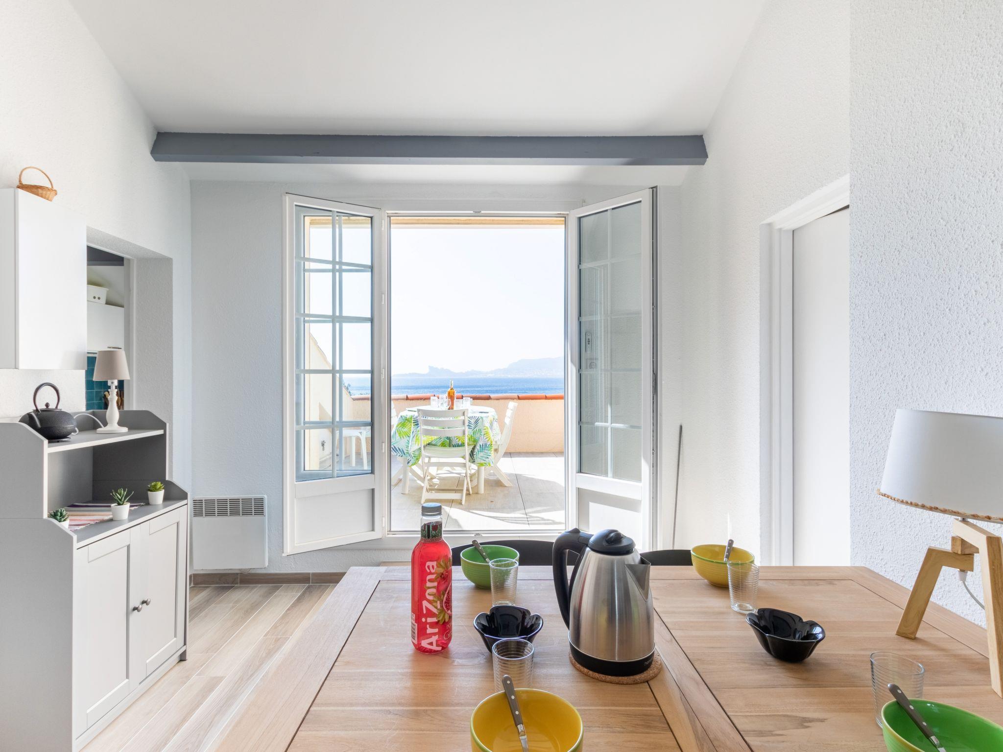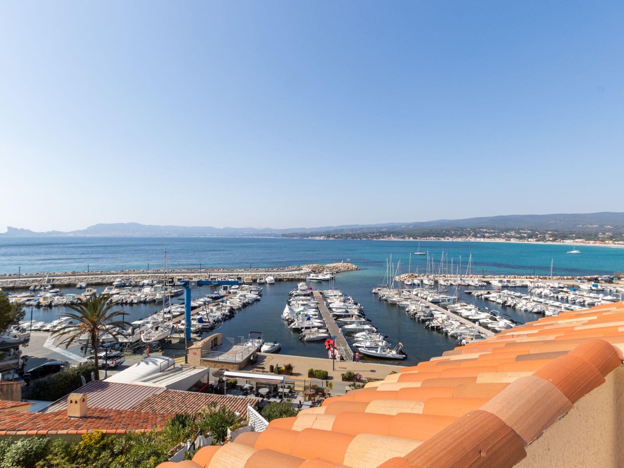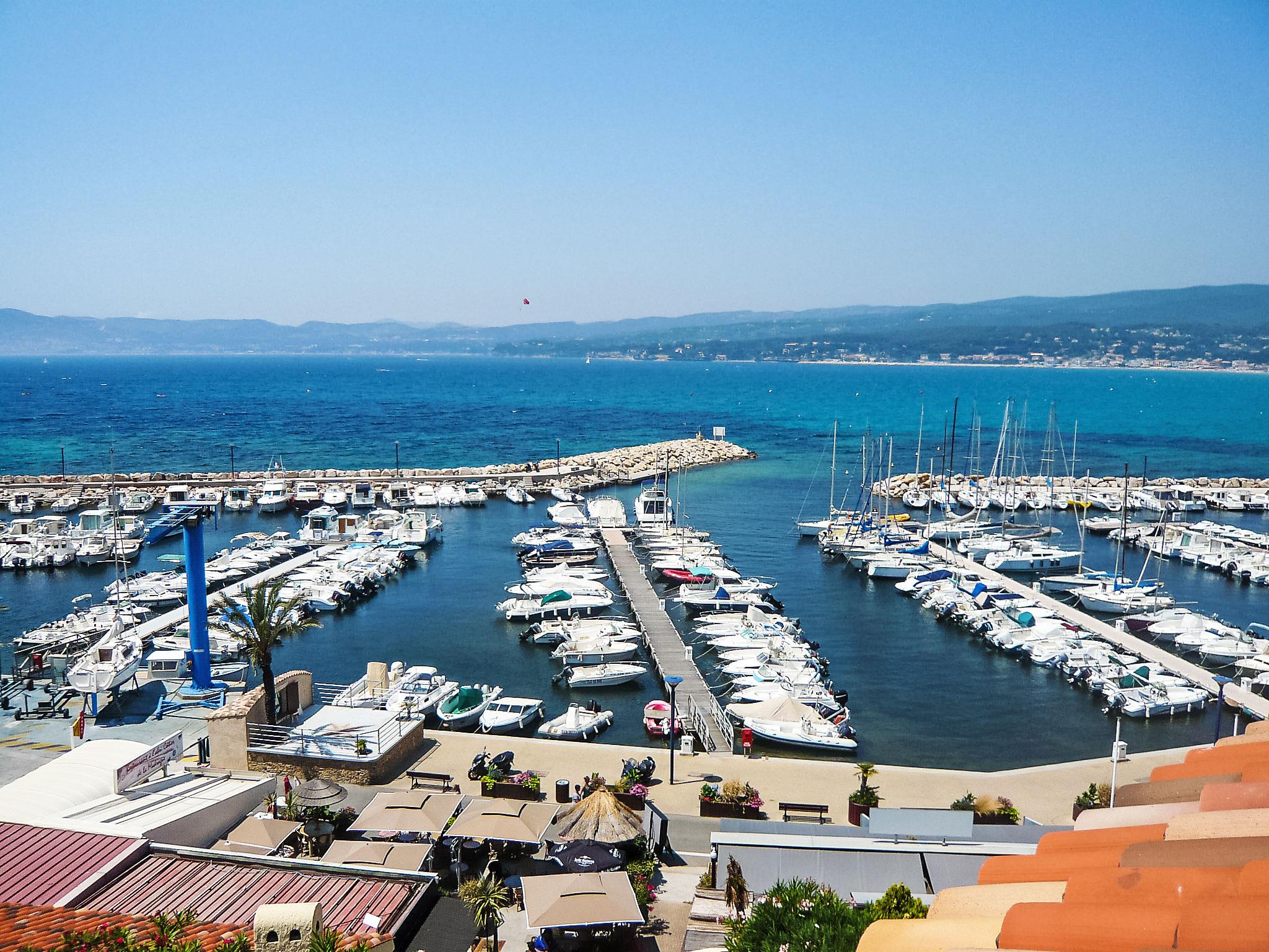 3-room apartment 52 m2 on 2nd floor, west facing position. Renovated in 2022, comfortable and beautiful furnishings: living/dining room with TV (flat screen), electric heater and air conditioning. Exit to the terrace. 1 room with sloping ceilings, ceiling height 150 - 300 cm with 2 beds (80 cm, length 190 cm), air conditioning. Exit to the terrace. 1 room with sloping ceilings, ceiling height 140 - 260 cm with 1 french bed (140 cm, length 190 cm), electric heater and fan. Kitchen (oven, dishwasher, 4 ceramic glass hob hotplates, toaster, kettle, microwave, freezer, electric coffee machine, Capsules for coffee machine (Nespresso + Filtre) extra). Shower, sep. WC. Electric heating. Terrace 12 m2, west facing position. Terrace furniture. Panoramic view of the sea and the port. Facilities: washing machine. Internet (WiFi, extra). Please note: maximum 1 pet/ dog allowed. TV only FR. Smoke alarm, no lift. Underground car park (dimensions: width 2.3m, height 1.9m, lenght 4.75m) in another residence, located 50m away. 83112 000271 RX