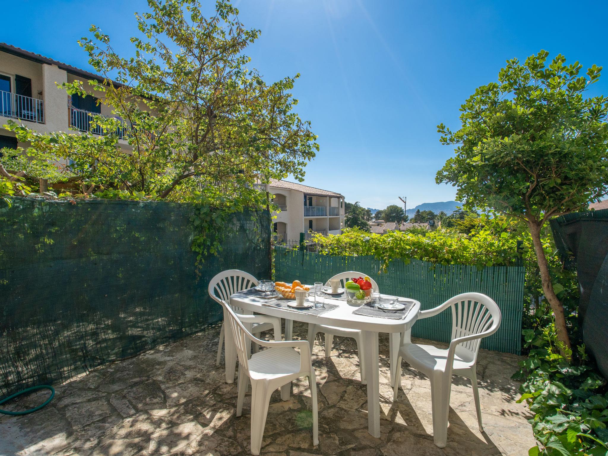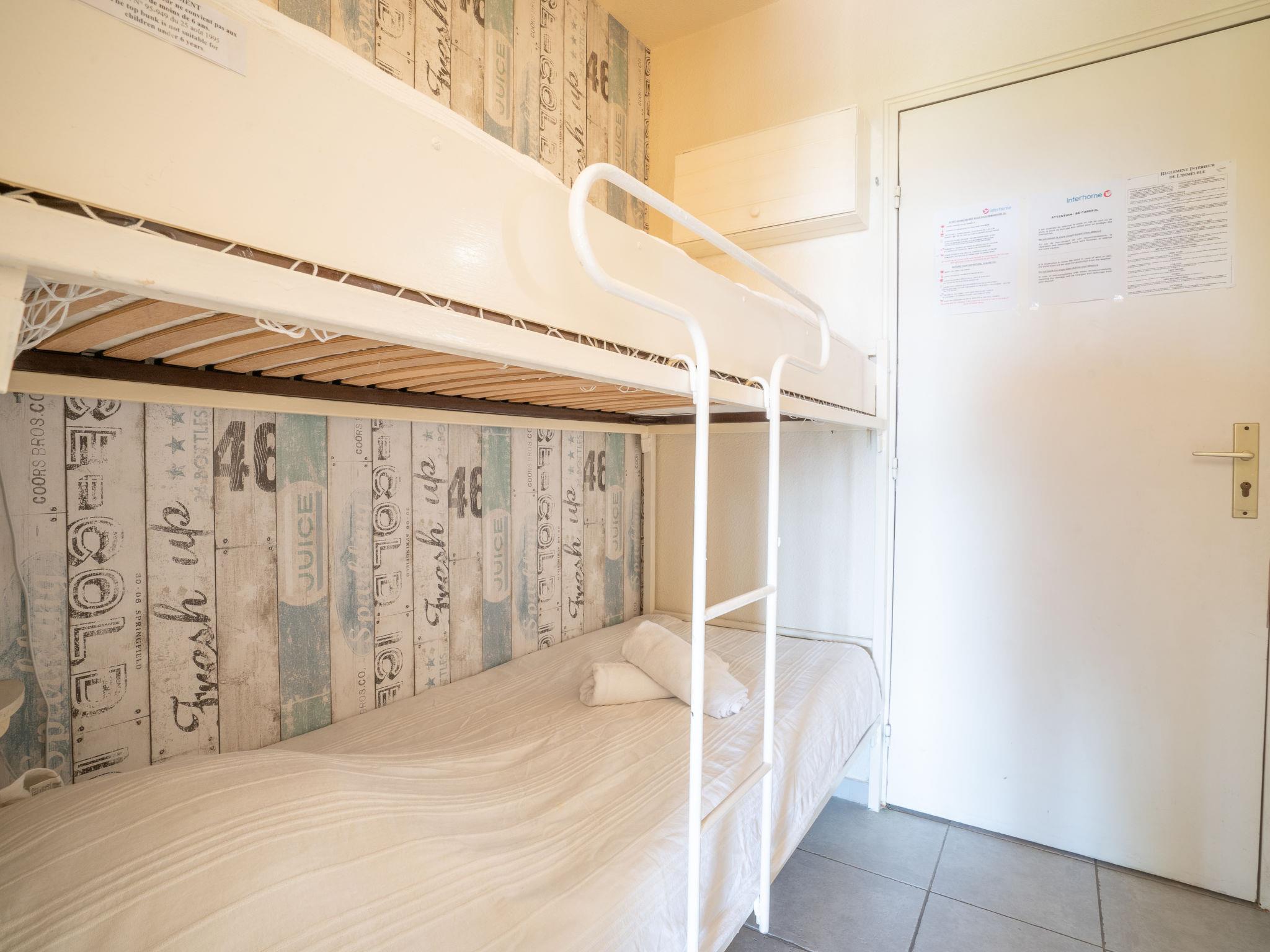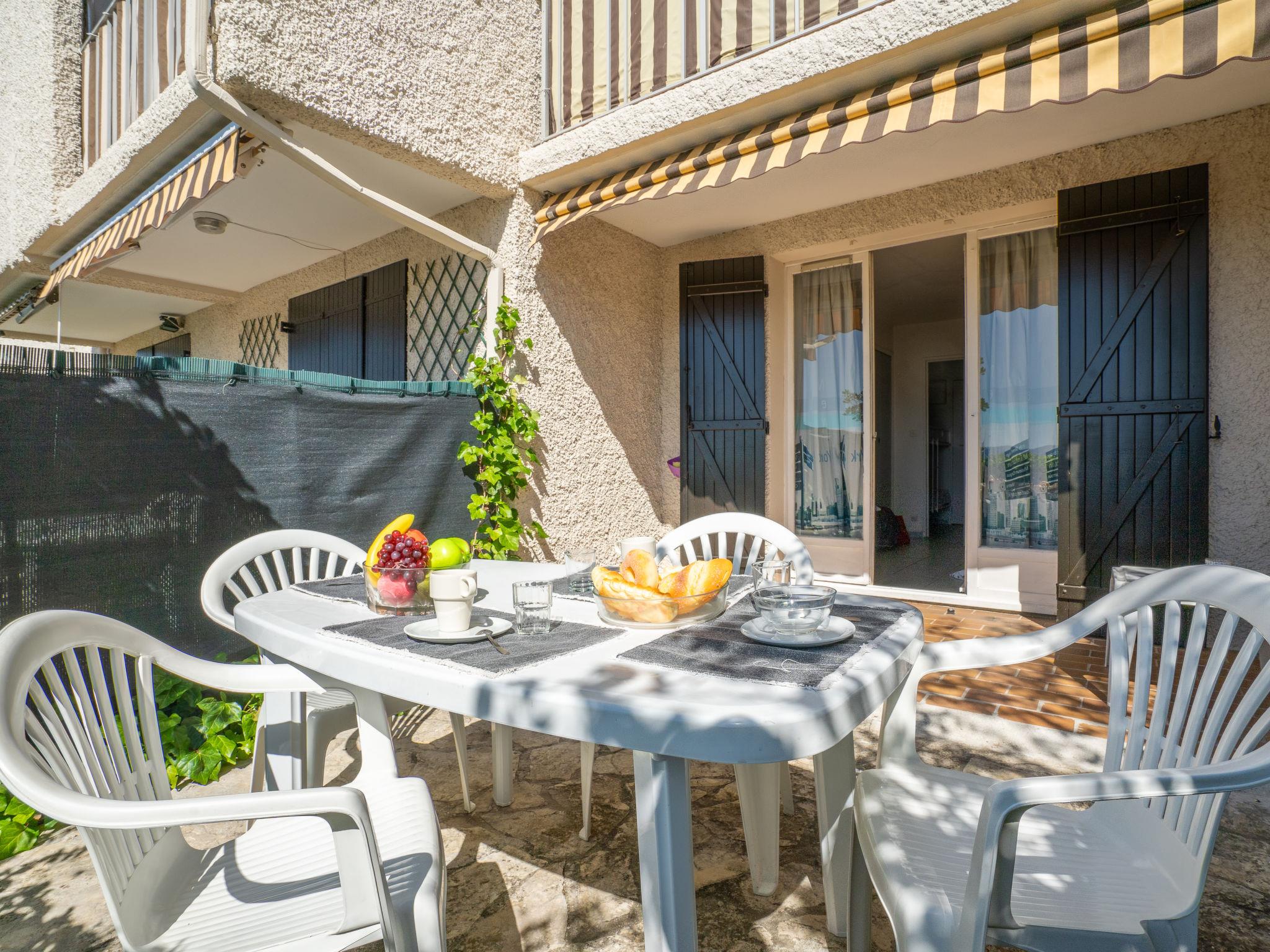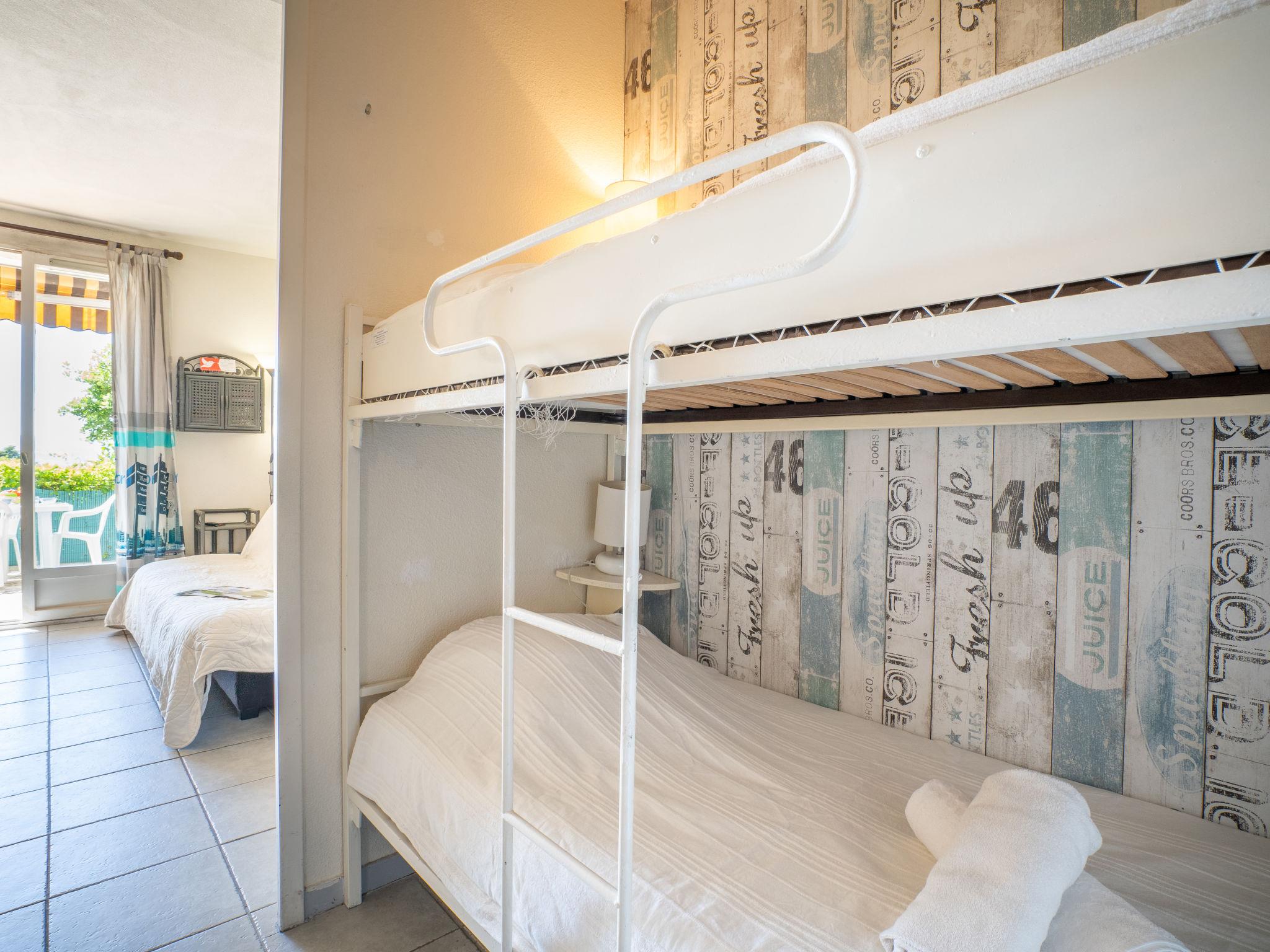 1-room apartment 22 m2, on the upper ground floor. Practical and comfortable furnishings: entrance hall, without window with 1 x 2 bunk beds (80 cm, length 190 cm). Living/dining room with 1 double sofabed (140 cm, length 190 cm), TV. Exit to the terrace. Kitchenette (2 ceramic glass hob hotplates, kettle, microwave, freezer, electric coffee machine). Shower/WC. Electric heating. Terrace 15 m2 partly roofed, south-west facing position. Terrace furniture. View of the sea. Facilities: washing machine. Internet (WiFi, extra). Parking space n 935. Please note: TV only FR. Smoke alarm. Please note: The building is accessed by steps. 83112 000252 1X
