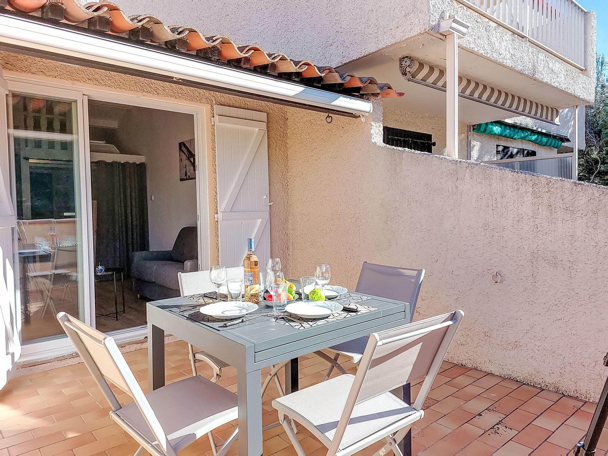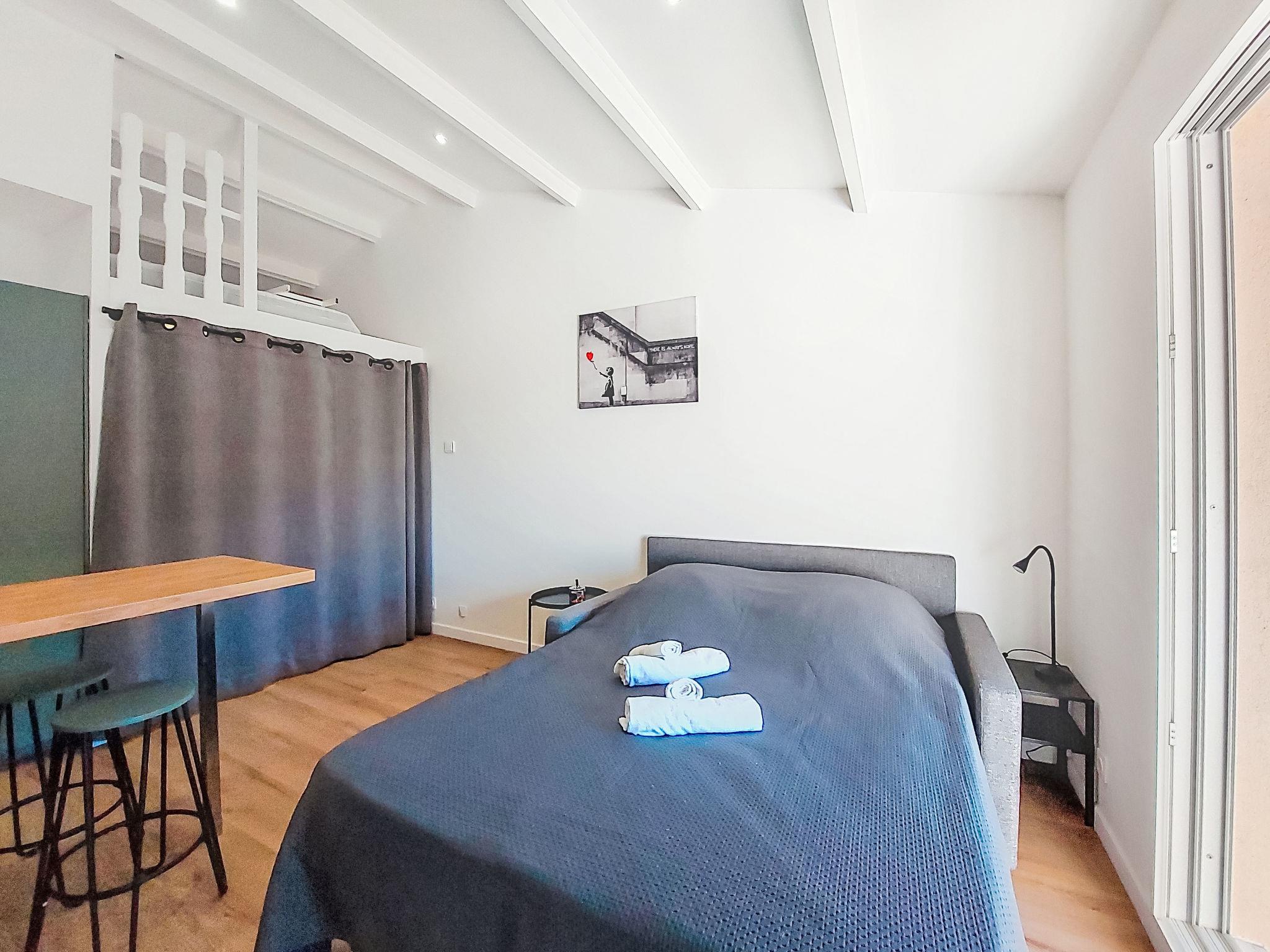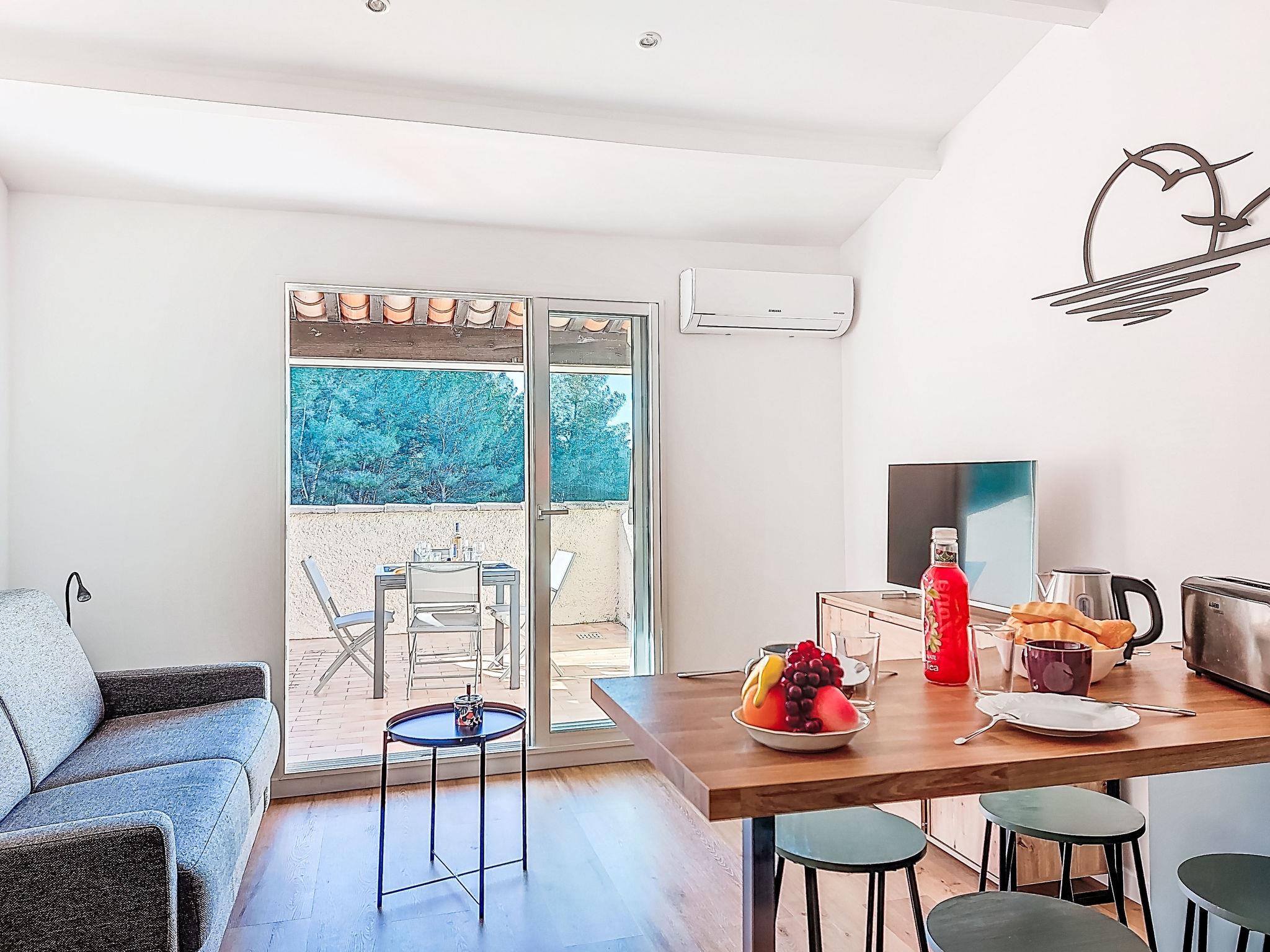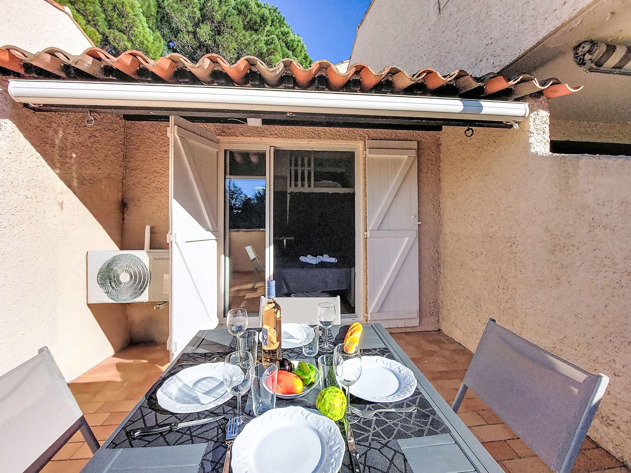 1-room studio 28 m2 on 2nd floor. Renovated in 2025, comfortable and beautiful furnishings: entrance hall, without window with 1 x 2 bunk beds (80 cm, length 190 cm). Living/dining room with 1 double sofabed (140 cm, length 190 cm), TV (flat screen). Exit to the terrace. Kitchenette (dishwasher, 4 induction hot plates, toaster, kettle, microwave, electric coffee machine, Capsules for coffee machine (Nespresso) extra). Shower/WC. Air-conditioning, forced-air heating. Large terrace 15 m2 partly roofed, west facing position. Terrace furniture. Distant view of the sea. Facilities: washing machine. Internet (WiFi, extra). Parking space n 816 (1 car). Please note: TV only FR. Smoke alarm. Offer by a private individual according to Art. 155, IV of CGI. 83112001849LR